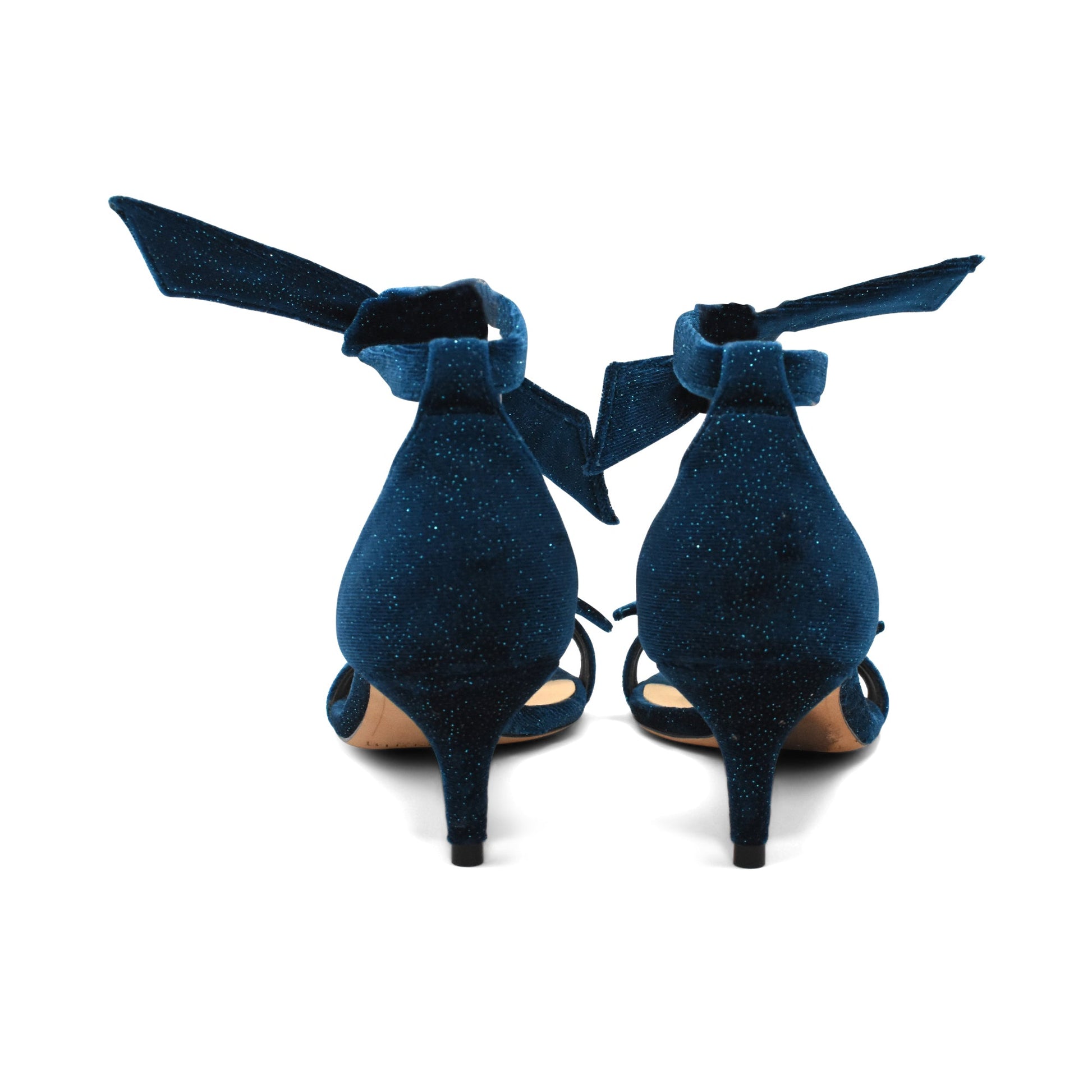 Alexandre Birman 'Clarita' heeled sandals in sparkly dark blue velvet with knotted toe straps and self tie ankle straps.