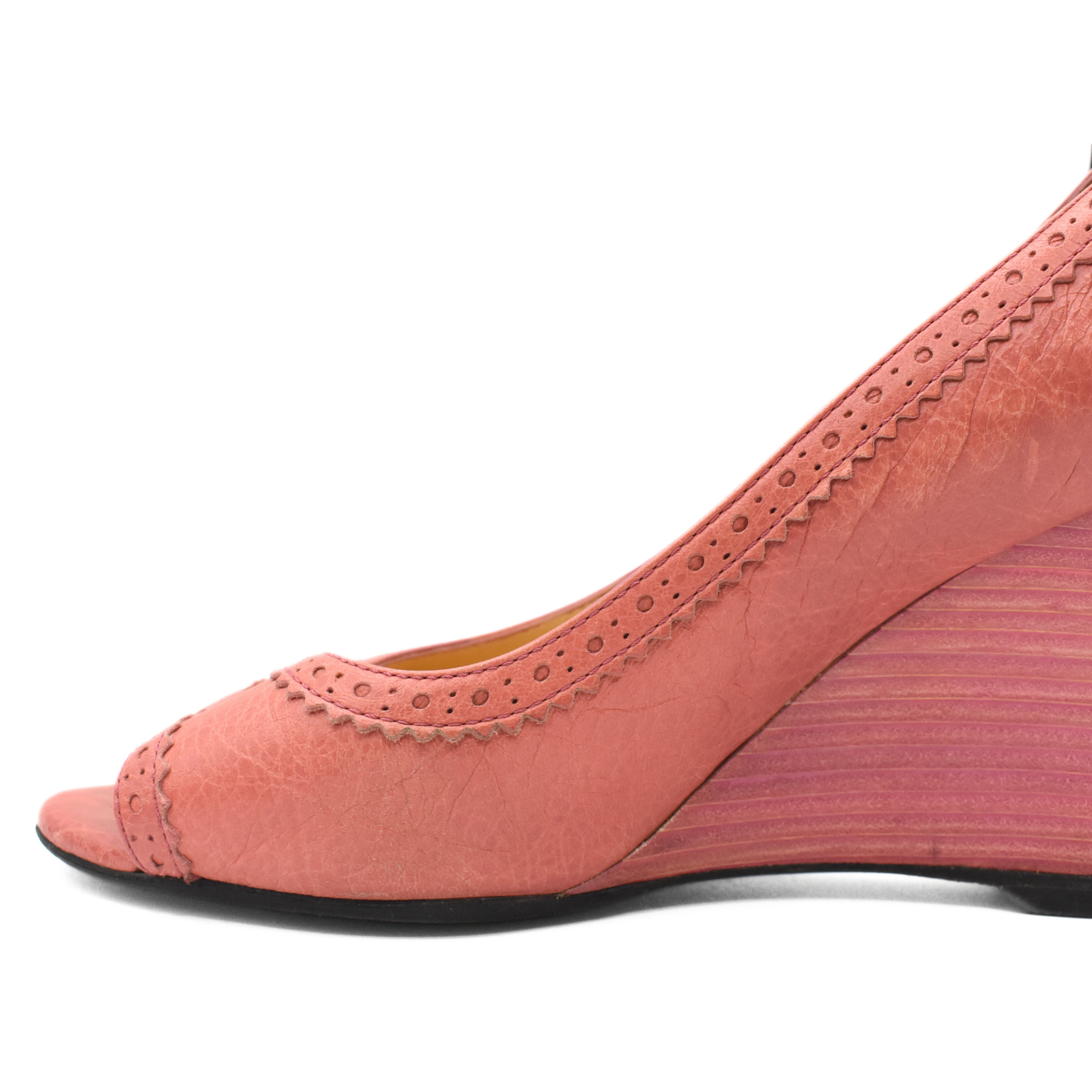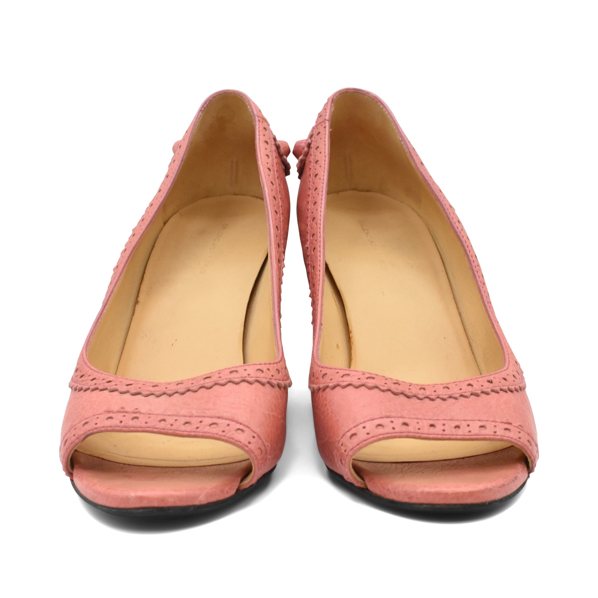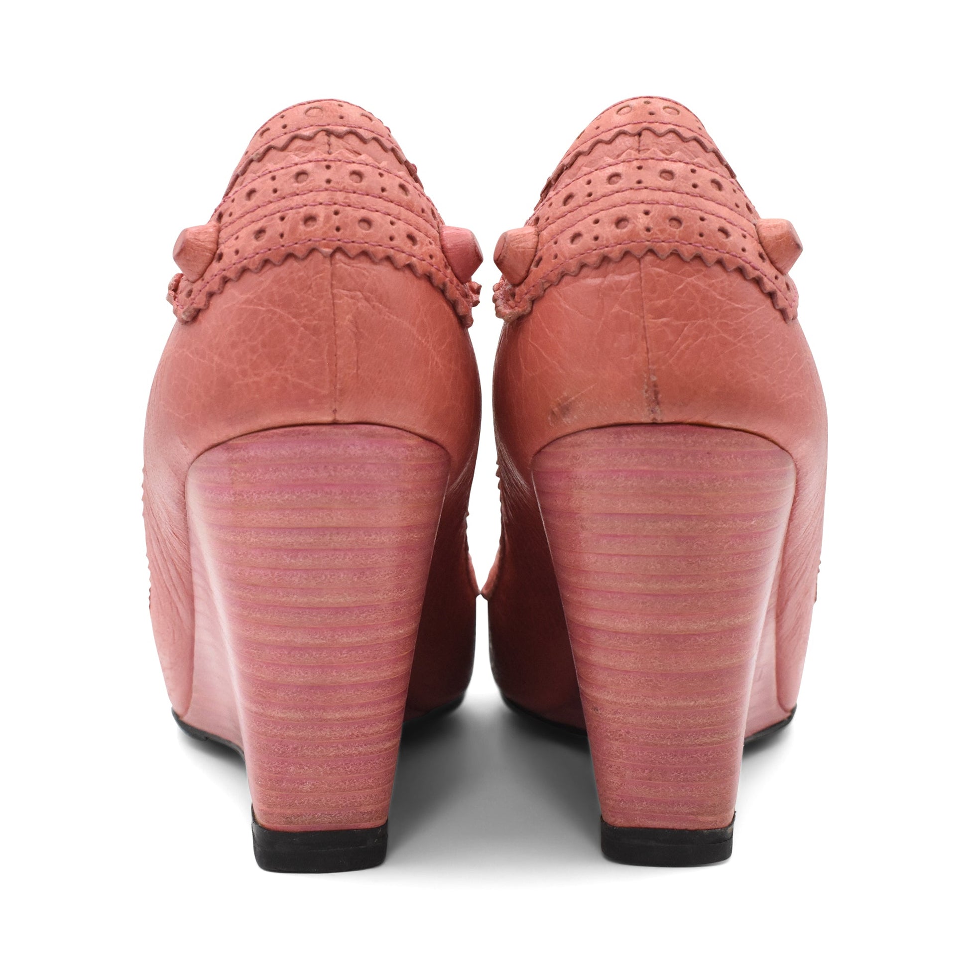 Balenciaga 'Arena' peep toe wedges in dusty pink crinkled leather with brogue detailing, leather covered Arena hardware, and pink stacked wood wedge heels.