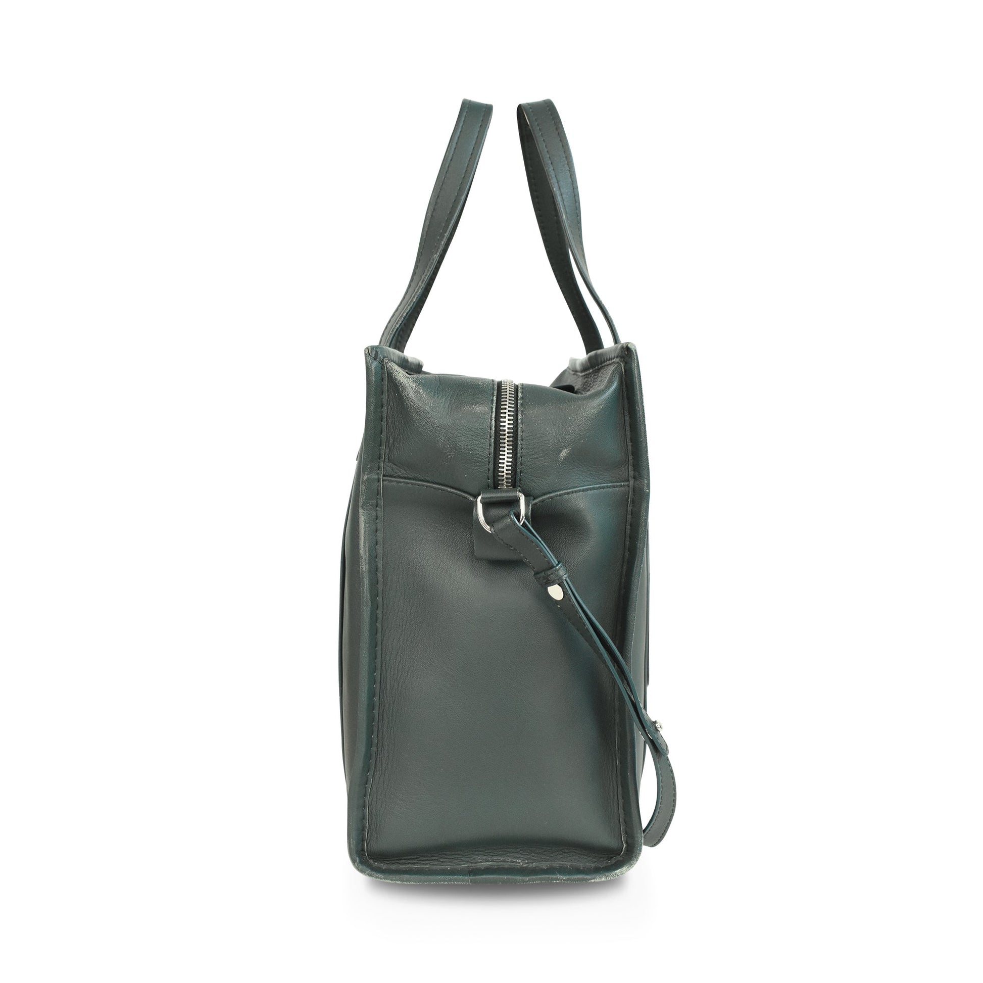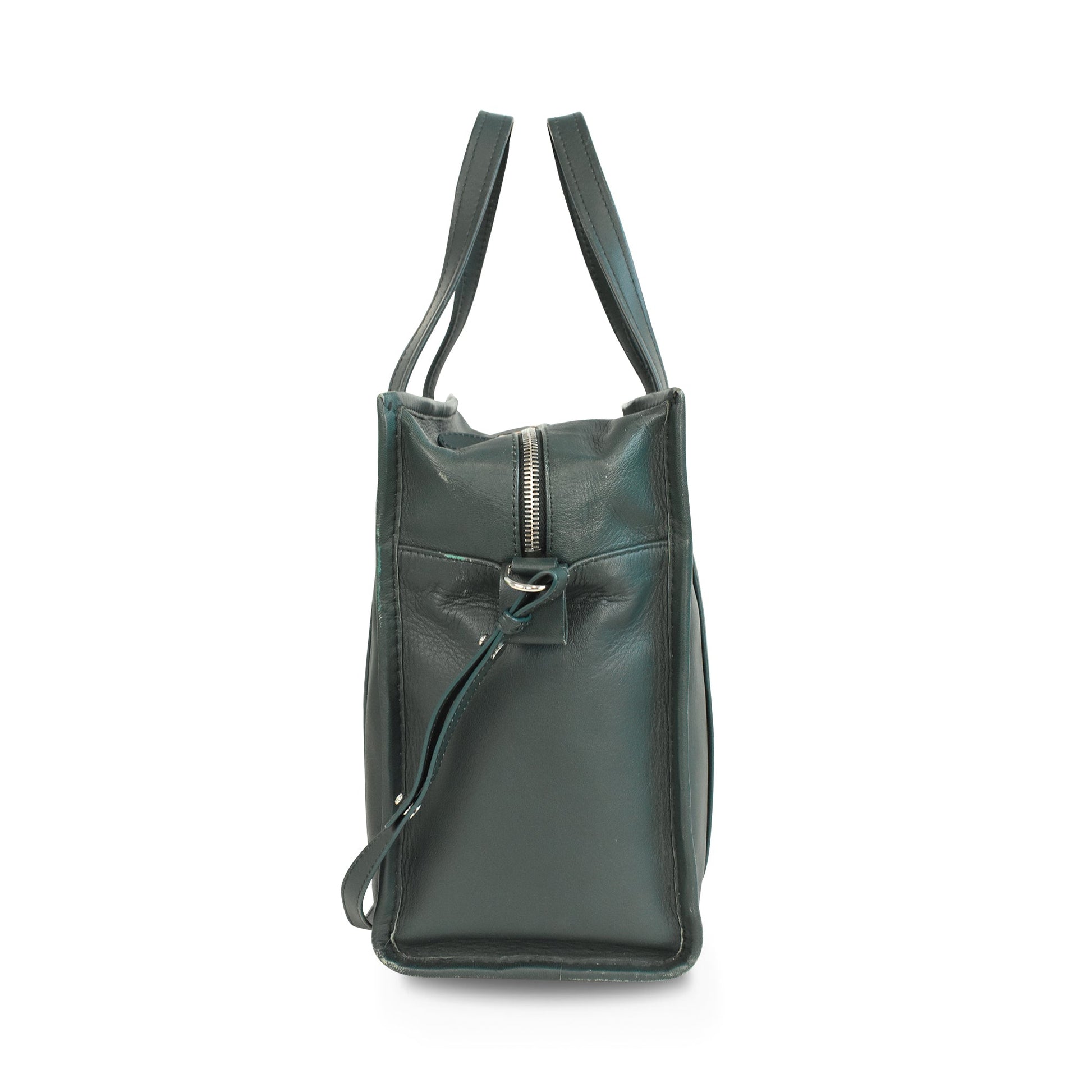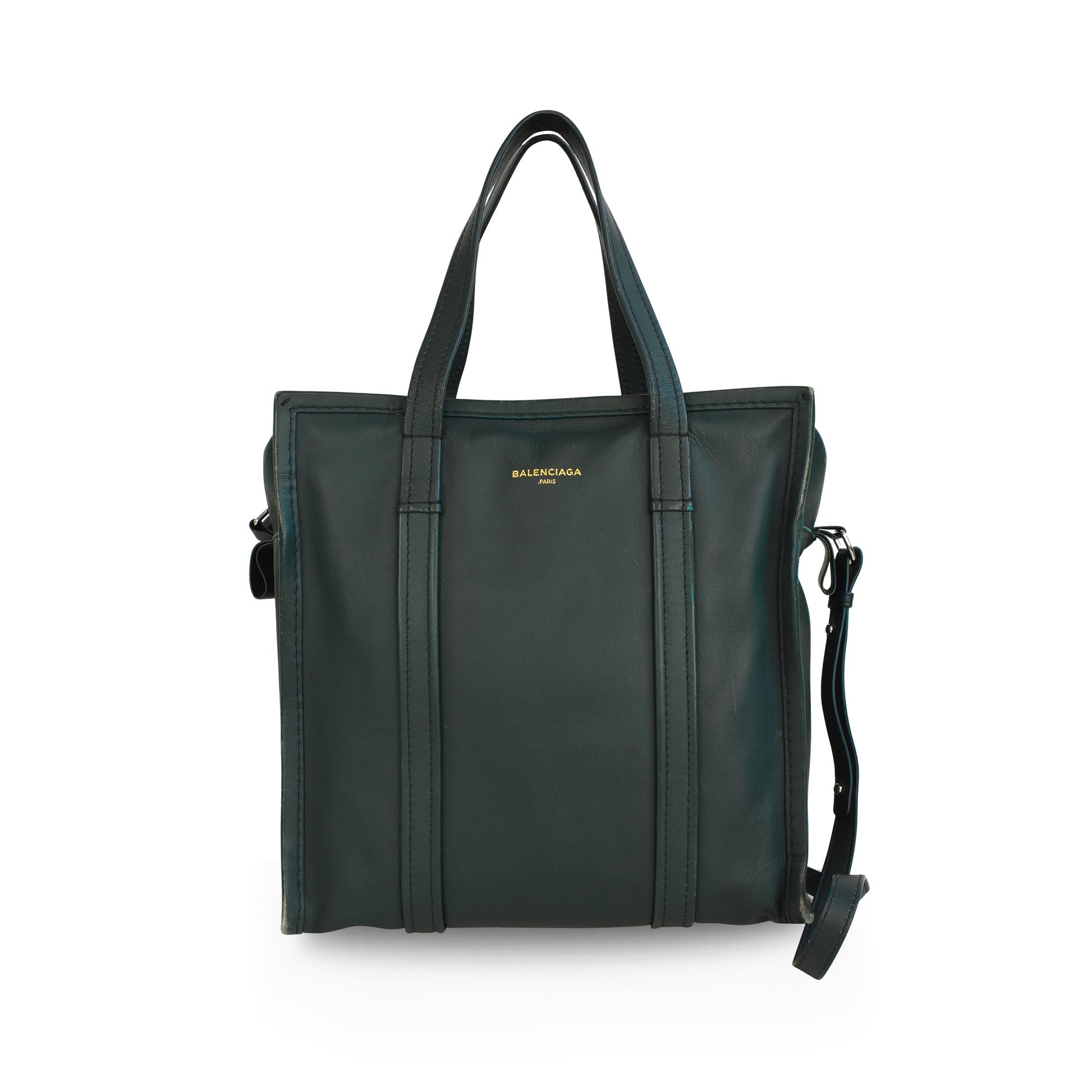 Balenciaga 'Bazar Shopper S' bag in smooth dark green leather with gold foil logo print and silver hardware. Features flat top handles and a removable shoulder strap. The bag has a two-way zip closure and black fabric lining with slip and zip pockets.