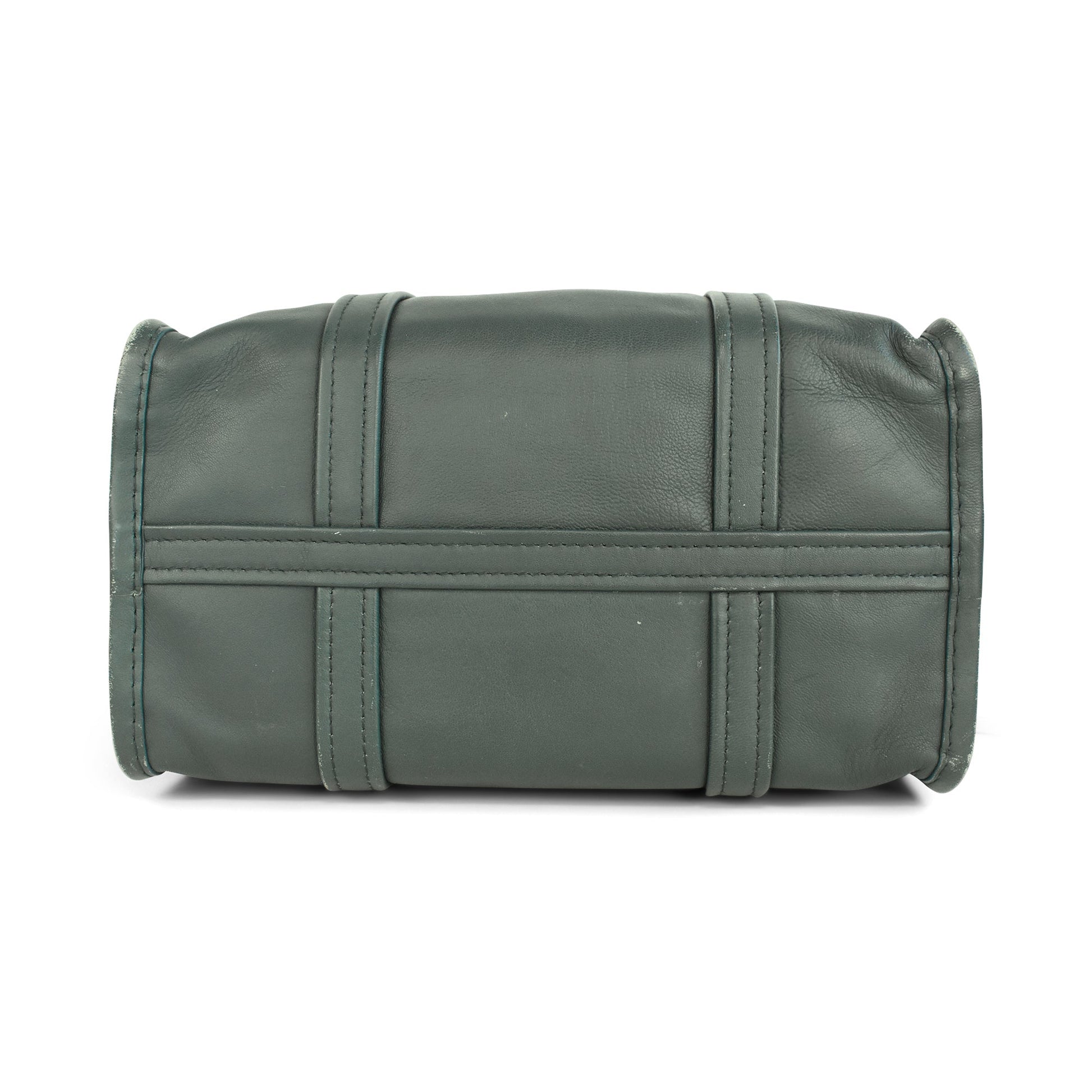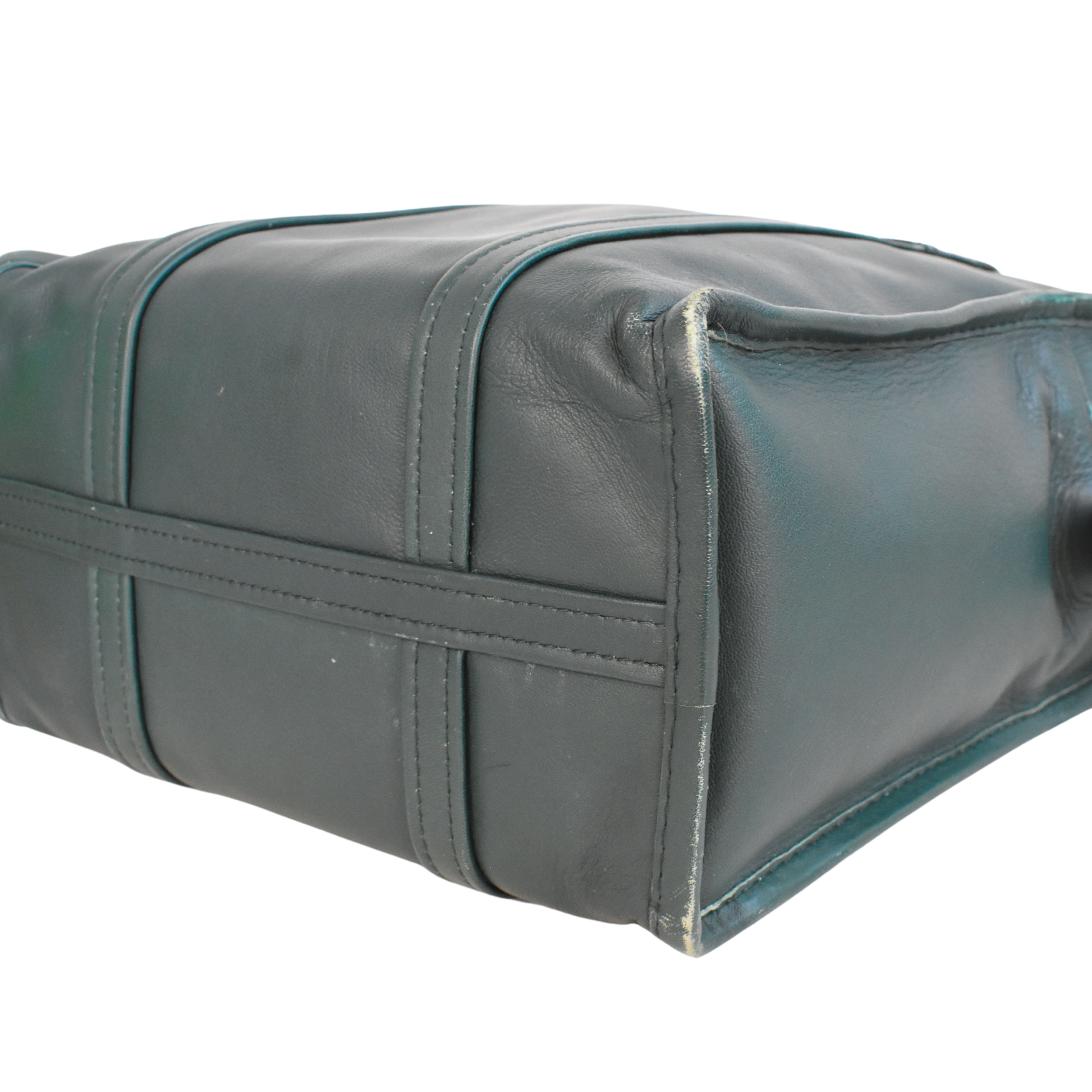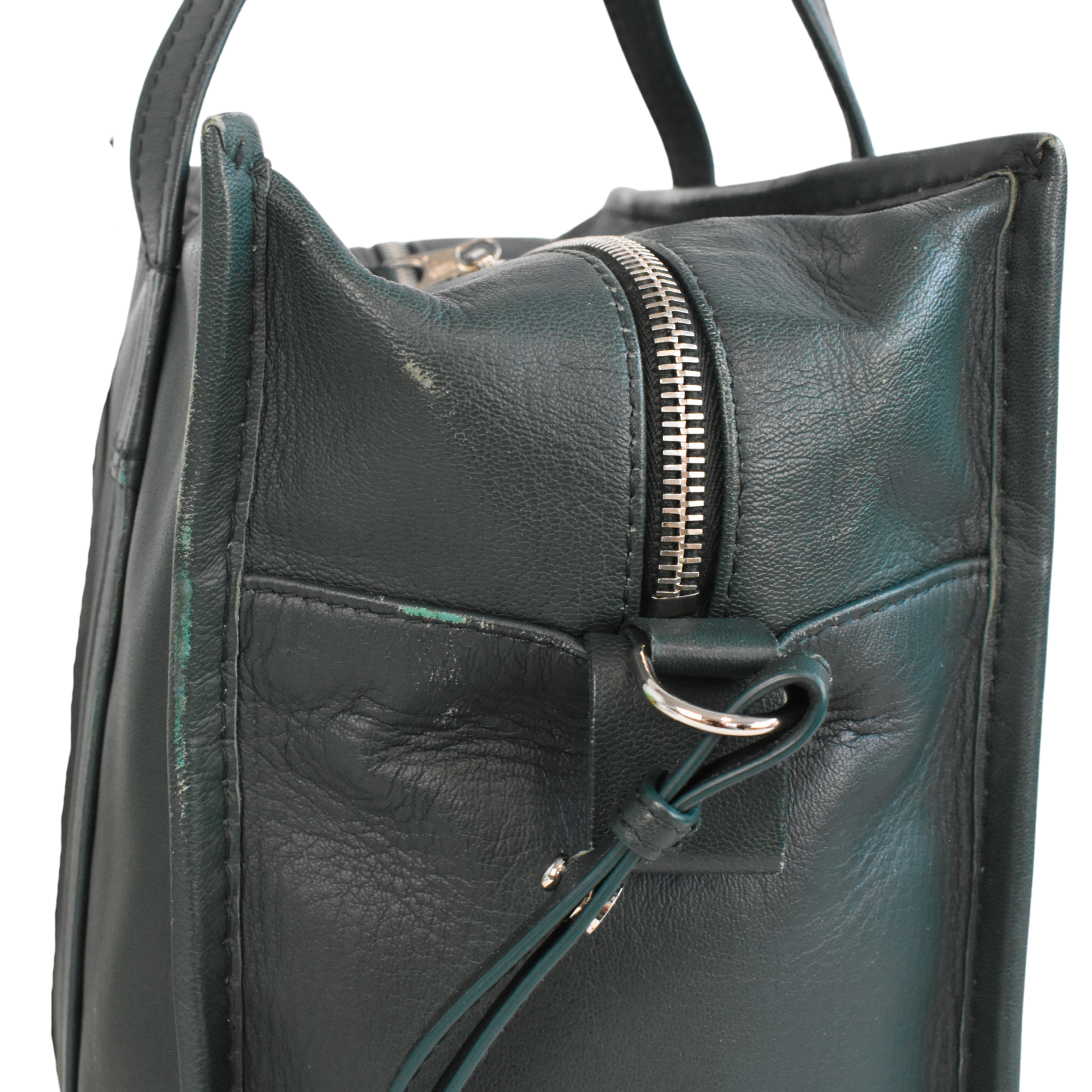 Balenciaga 'Bazar Shopper S' bag in smooth dark green leather with gold foil logo print and silver hardware. Features flat top handles and a removable shoulder strap. The bag has a two-way zip closure and black fabric lining with slip and zip pockets.