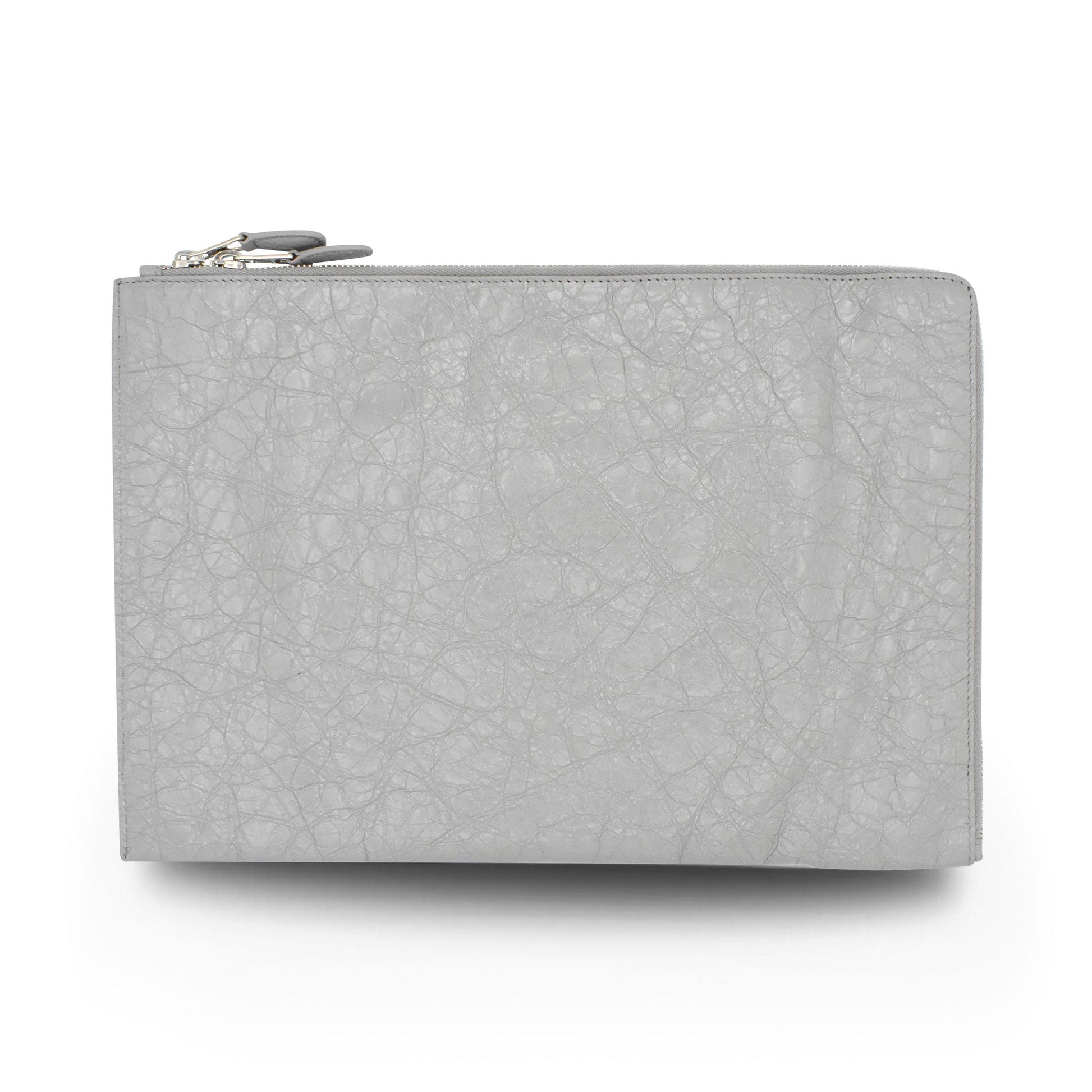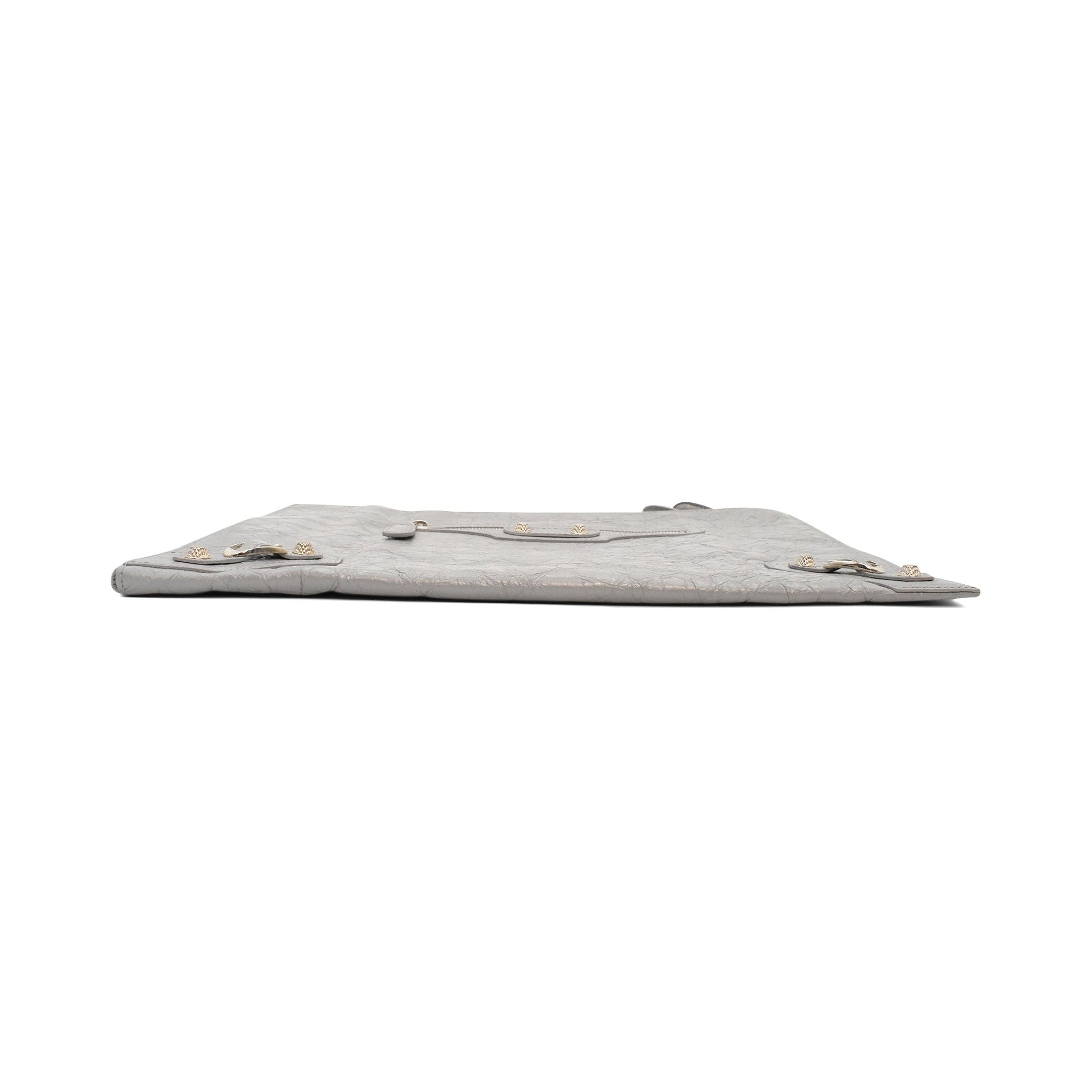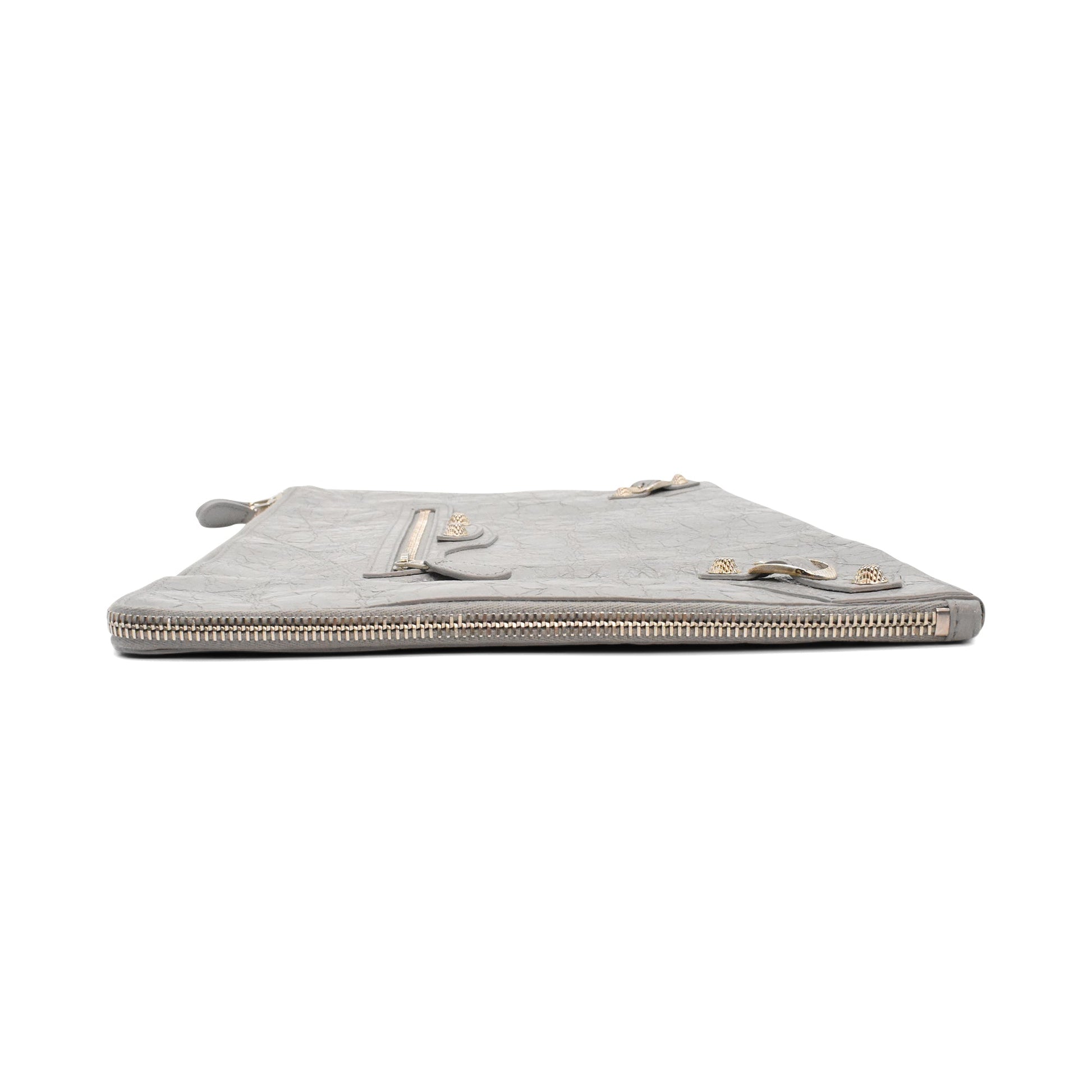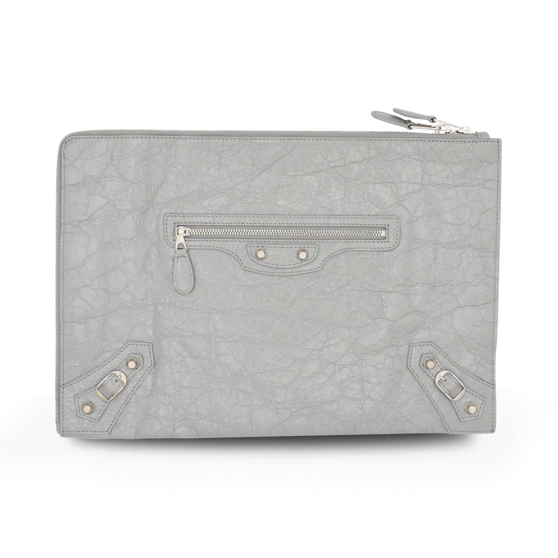 Balenciaga 'City' moto clutch in grey leather with a zip-around opening in silver hardware, a front zip pocket, and signature moto stud detailing throughout. The bag has a black canvas inner lining with a slip pocket.