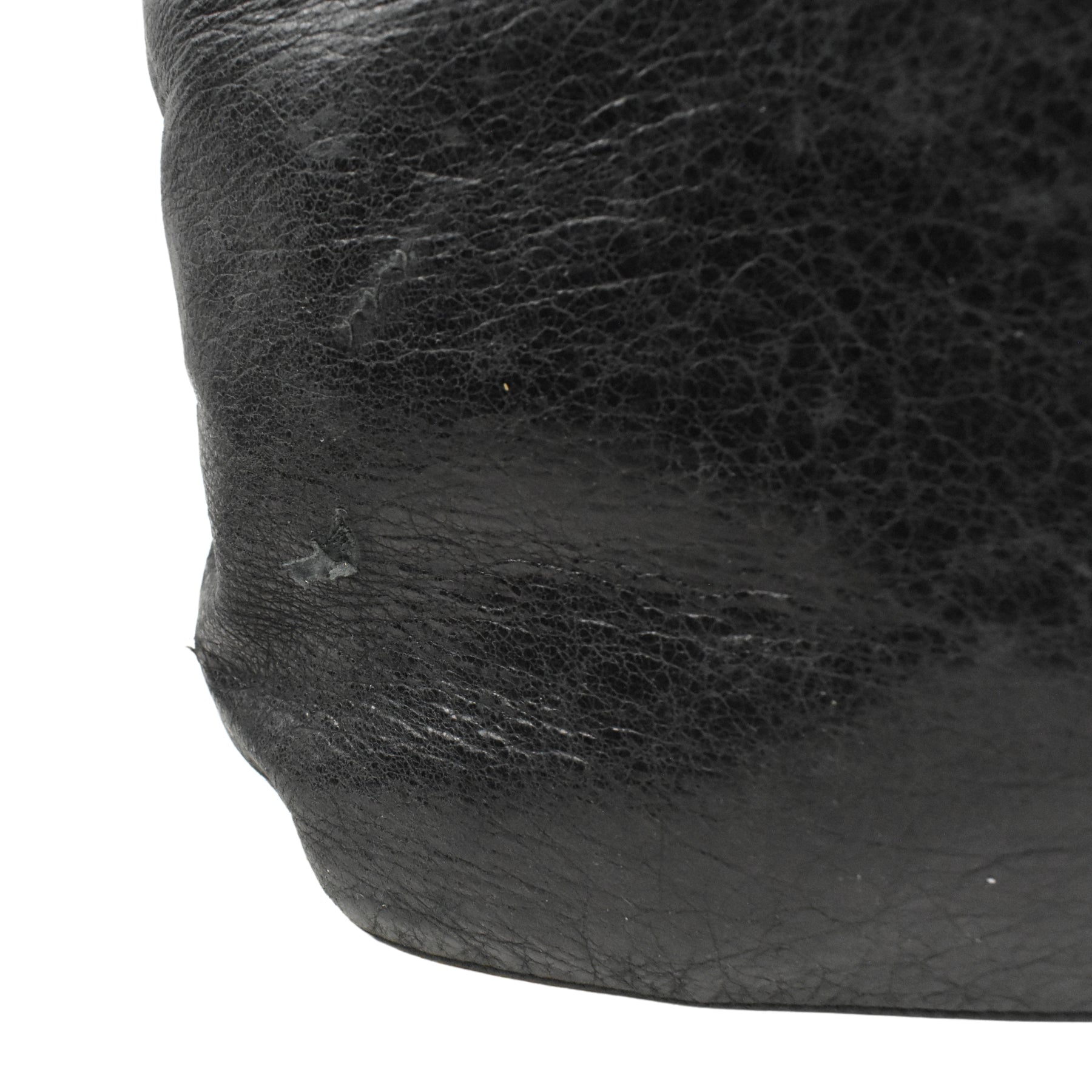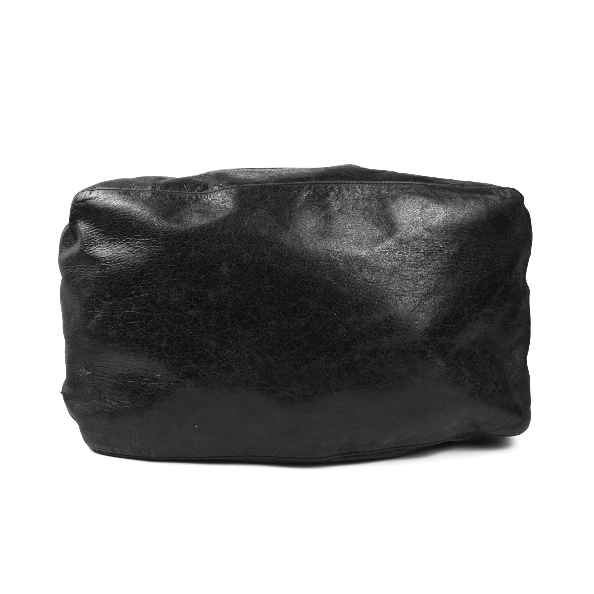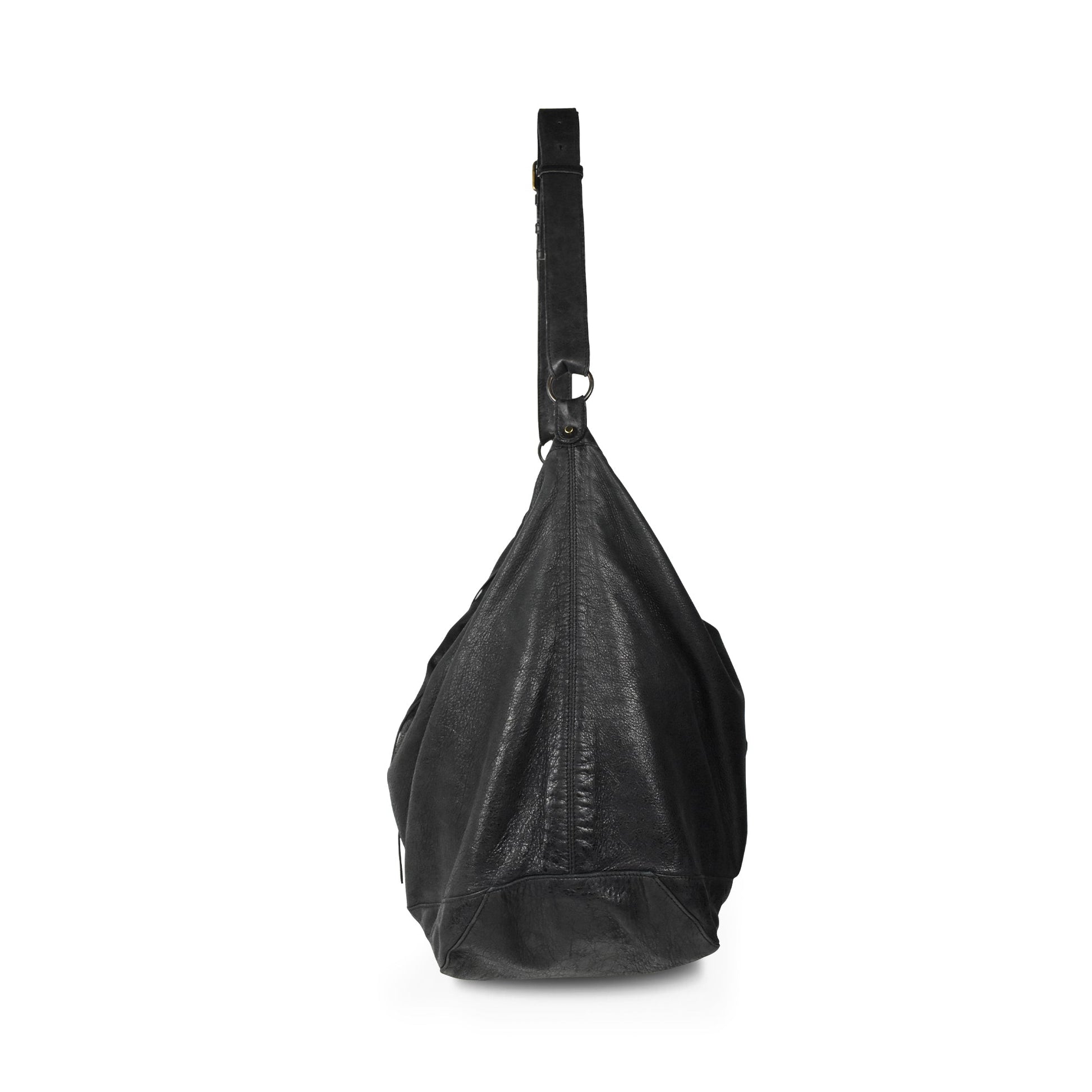 Balenciaga 'Courier' hobo bag in black soft leather with an adjustable shoulder strap and brushed gold hardware. Features a front zip pocket, elongated leather zipper pulls, and front studs. The interior is black cotton lined with a zip pocket.