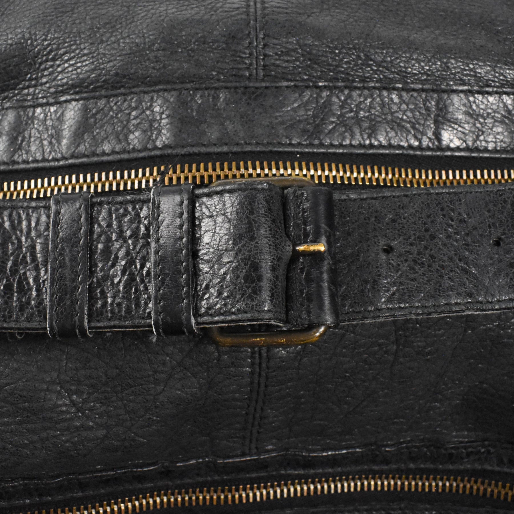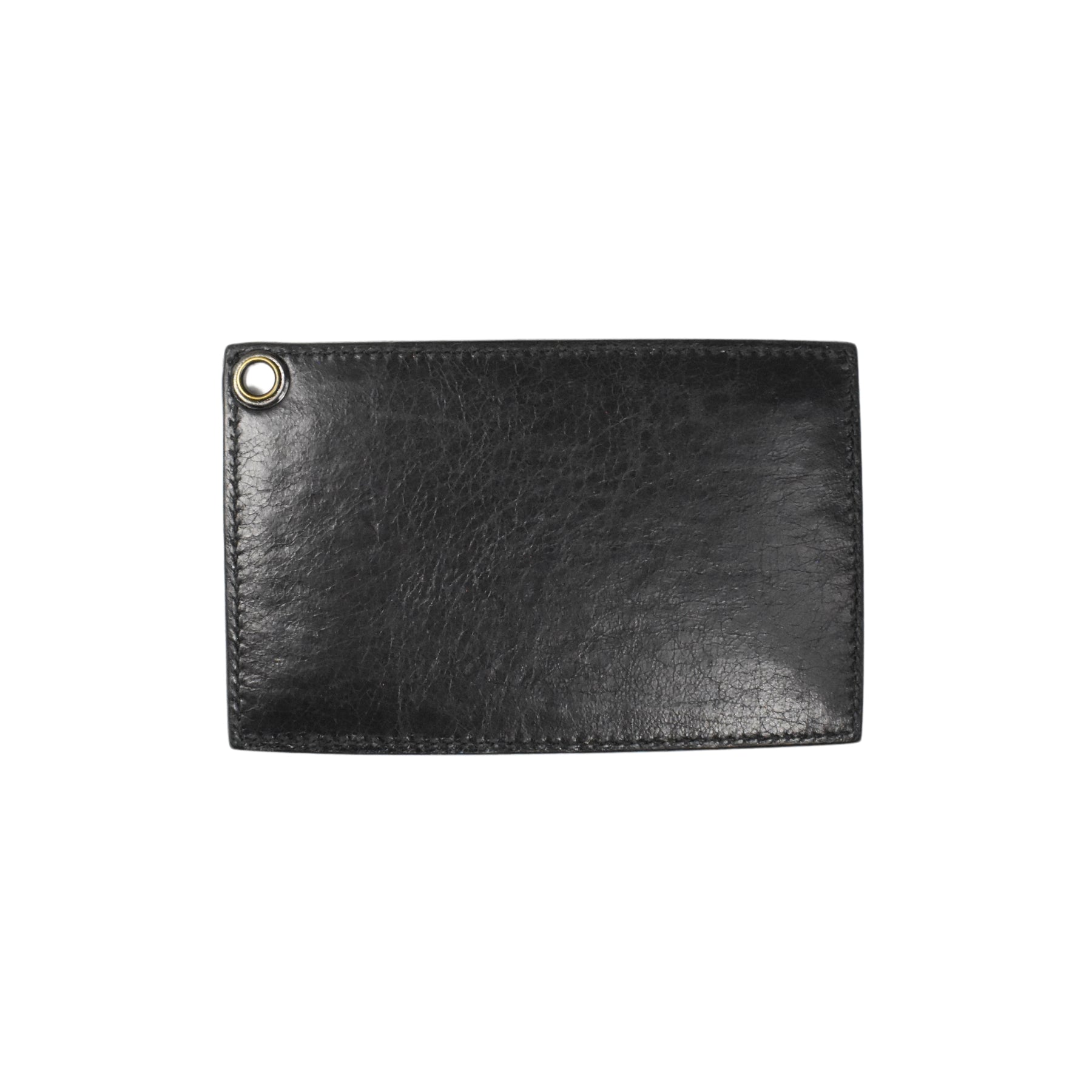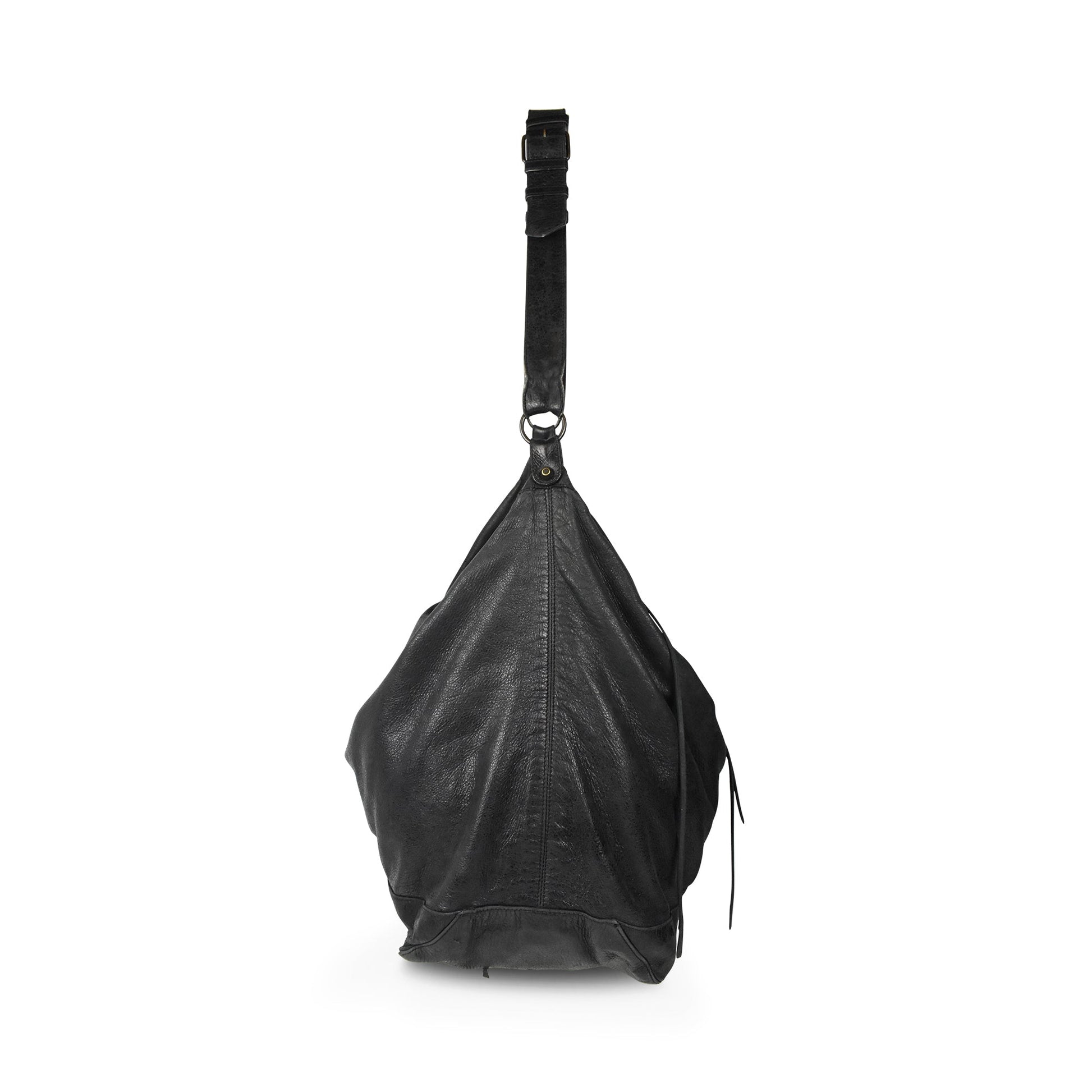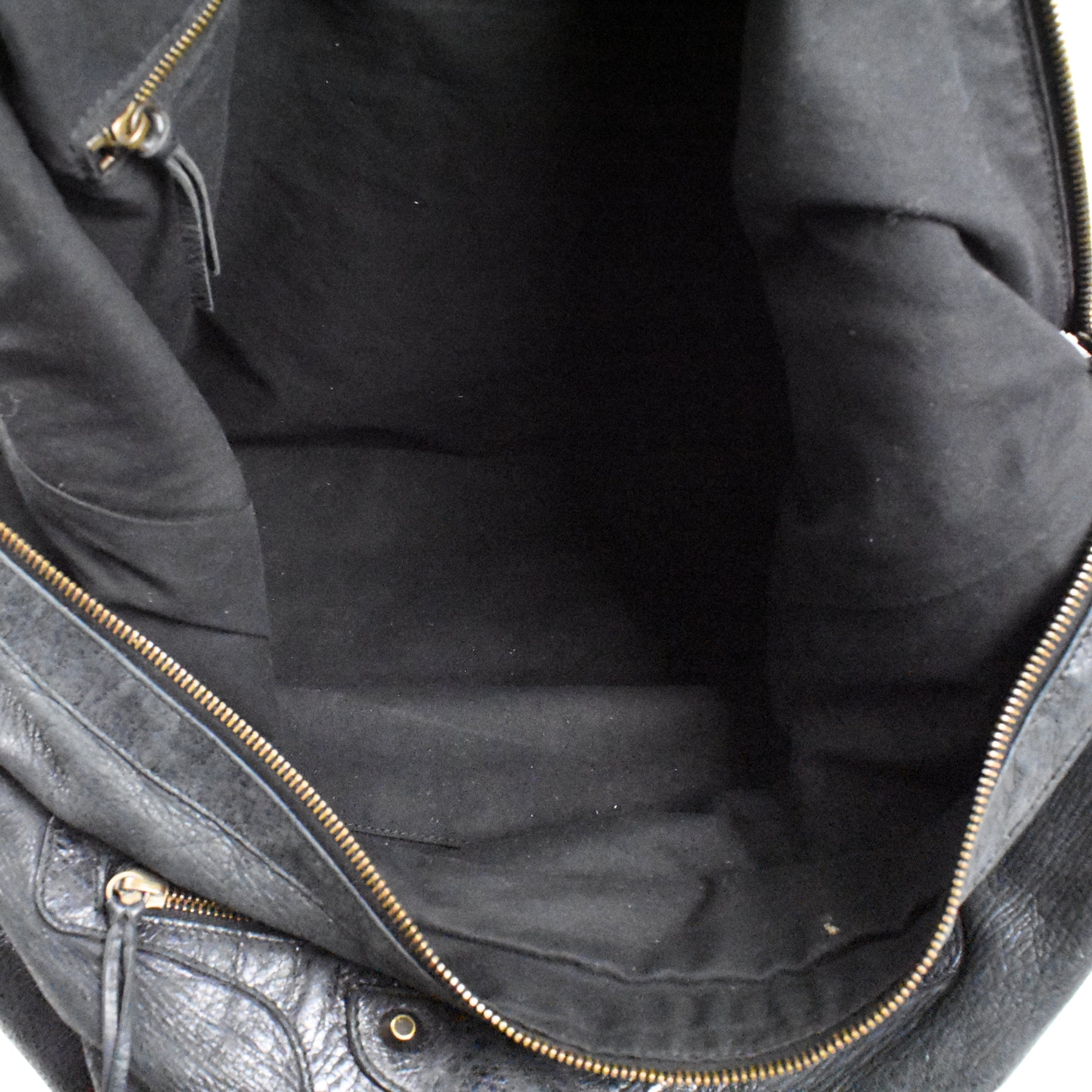 Balenciaga 'Courier' hobo bag in black soft leather with an adjustable shoulder strap and brushed gold hardware. Features a front zip pocket, elongated leather zipper pulls, and front studs. The interior is black cotton lined with a zip pocket.