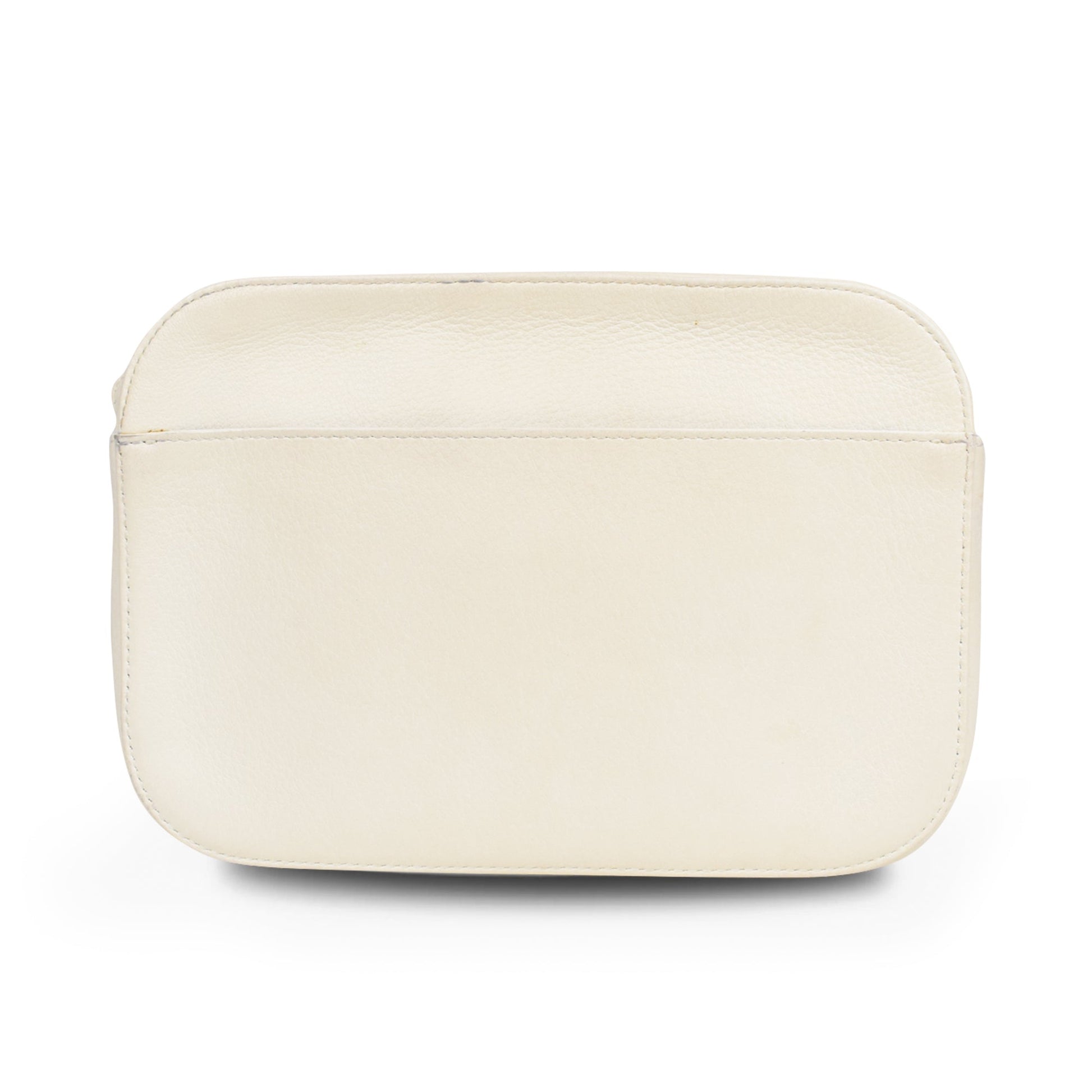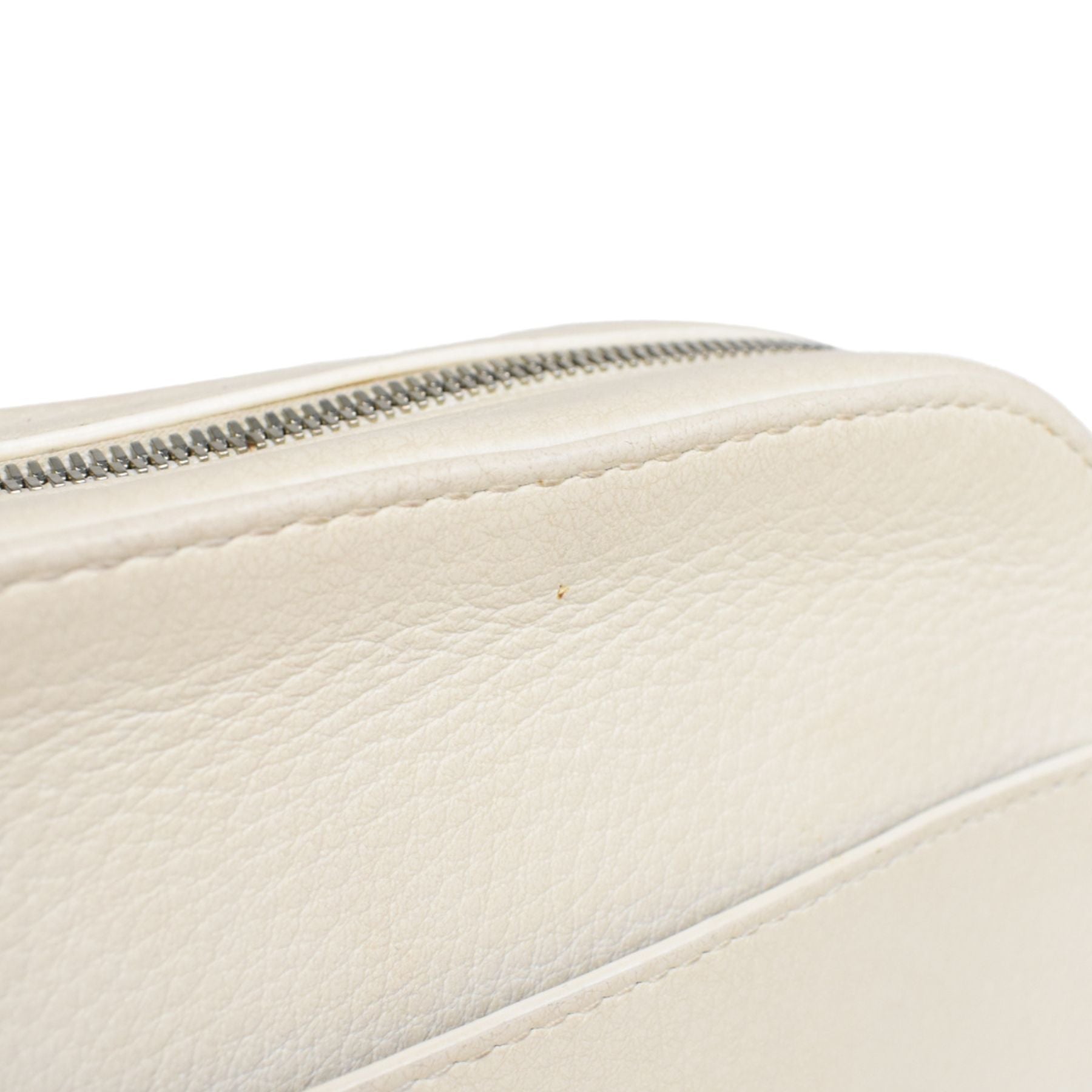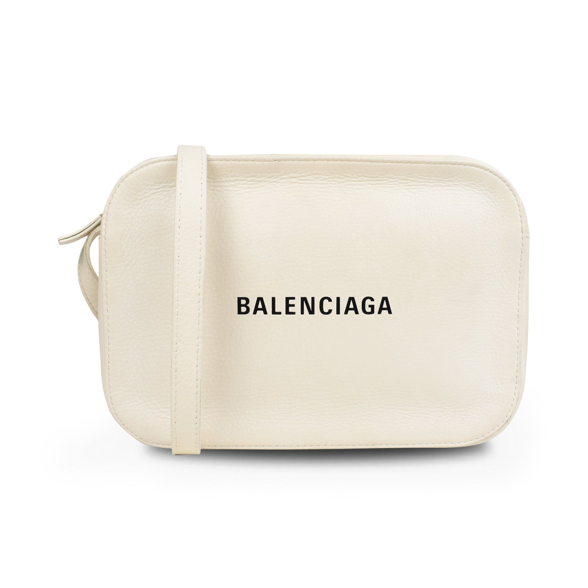 Balenciaga 'Everyday' camera crossbody bag in white leather with black logo on the front and slip pocket on the back. Features a long adjustable strap with silver hardware and zip closure. The interior is black leather lined with a slip pocket.