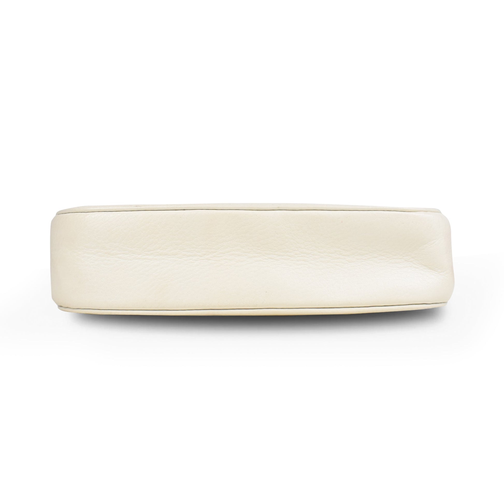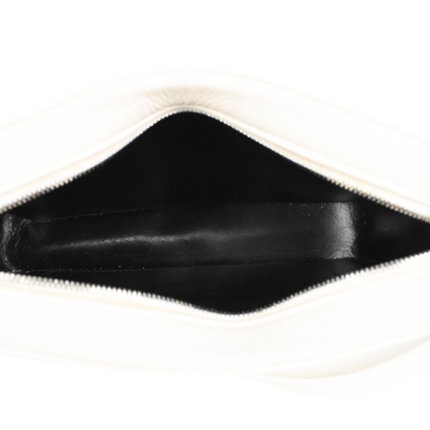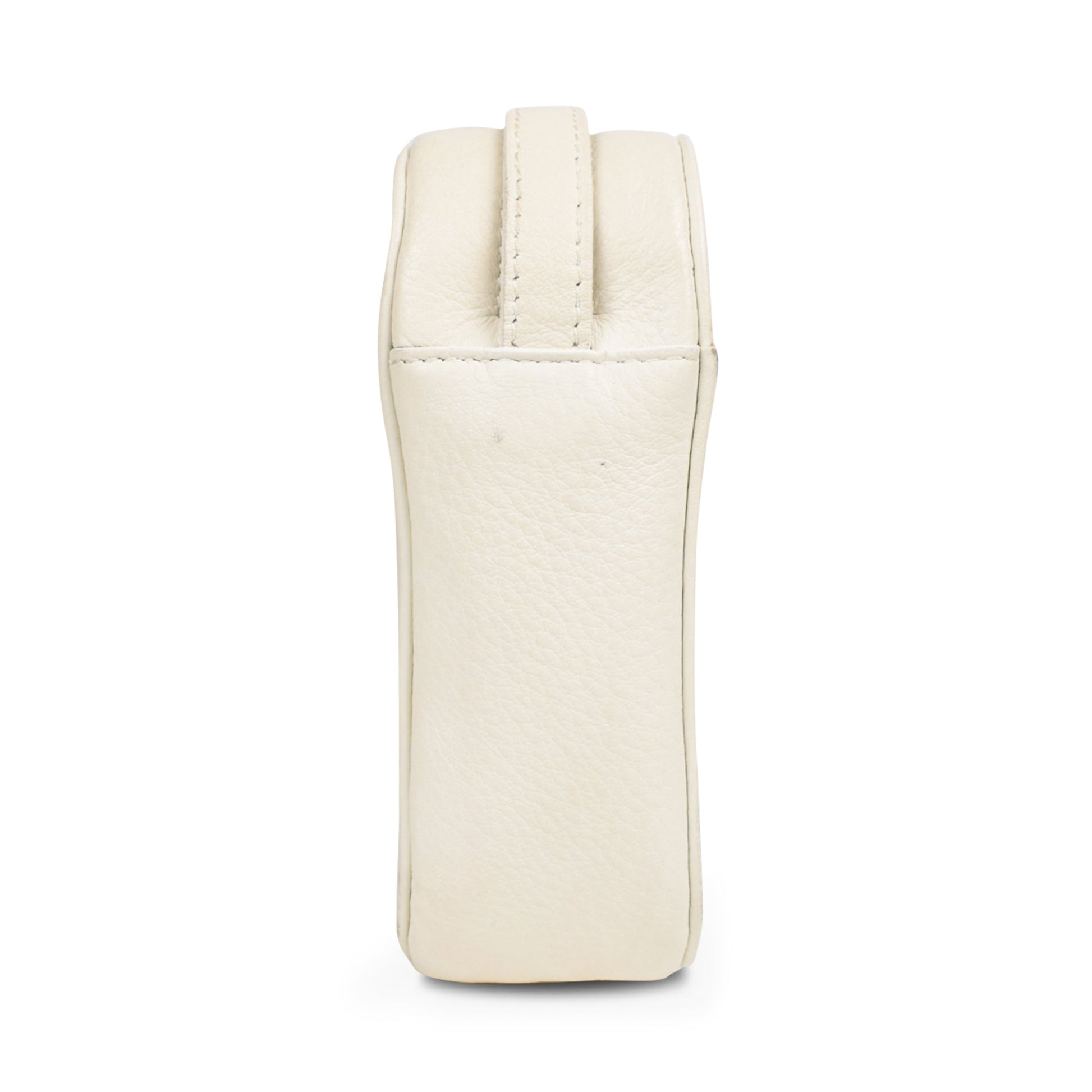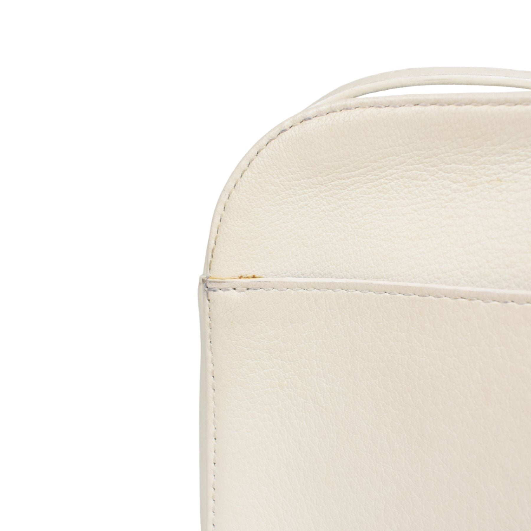 Balenciaga 'Everyday' camera crossbody bag in white leather with black logo on the front and slip pocket on the back. Features a long adjustable strap with silver hardware and zip closure. The interior is black leather lined with a slip pocket.