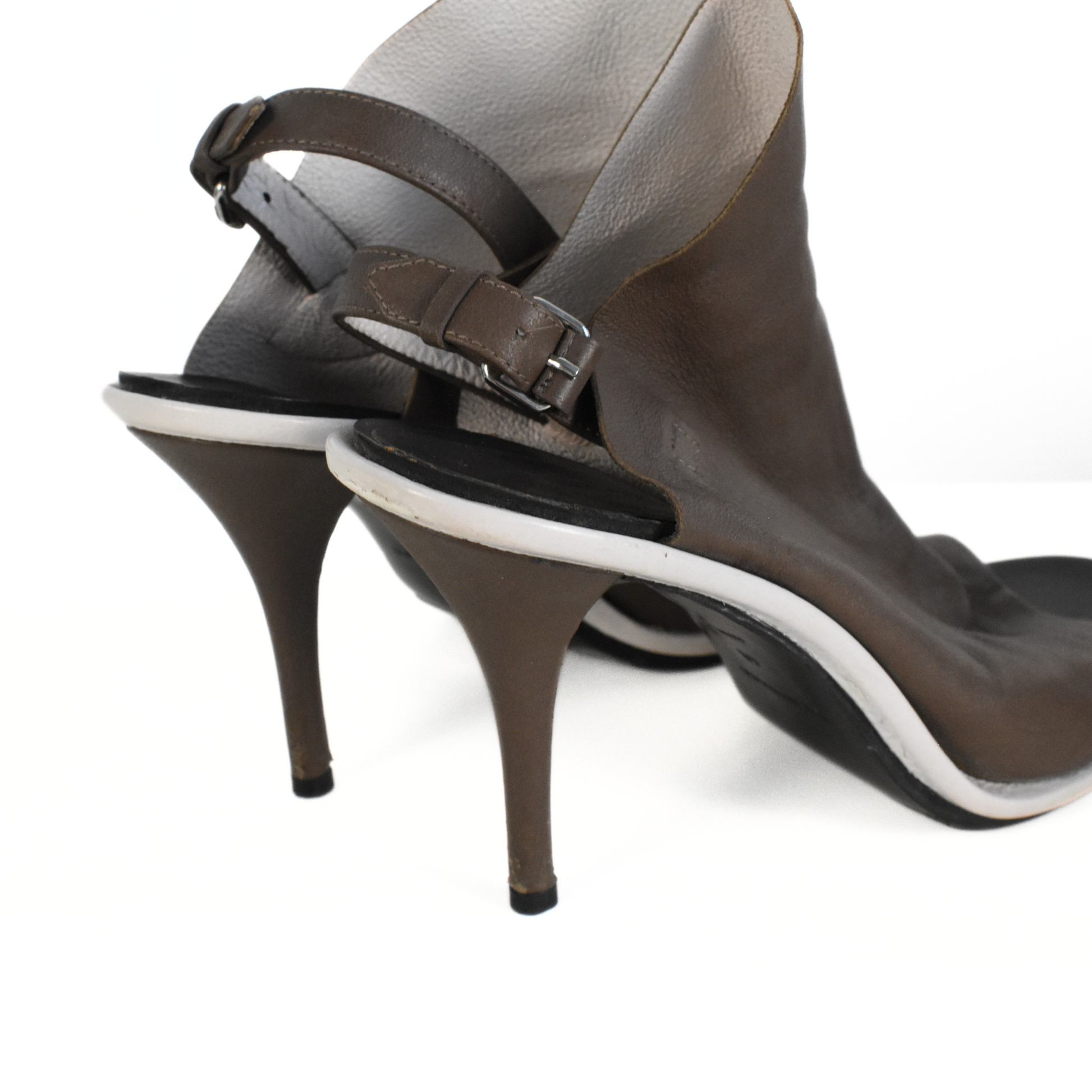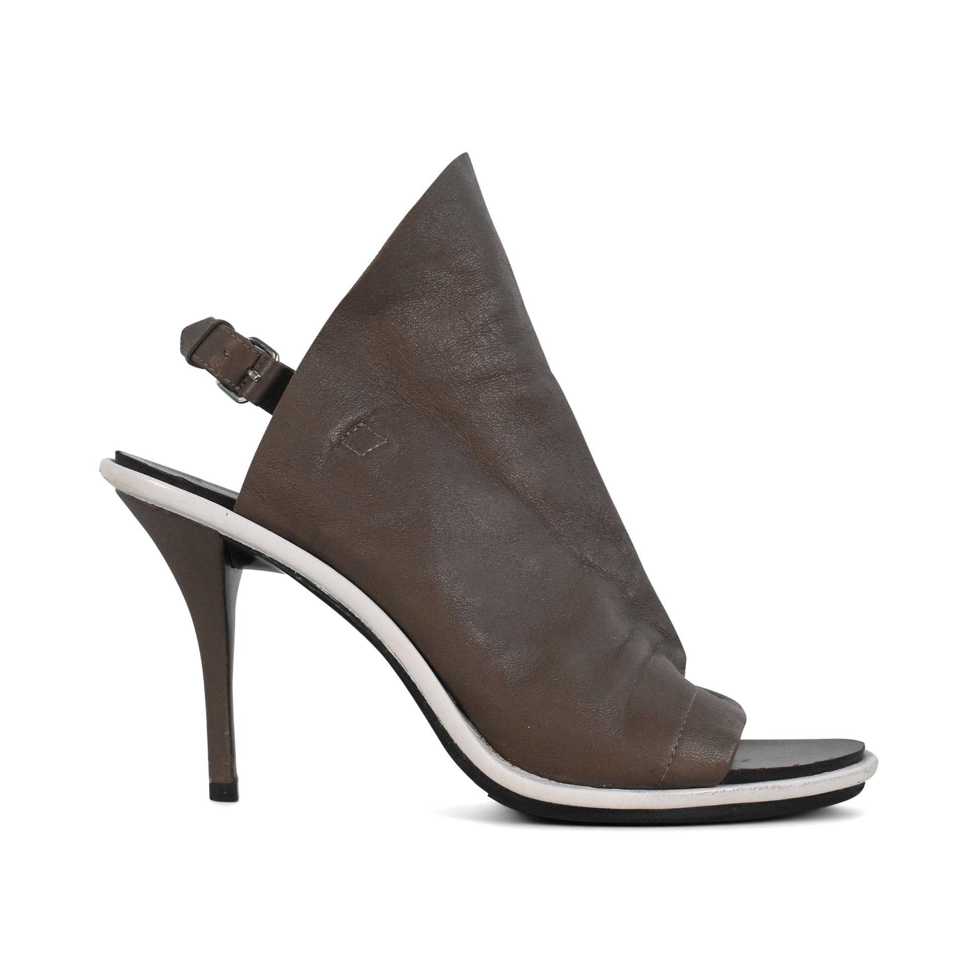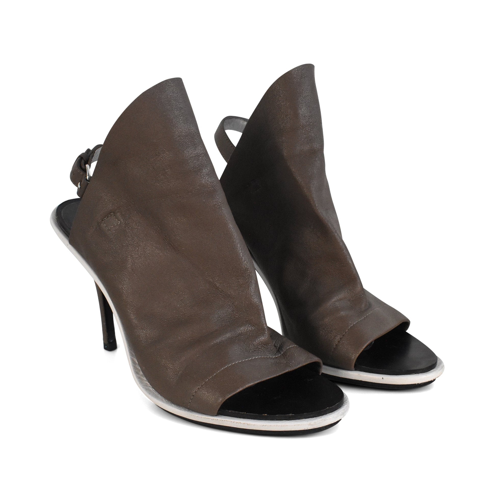 Balenciaga 'Glove' heels in taupe brown leather with a slingback strap, a stiletto heel, and a peep-toe.