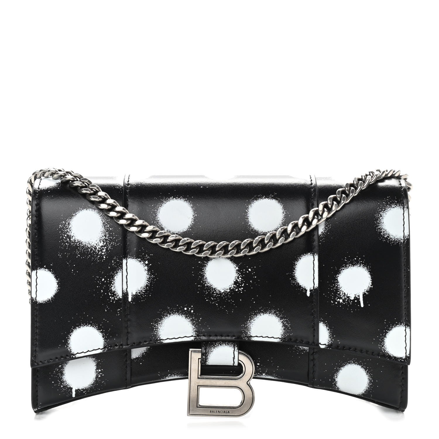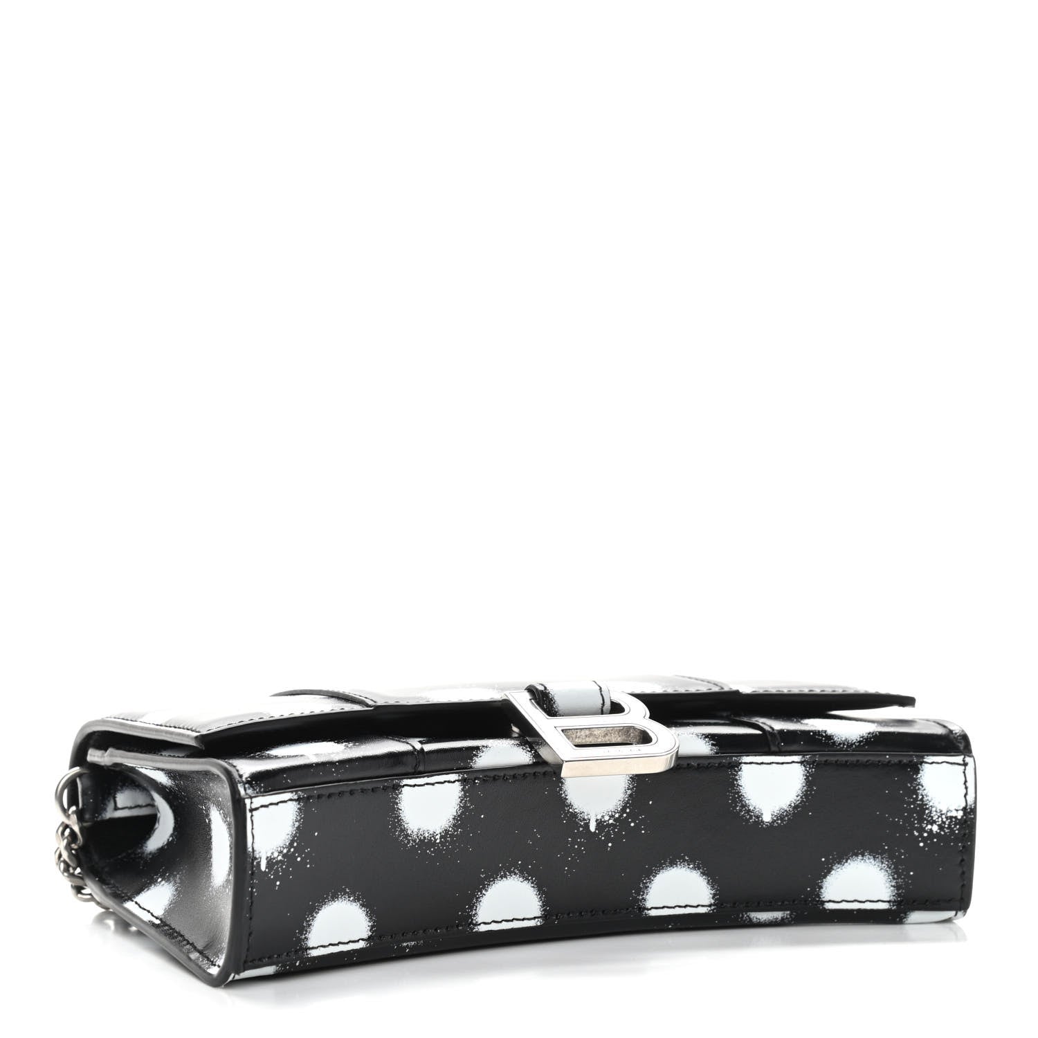 This petite handbag is crafted of smooth calfskin in black with white polka dots. It features an optional shoulder strap with aged silver chain links and a signature Balenciaga B charm. The front flap opens to a black leather interior and there is one slip pocket at back.