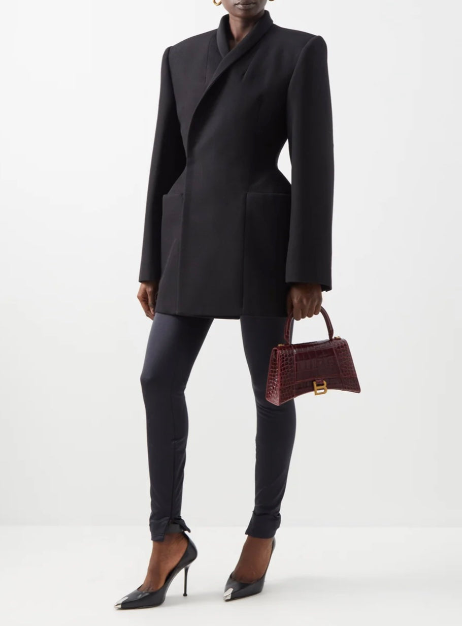 Cristóbal Balenciaga's tailoring codes inspire this dark red Hourglass bag, shaped from crocodile-effect leather to a sculptural profile with gold hardware.