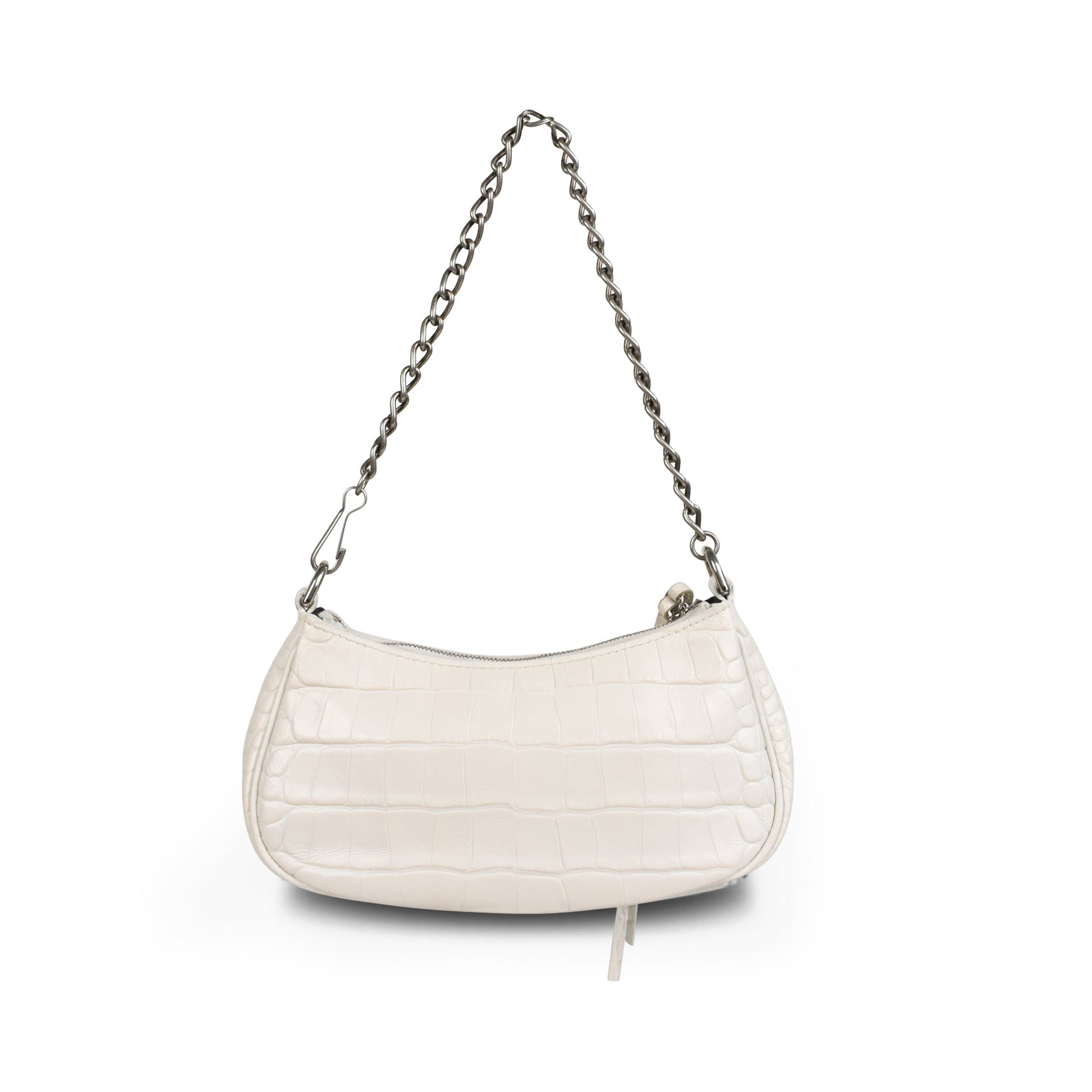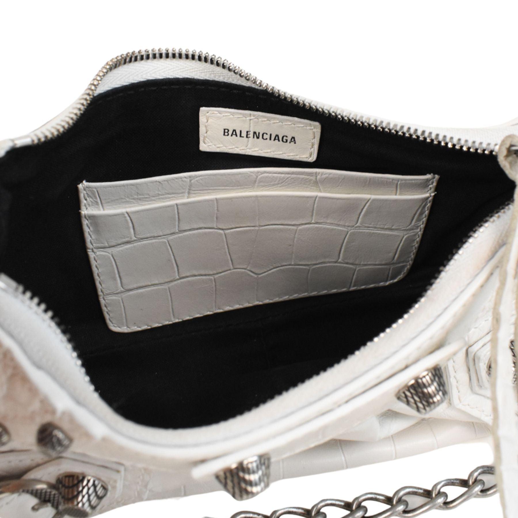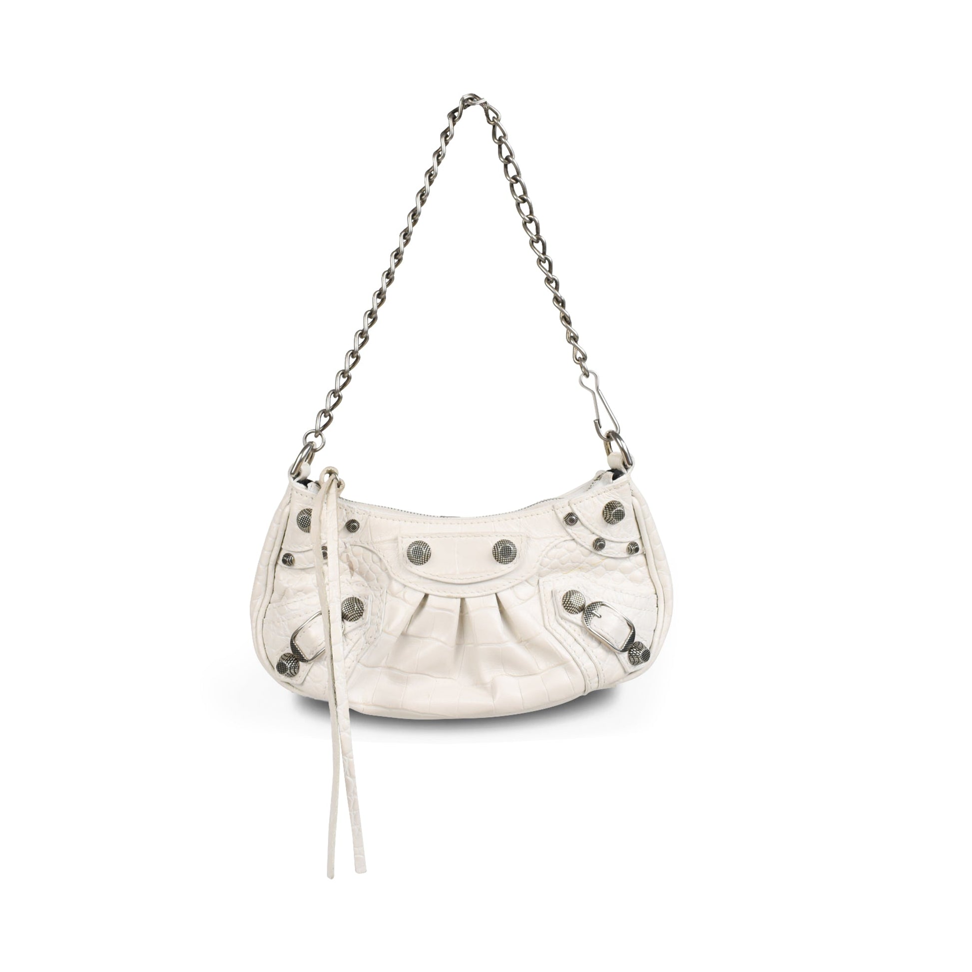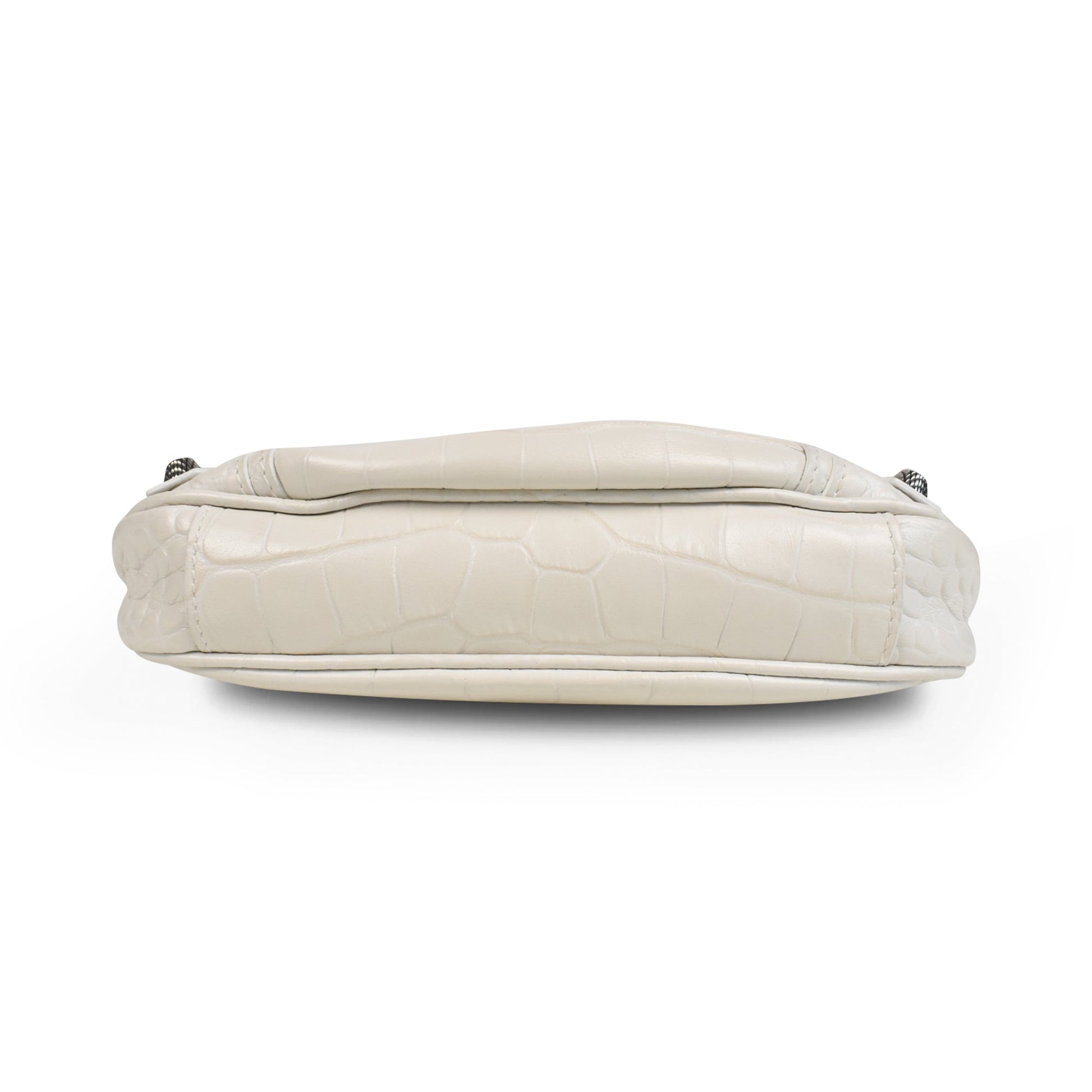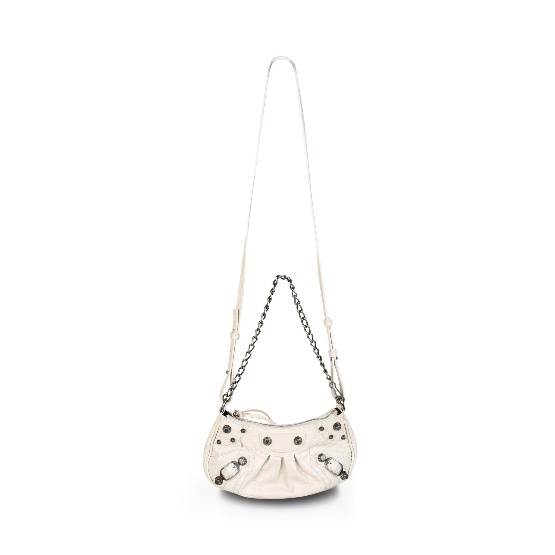 Balenciaga 'Le Cagole Mini' bag in white croc-embossed leather with signature large stud and buckle detailing in gunmetal hardware. Features a top zip closure, a gold chain shoulder strap, an adjustable leather crossbody strap, two inner card slots and black canvas lining.