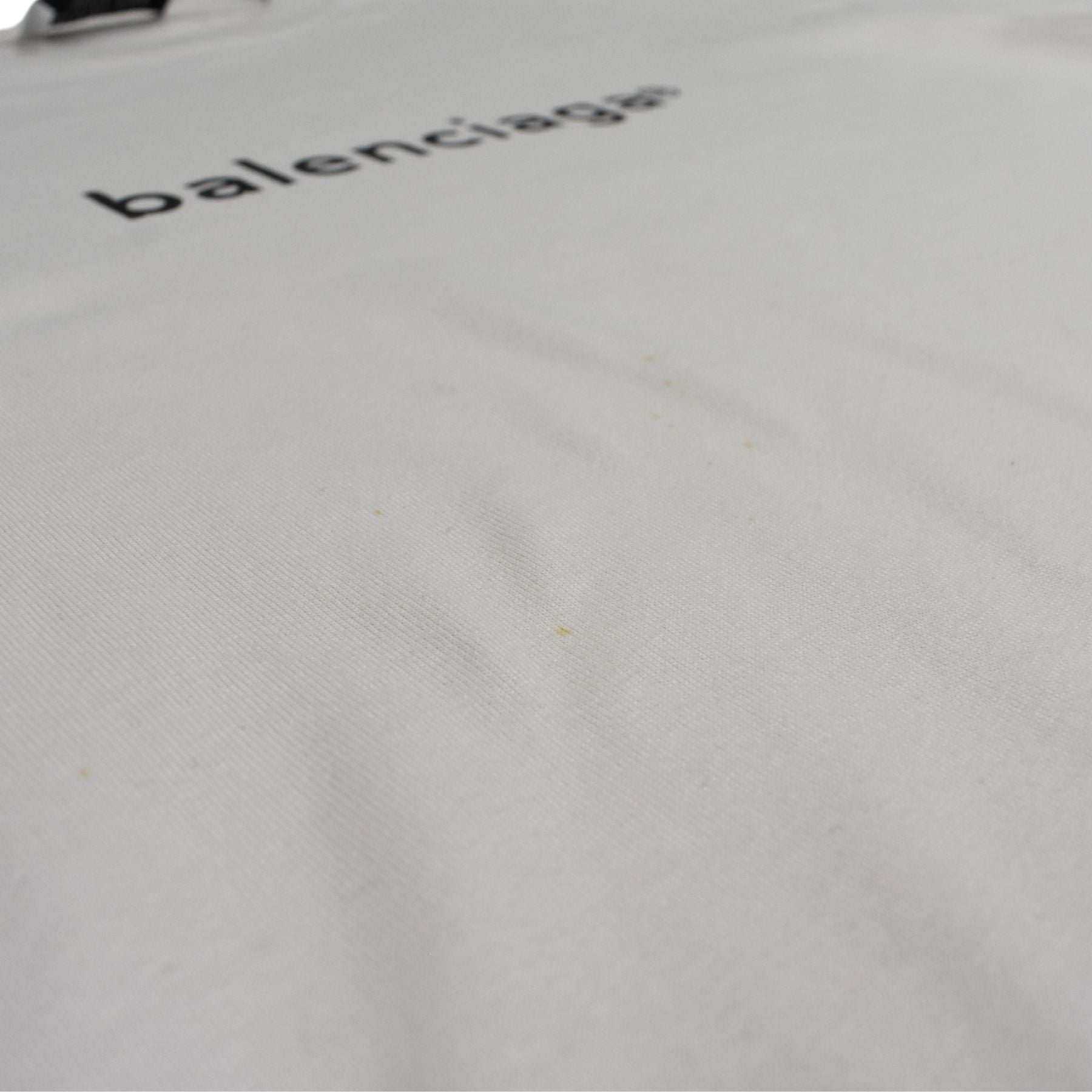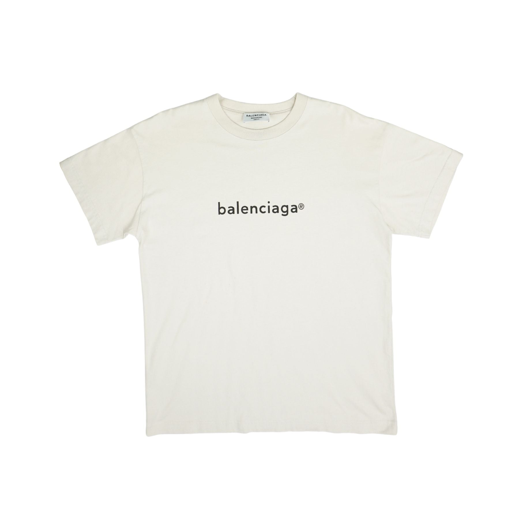Balenciaga boxy fit t-shirt in beige cotton with black lowercase logo text on the front.