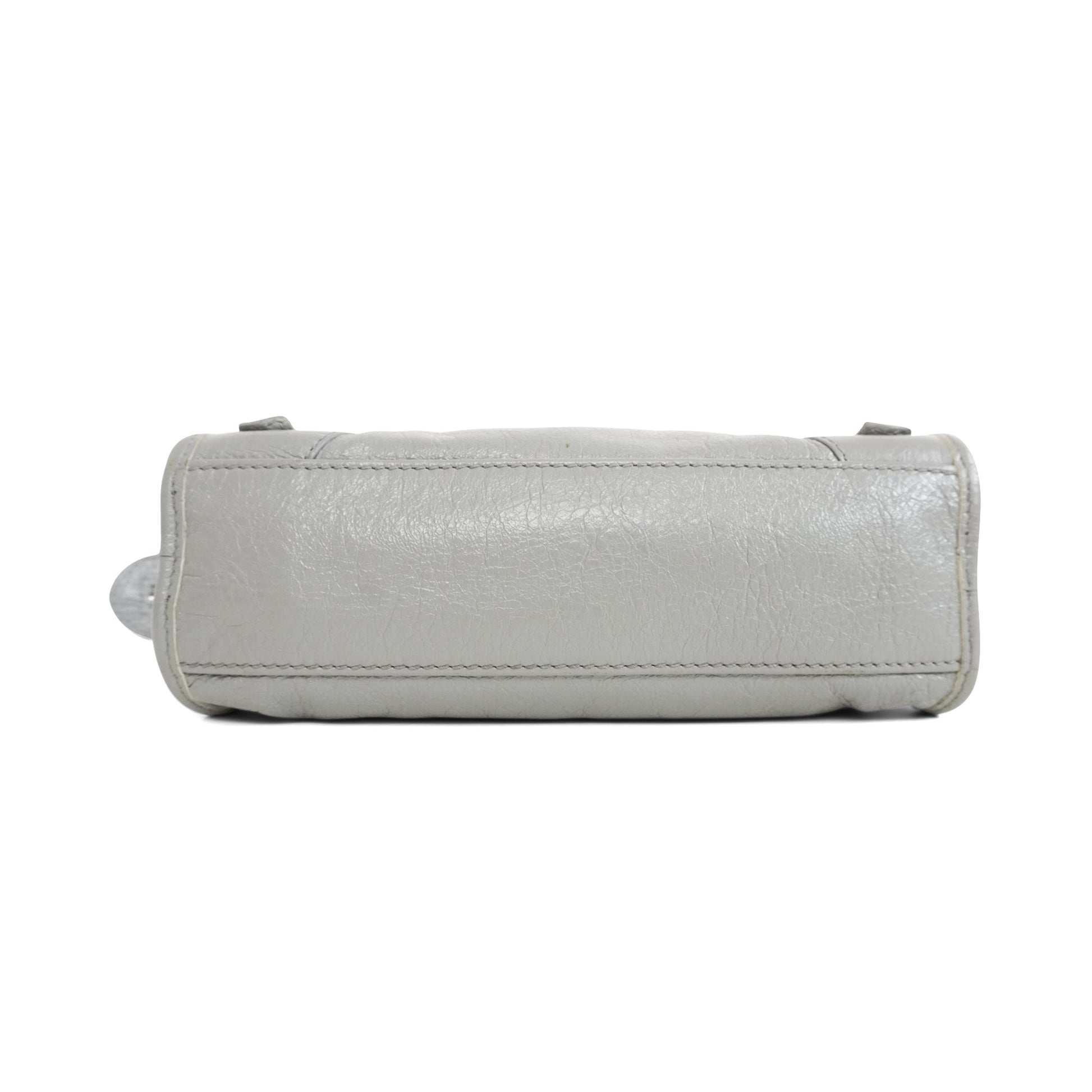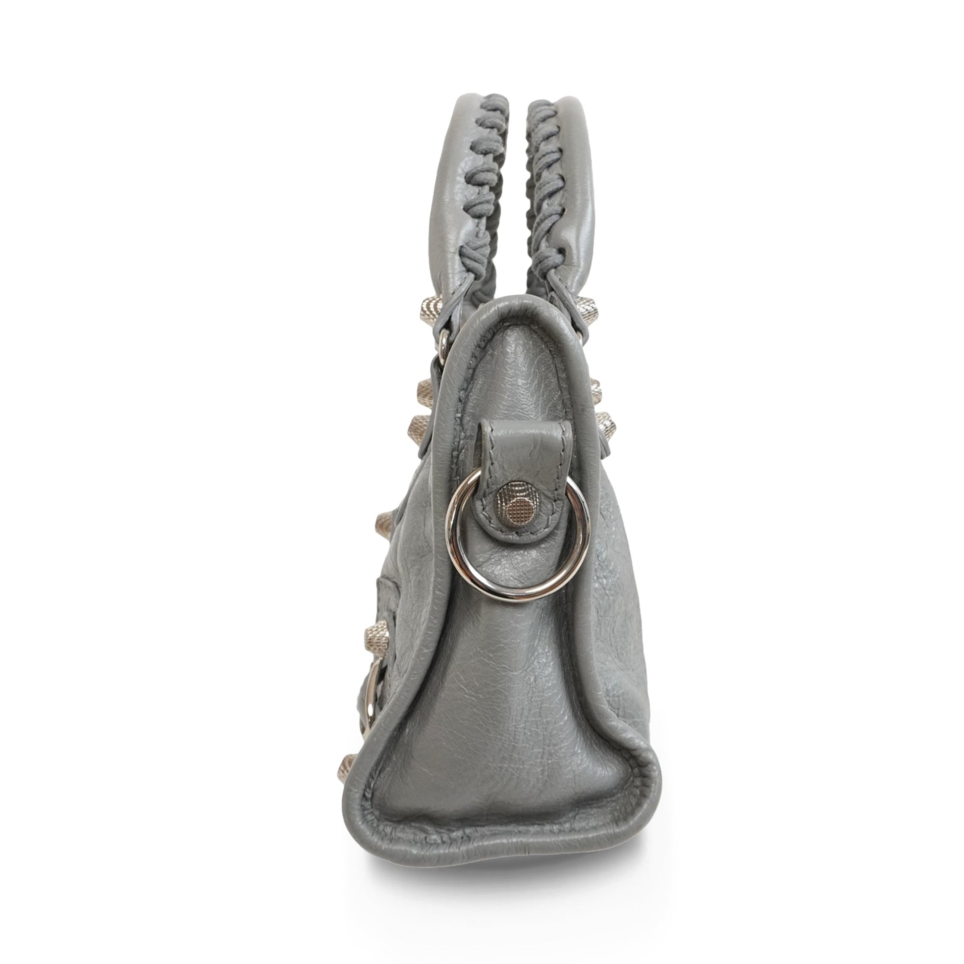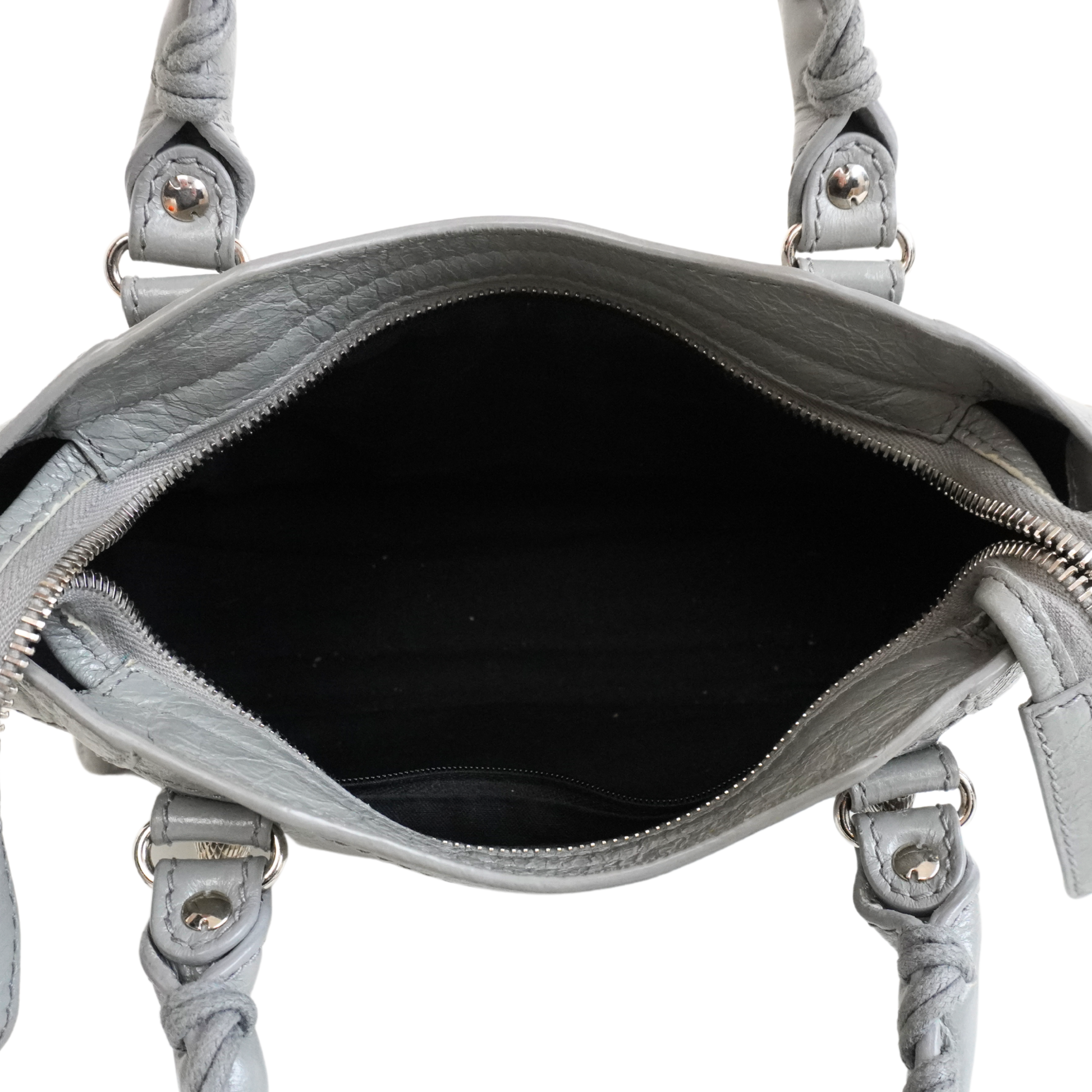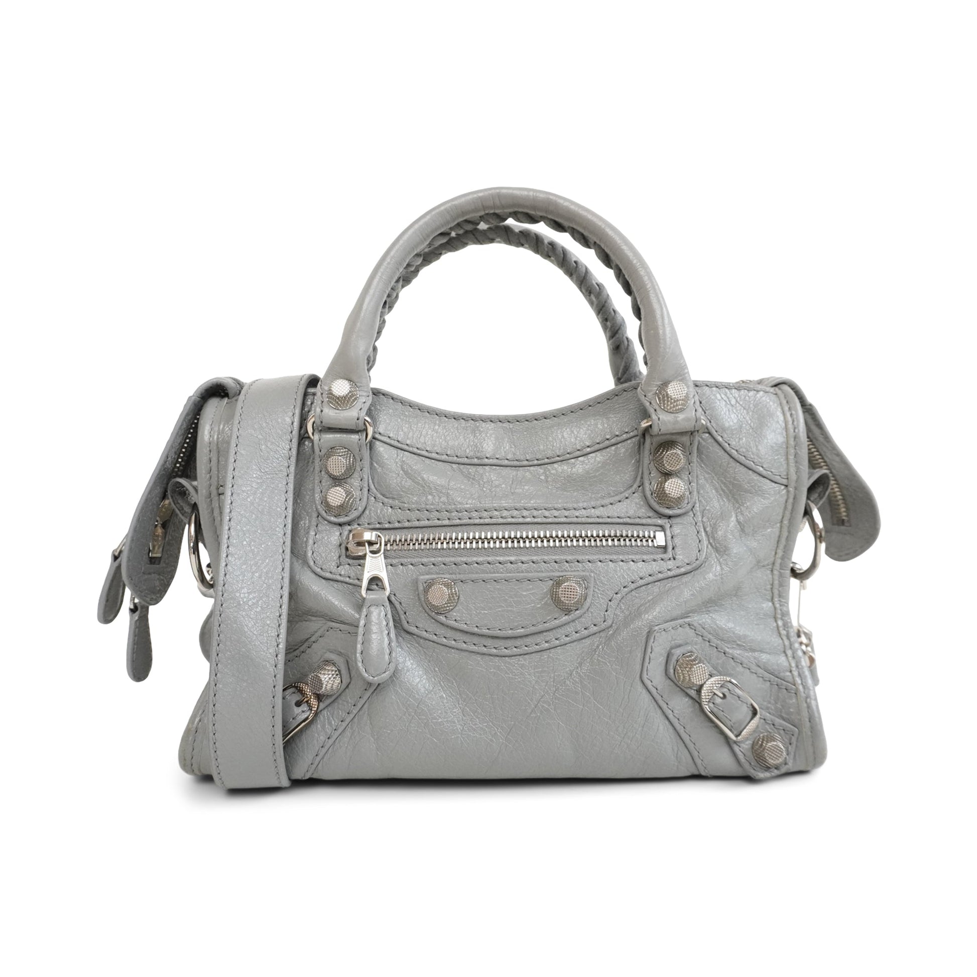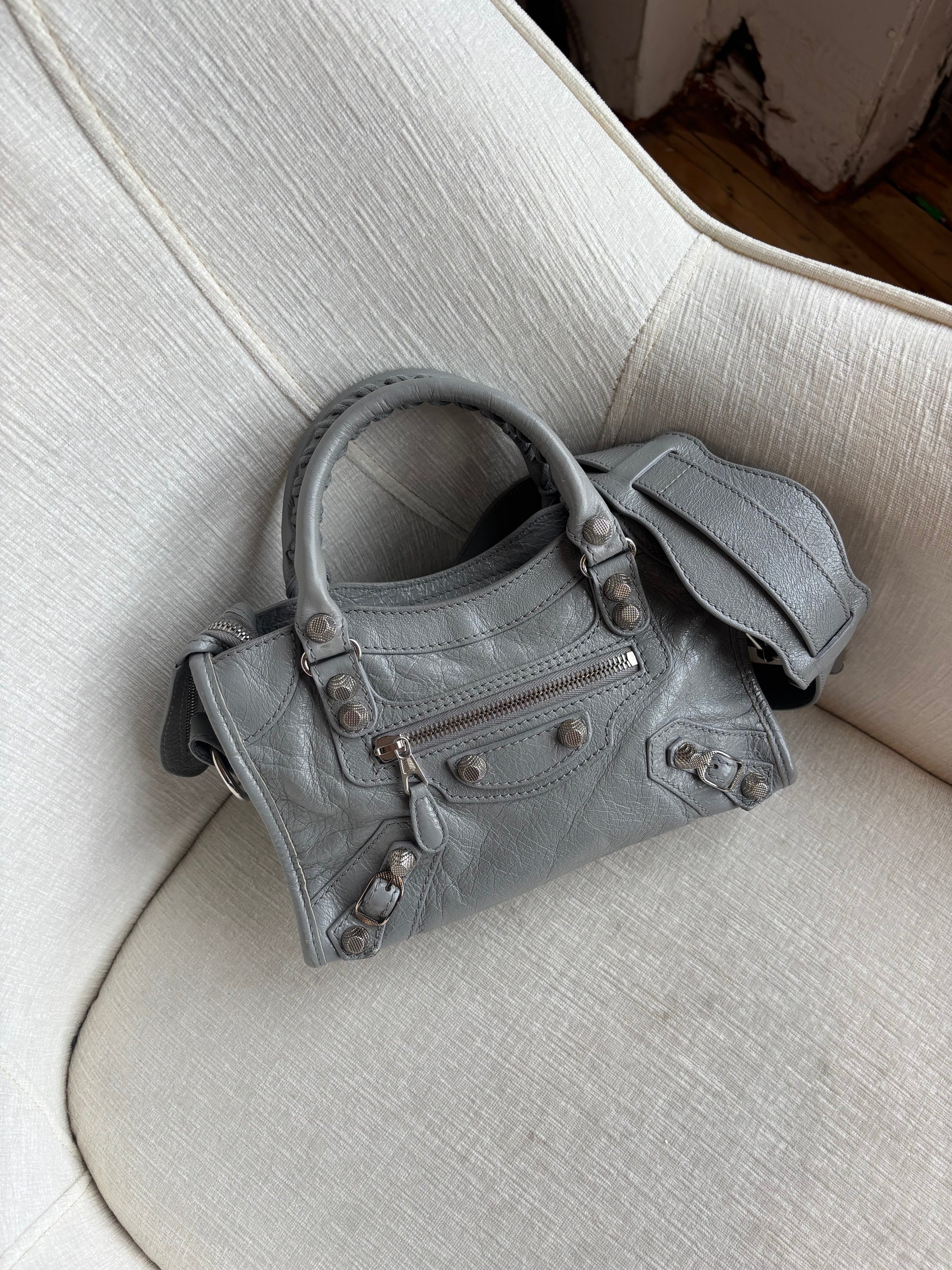 Balenciaga 'Mini City' handbag in glazed grey leather with silver 'Arena' hardware. Features whipstitch detailed handles and a removable crossbody strap. The bag has a two way zip closure that extends on both sides of the bag, and is lined with black fabric.