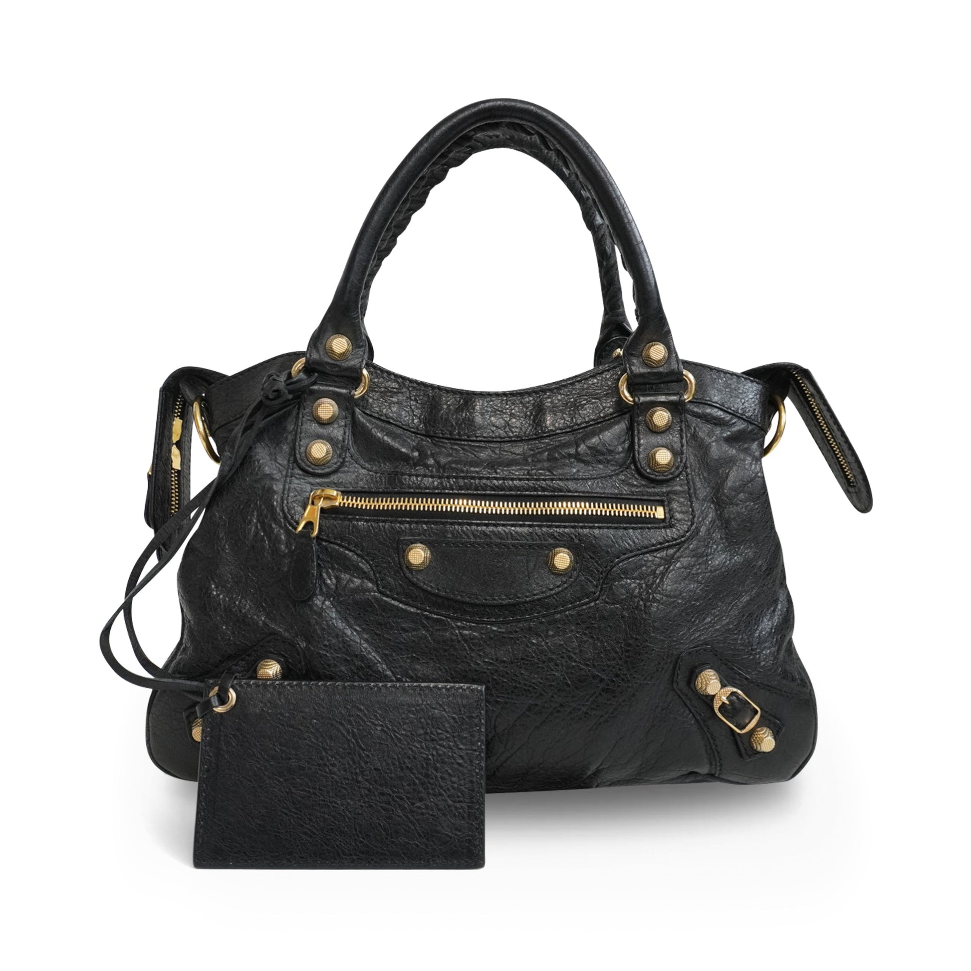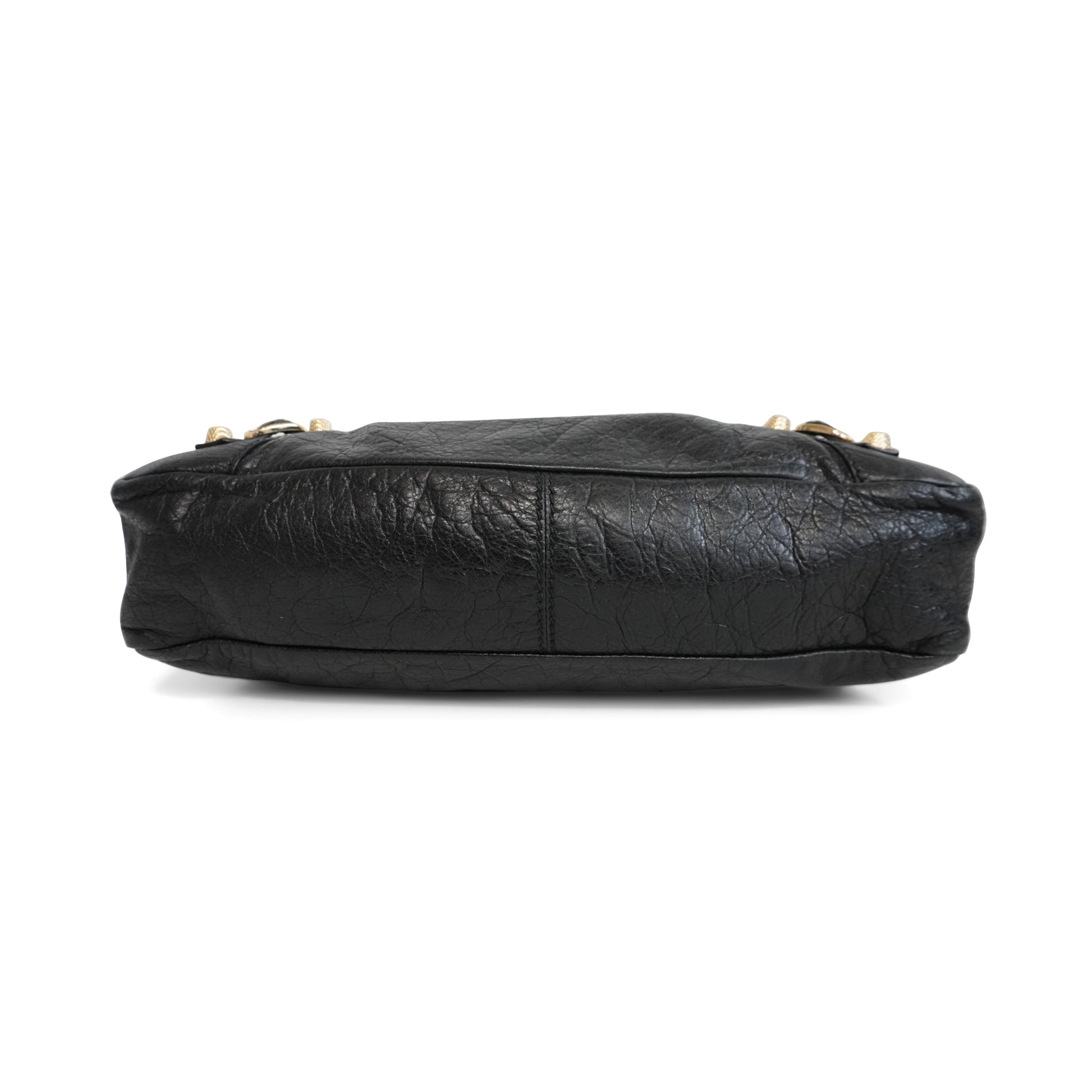 Balenciaga 'Motocross' handbag in black leather with gold grid stud hardware, a front zip pocket, dual rolled top handles with whip stitch detailing, and a removable crossbody strap. The bag has a top-zip opening revealing a black canvas interior lining with a zip pocket.