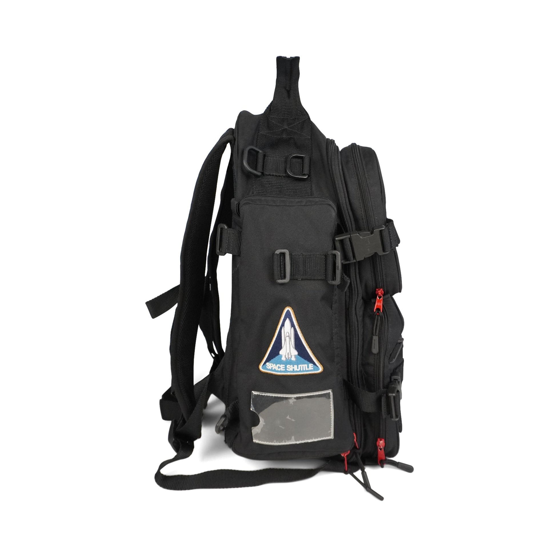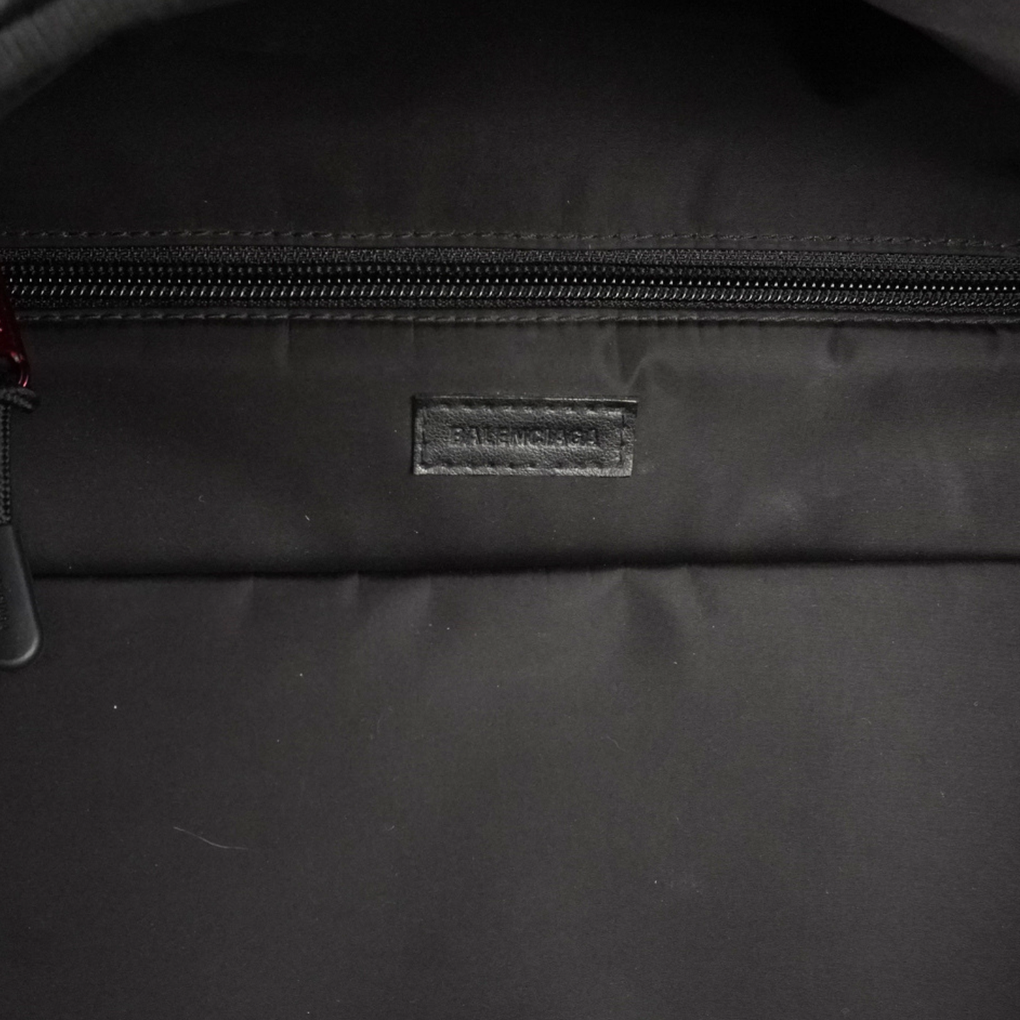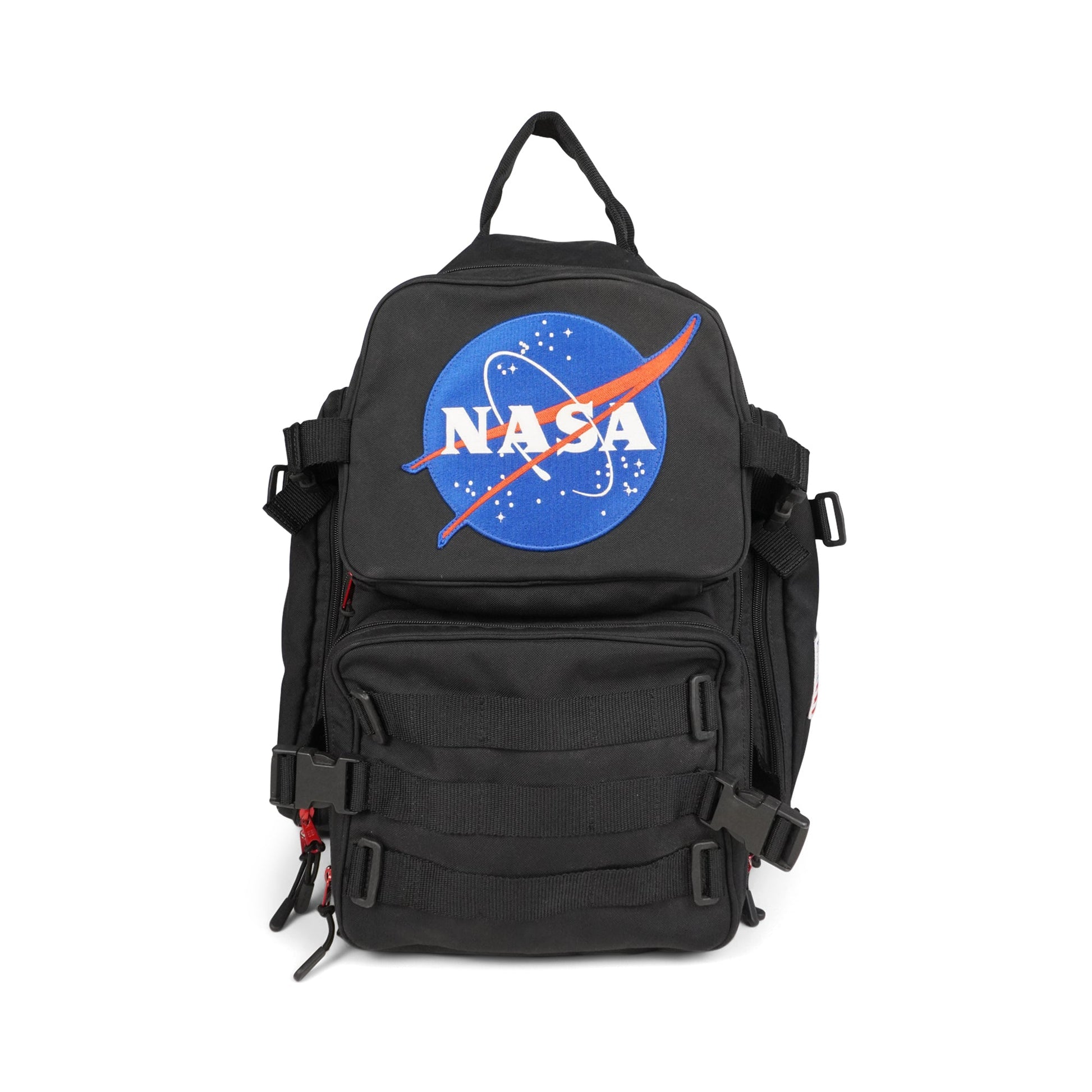 Balenciaga 'NASA' large backpack in black nylon with multiple zip pockets. Features red zipper pull hardware, multiple patches, black plastic d-rings throughout, nylon buckle straps throughout, adjustable shoulder straps, and a mesh back. The interior is black nylon lined with a laptop sleeve.