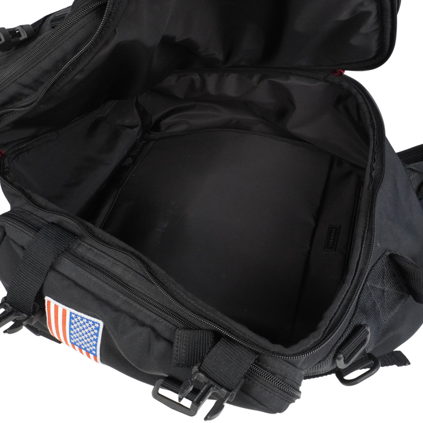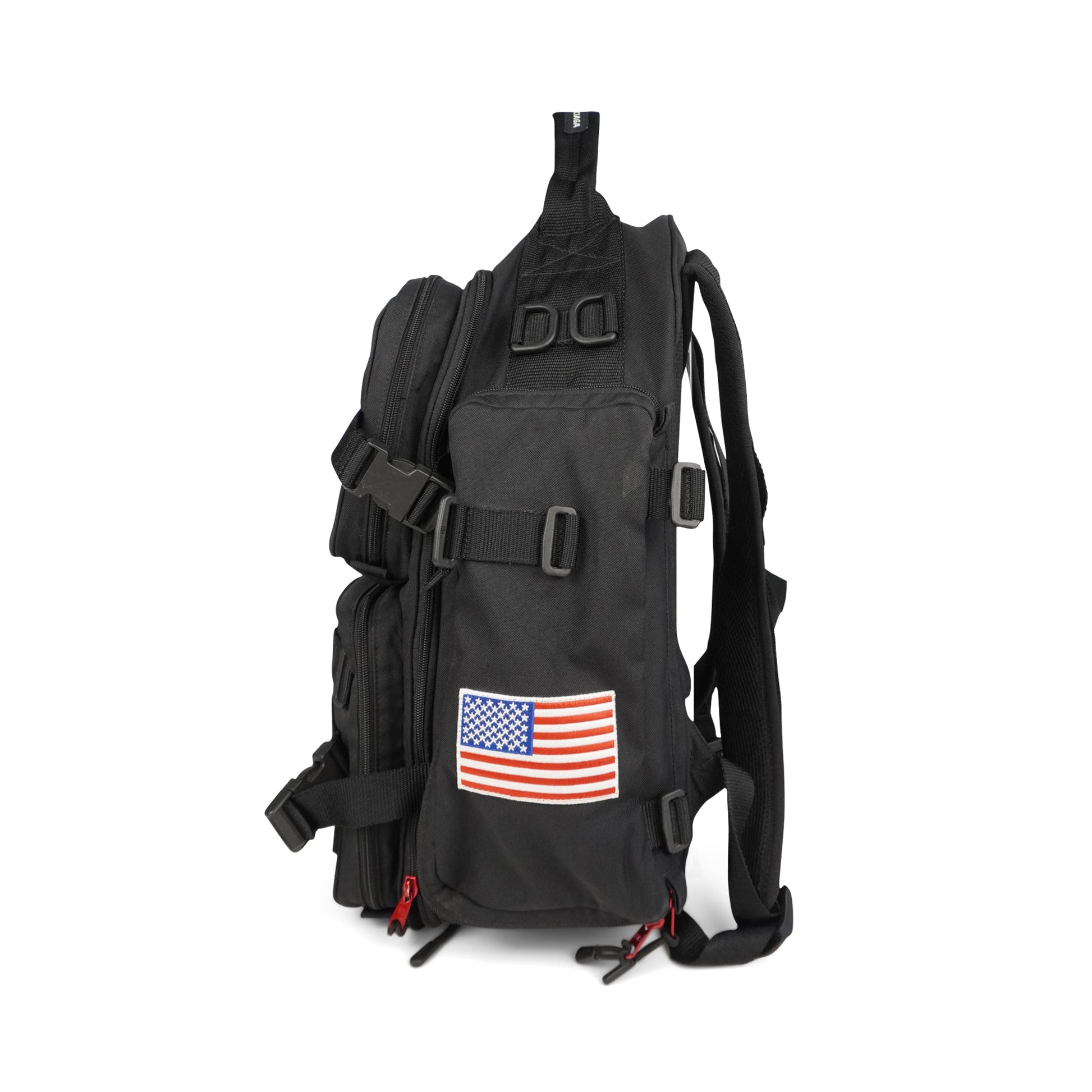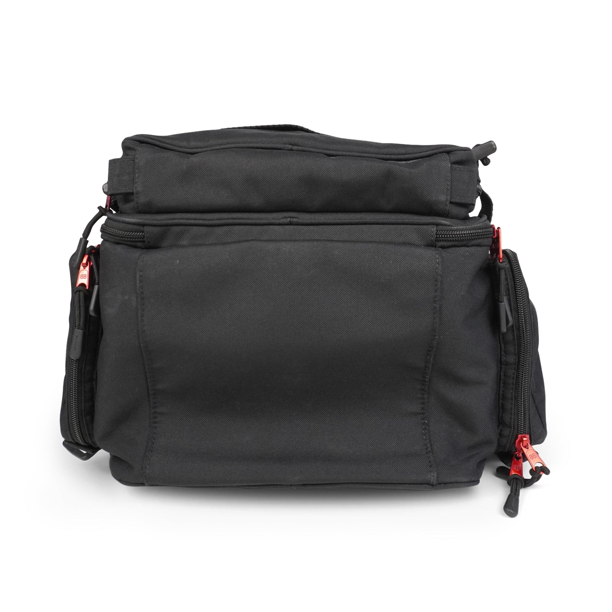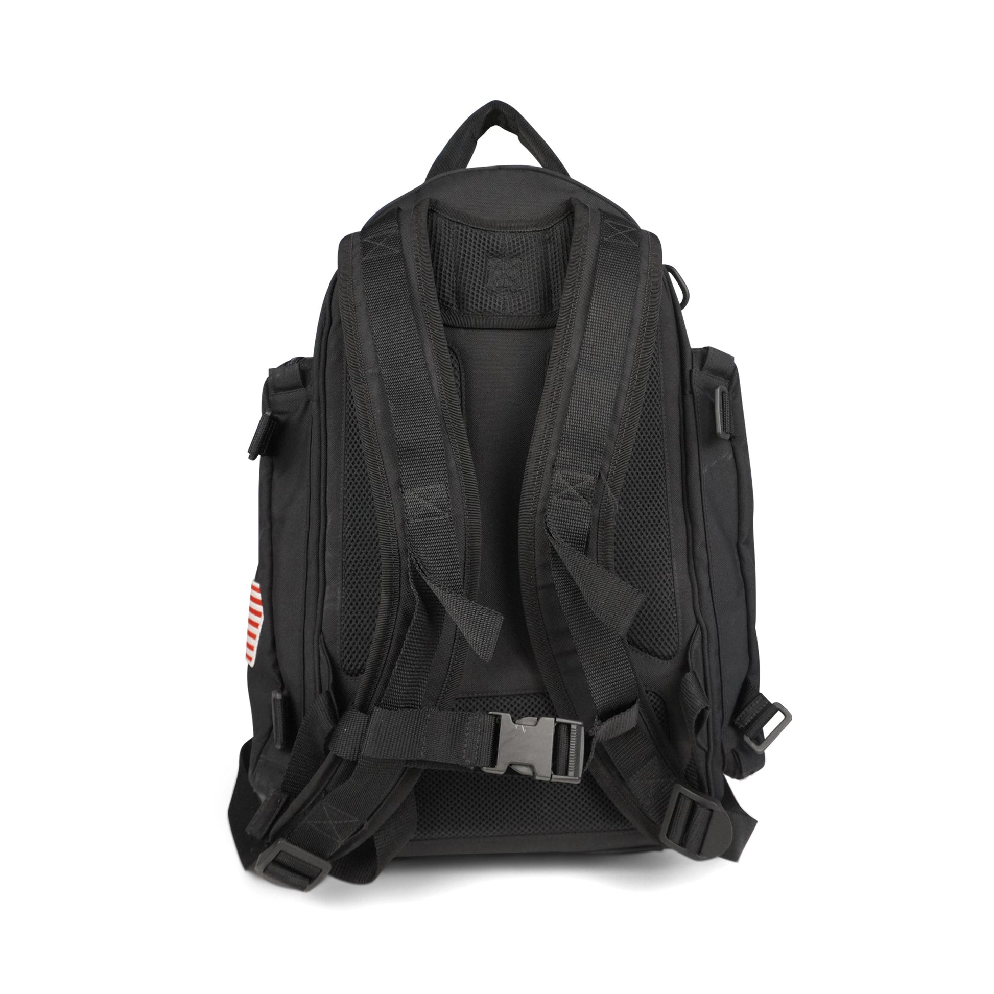 Balenciaga 'NASA' large backpack in black nylon with multiple zip pockets. Features red zipper pull hardware, multiple patches, black plastic d-rings throughout, nylon buckle straps throughout, adjustable shoulder straps, and a mesh back. The interior is black nylon lined with a laptop sleeve.