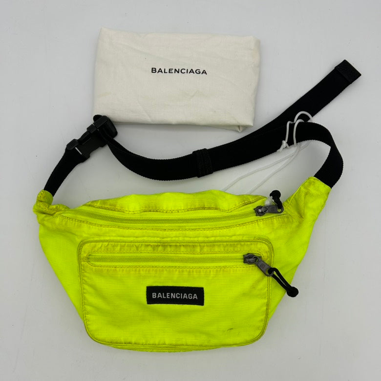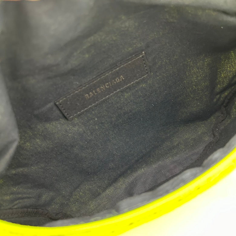 Make a bold fashion statement with this pre-owned Balenciaga crossbody bag. Made from durable nylon, it features a vibrant yellow exterior and an adjustable black strap for comfort. Despite being in good condition with minimal signs of wear, this bag retains its luxury appeal and practical design. Don't miss the chance to own this stylish accessory.