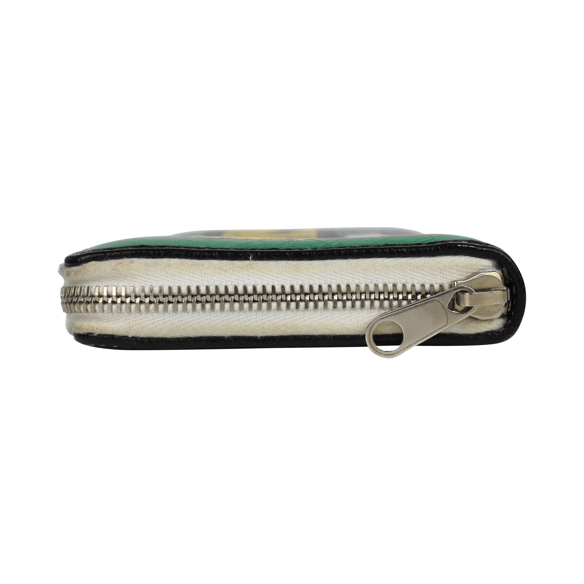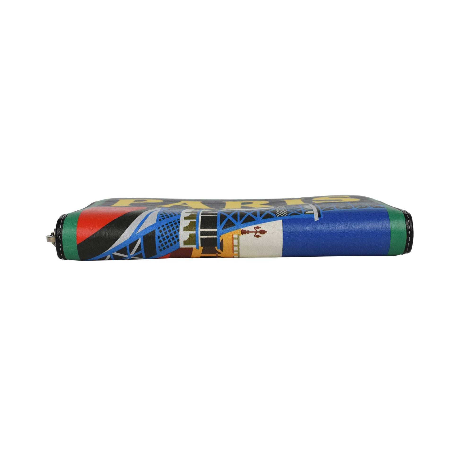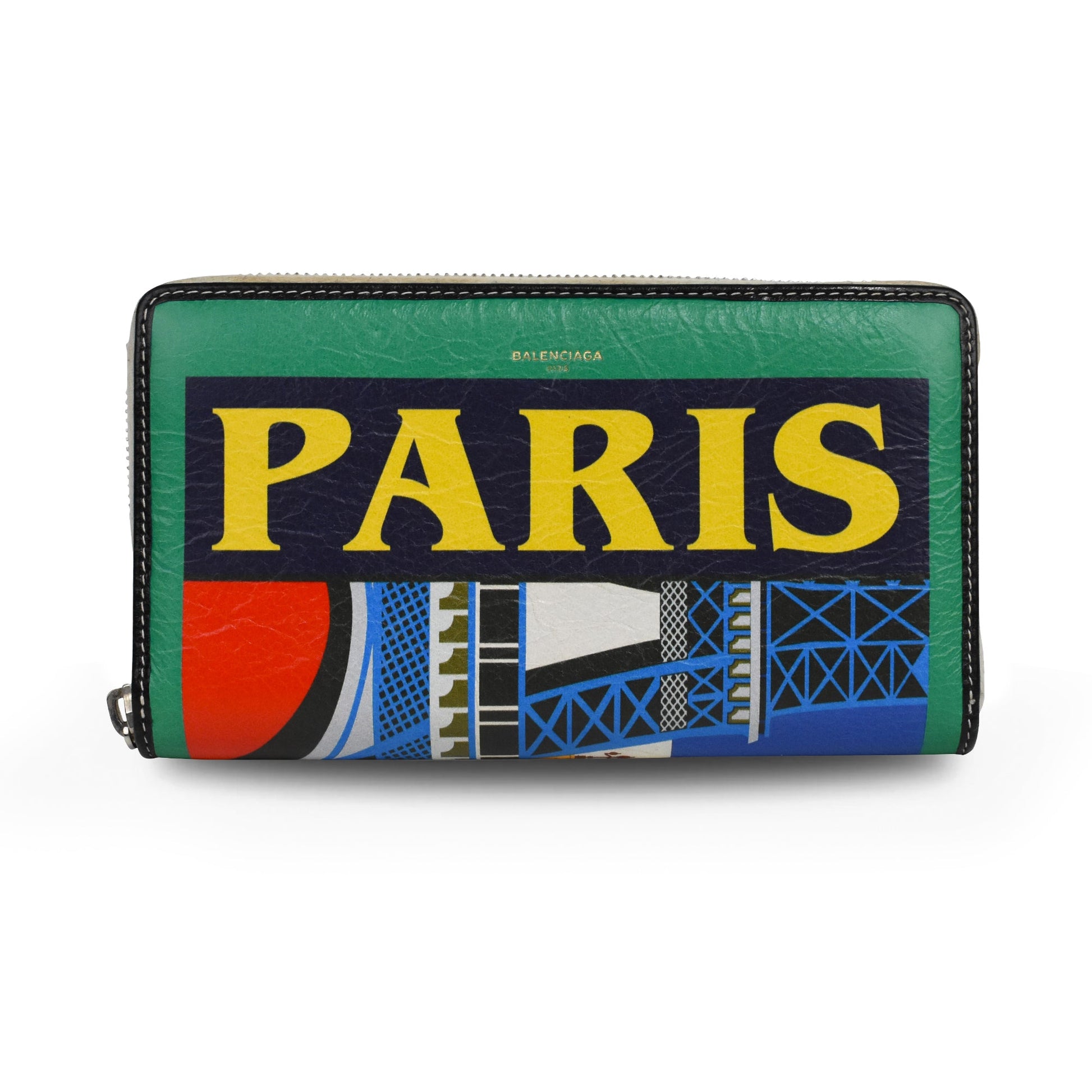 Balenciaga 'Paris' continental wallet in green leather with a blue, black and yellow 'PARIS' graphic, black leather trim and an all-around zip opening in silver hardware.