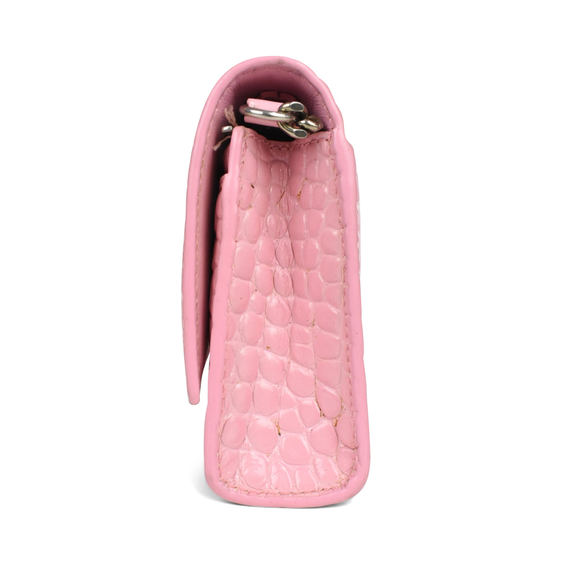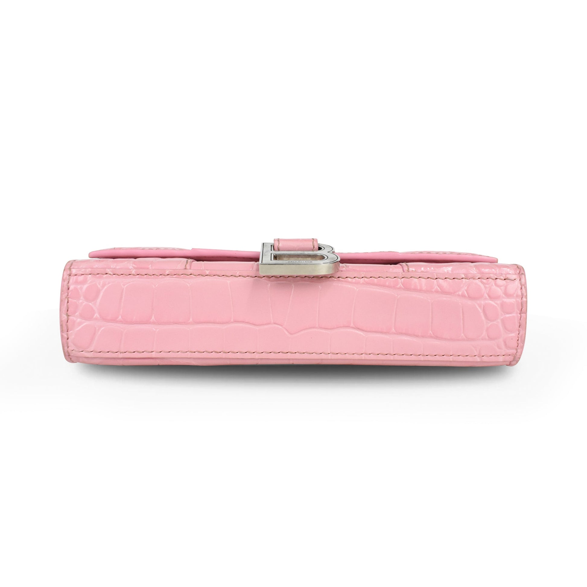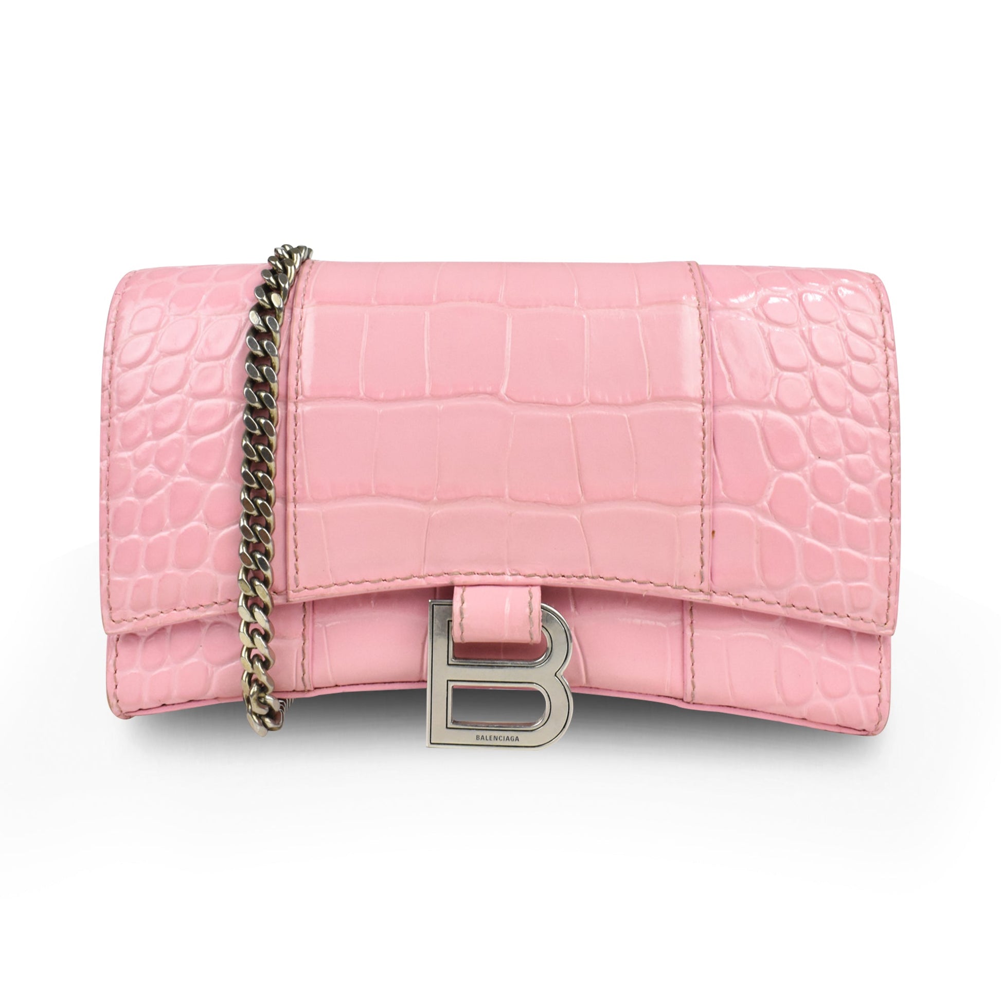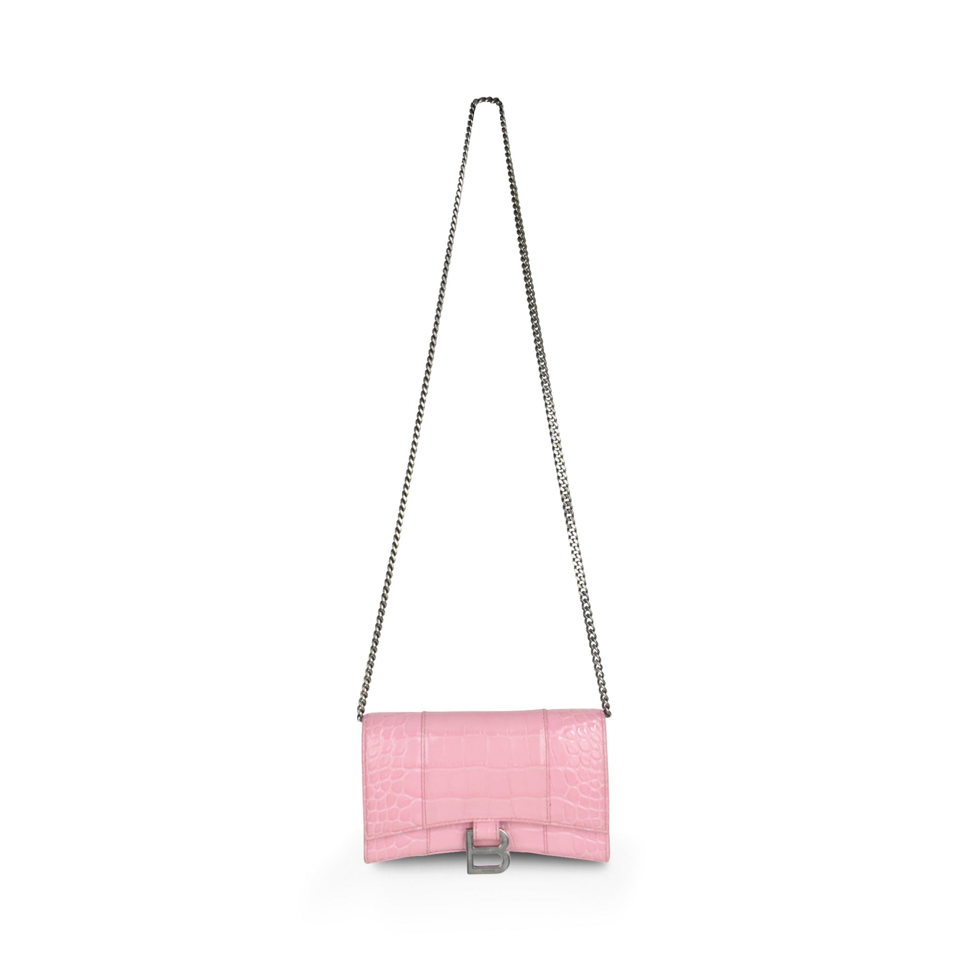 Balenciaga 'Hourglass on Chain' Bag is made of pink croc-embossed leather, silver 'B' hardware on the front magnetic flap closure and a chain shoulder strap. Features multiple inner card slots, a cash slot and an enclosed zip pocket with an open back pocket.