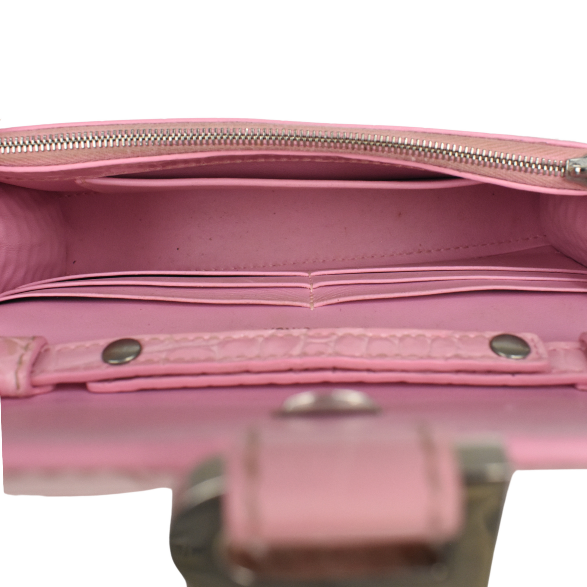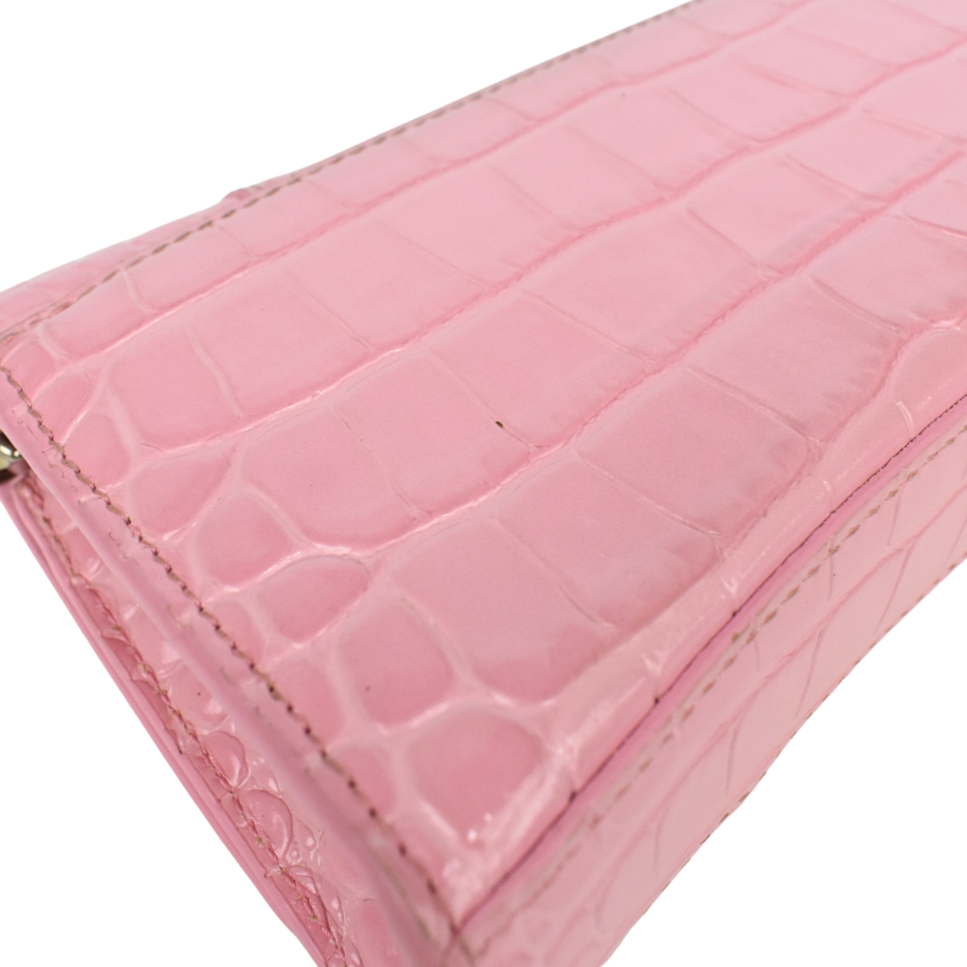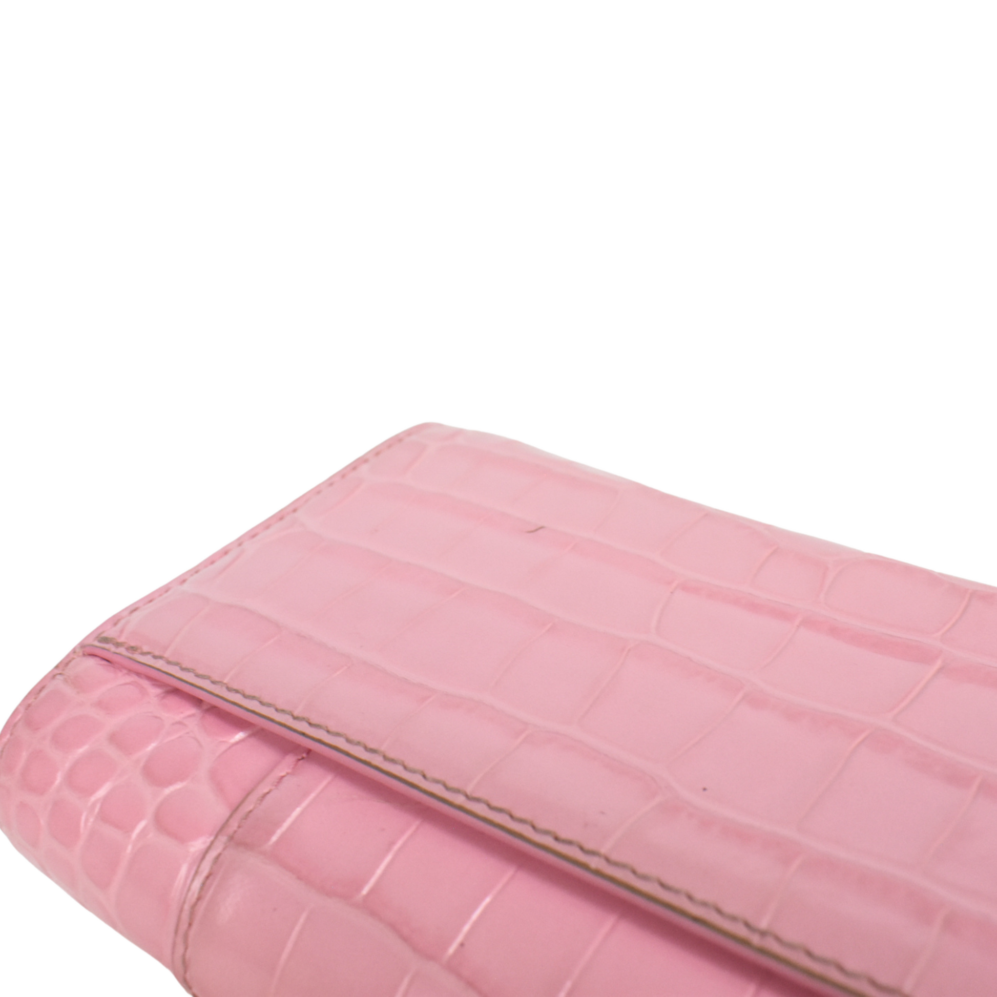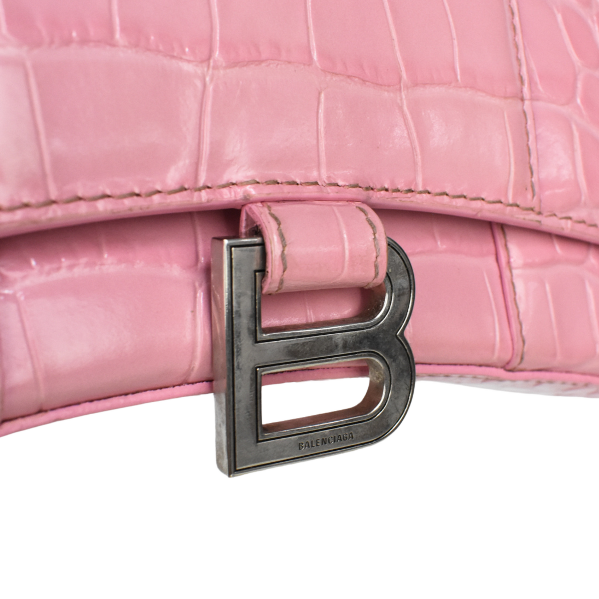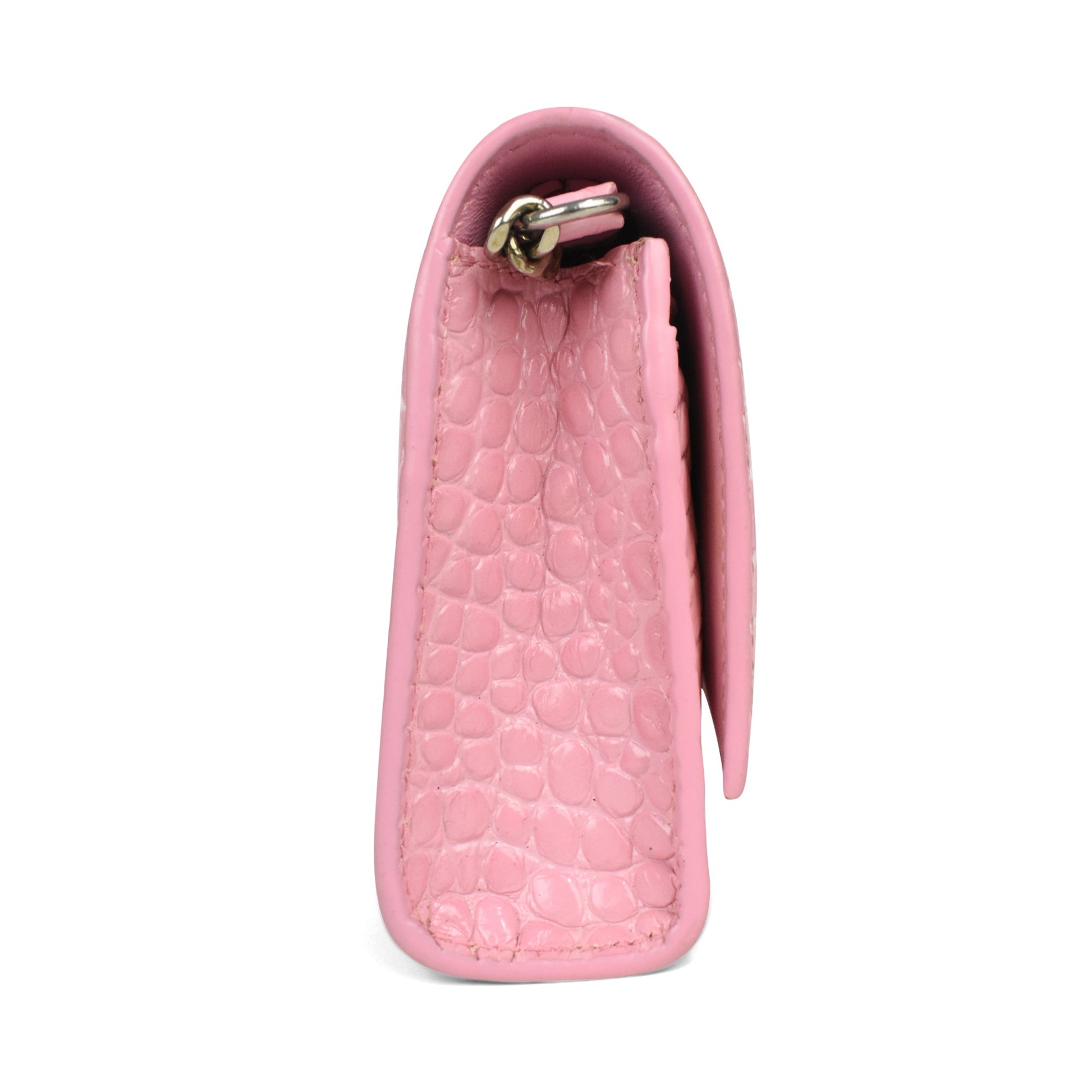 Balenciaga 'Hourglass on Chain' Bag is made of pink croc-embossed leather, silver 'B' hardware on the front magnetic flap closure and a chain shoulder strap. Features multiple inner card slots, a cash slot and an enclosed zip pocket with an open back pocket.
