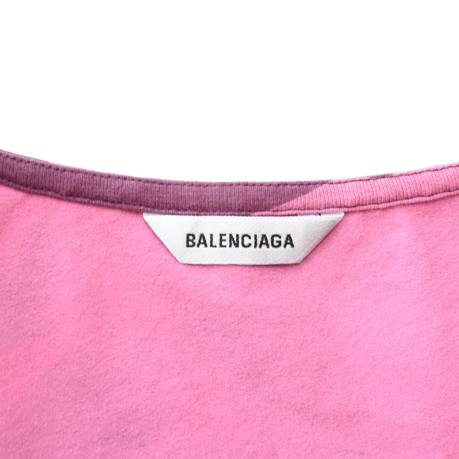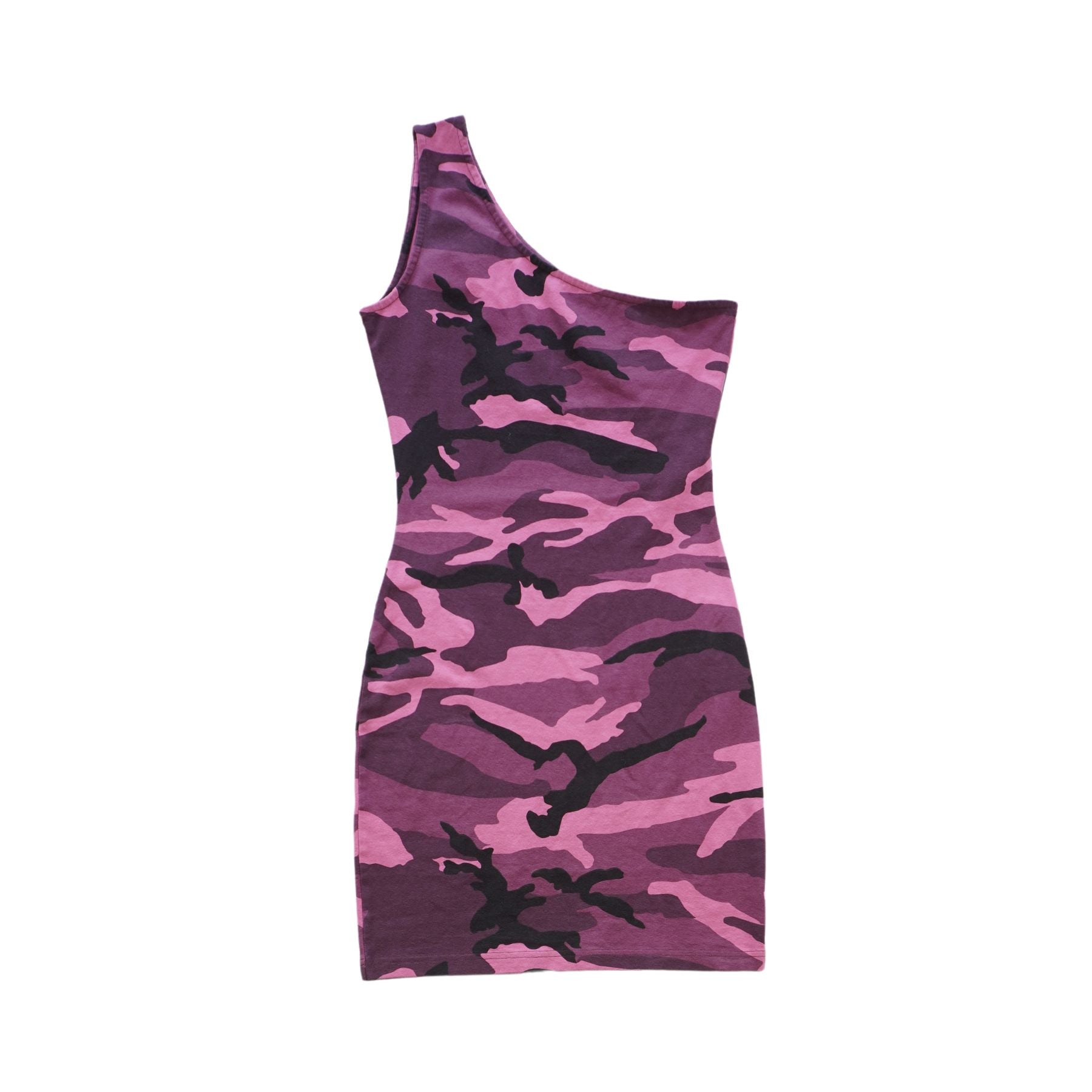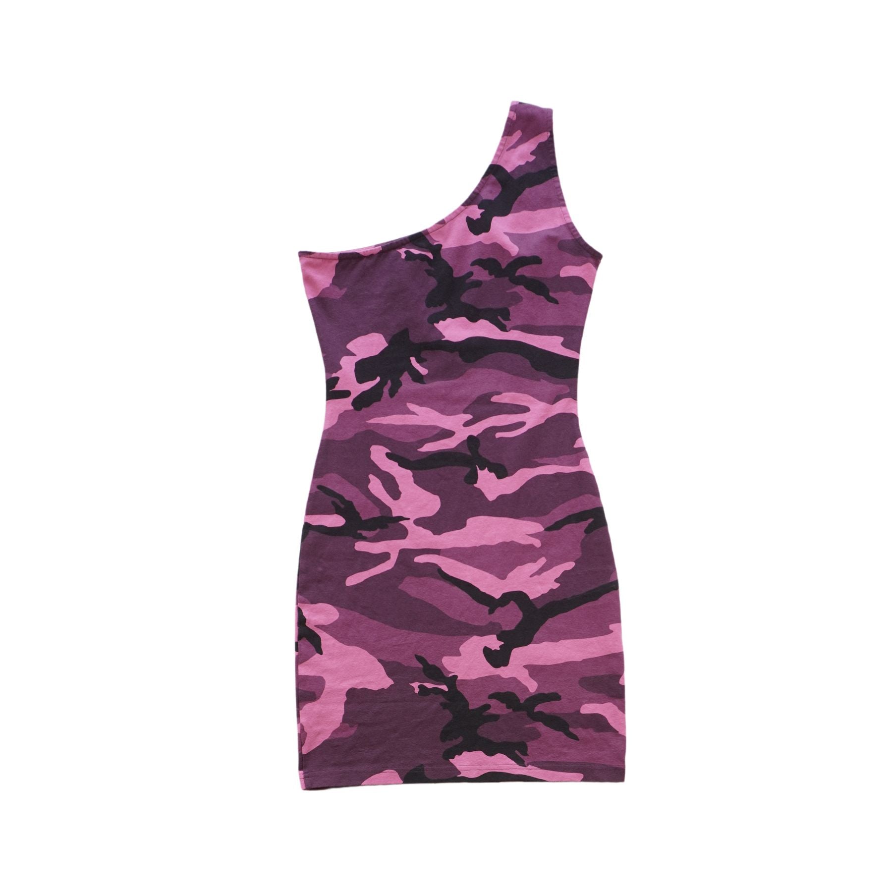 Balenciaga one-shoulder mini dress in all-over pink, purple, and black camouflage print.