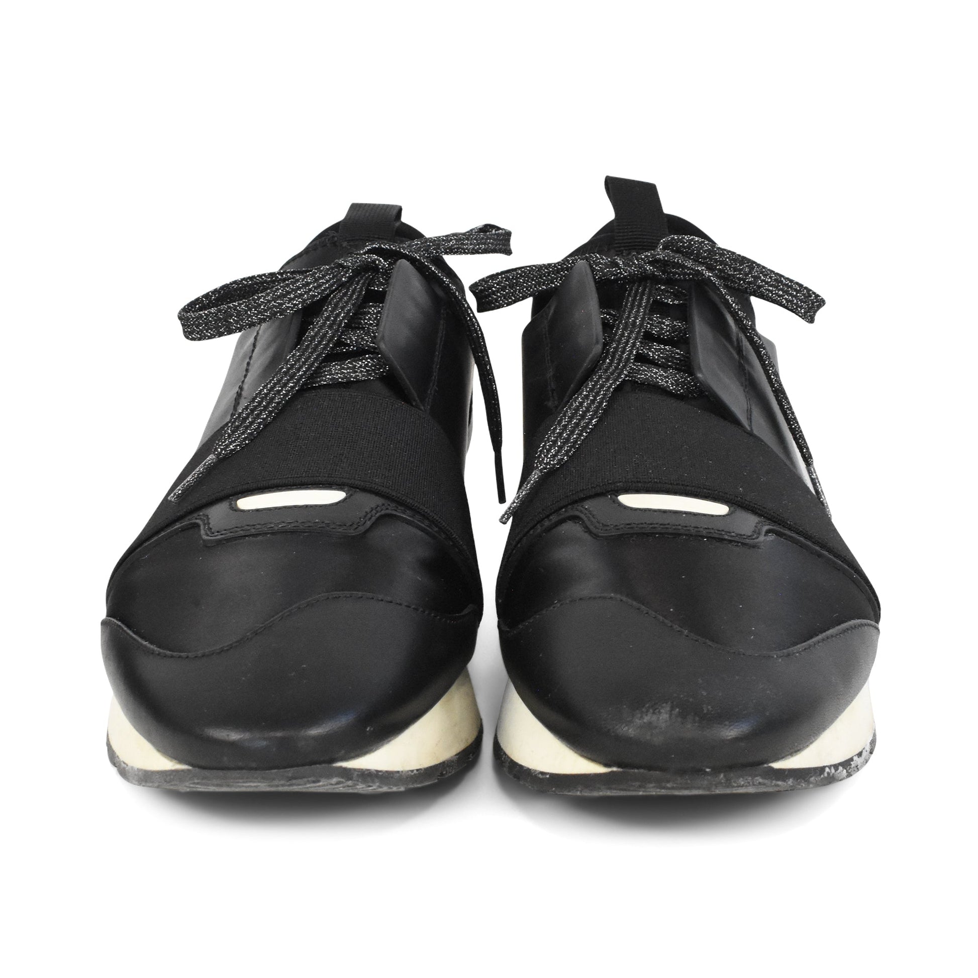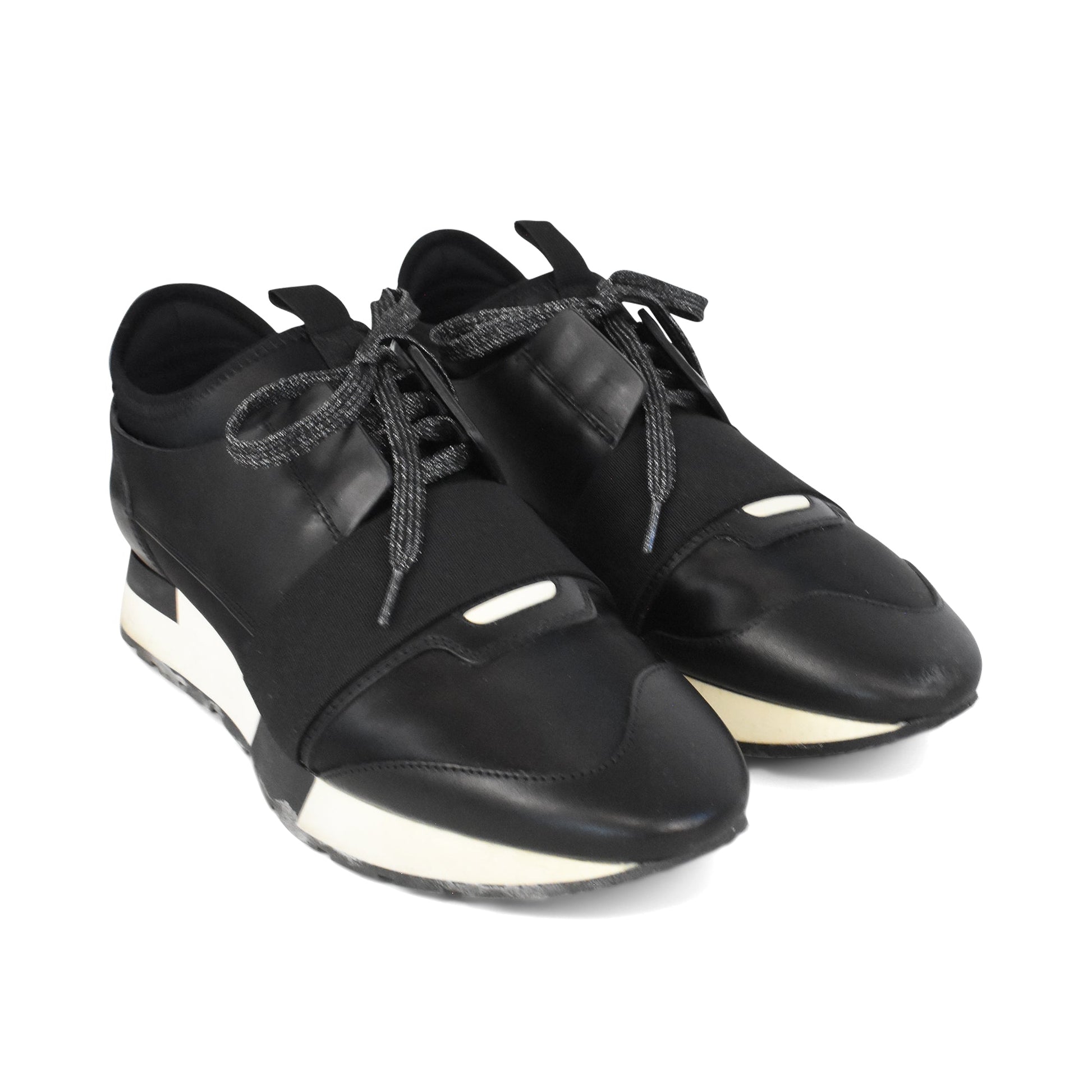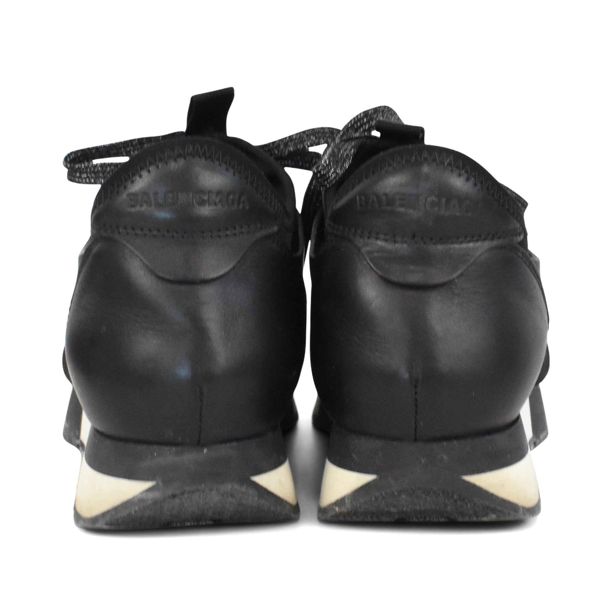 Balenciaga 'Race' sneakers in black leather and neoprene with metalic silver laces and a white sole.