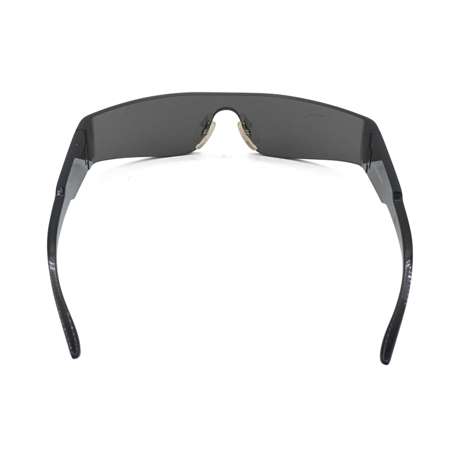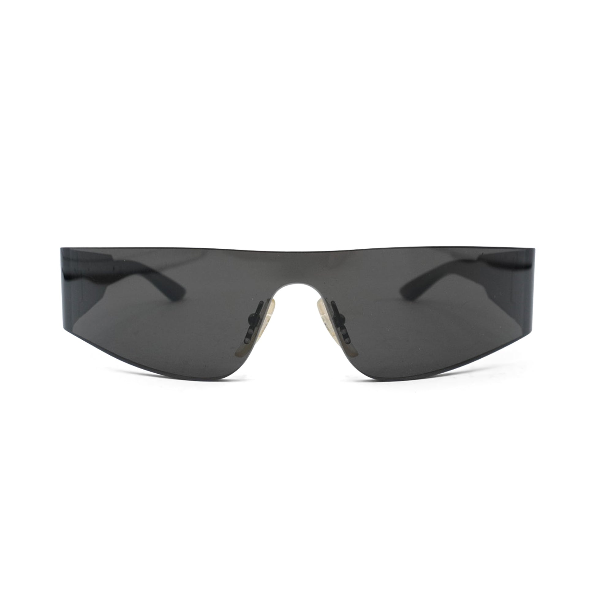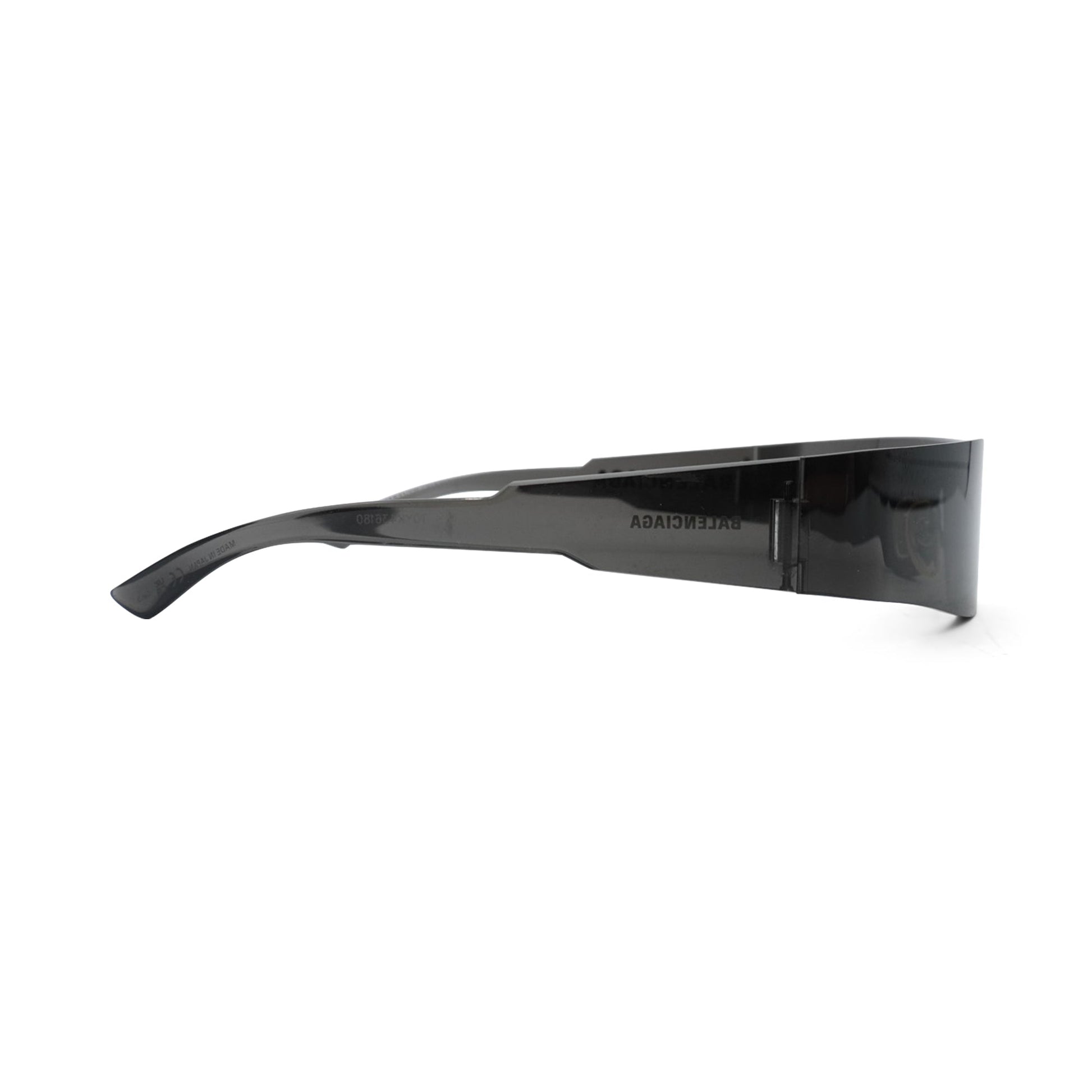 Balenciaga frameless shield sunglasses in black acetate with a narrow shield lens and a white logo on the left arm.