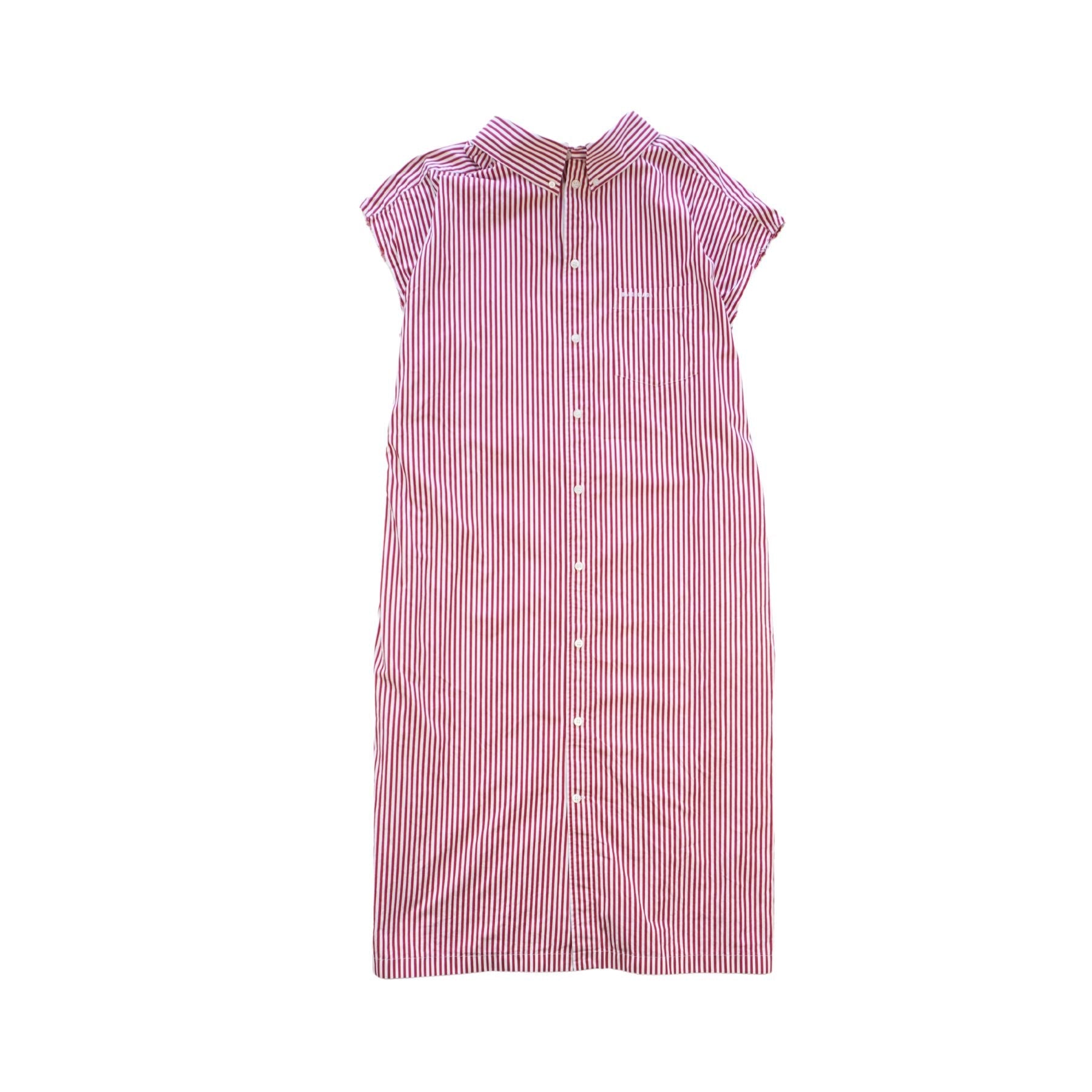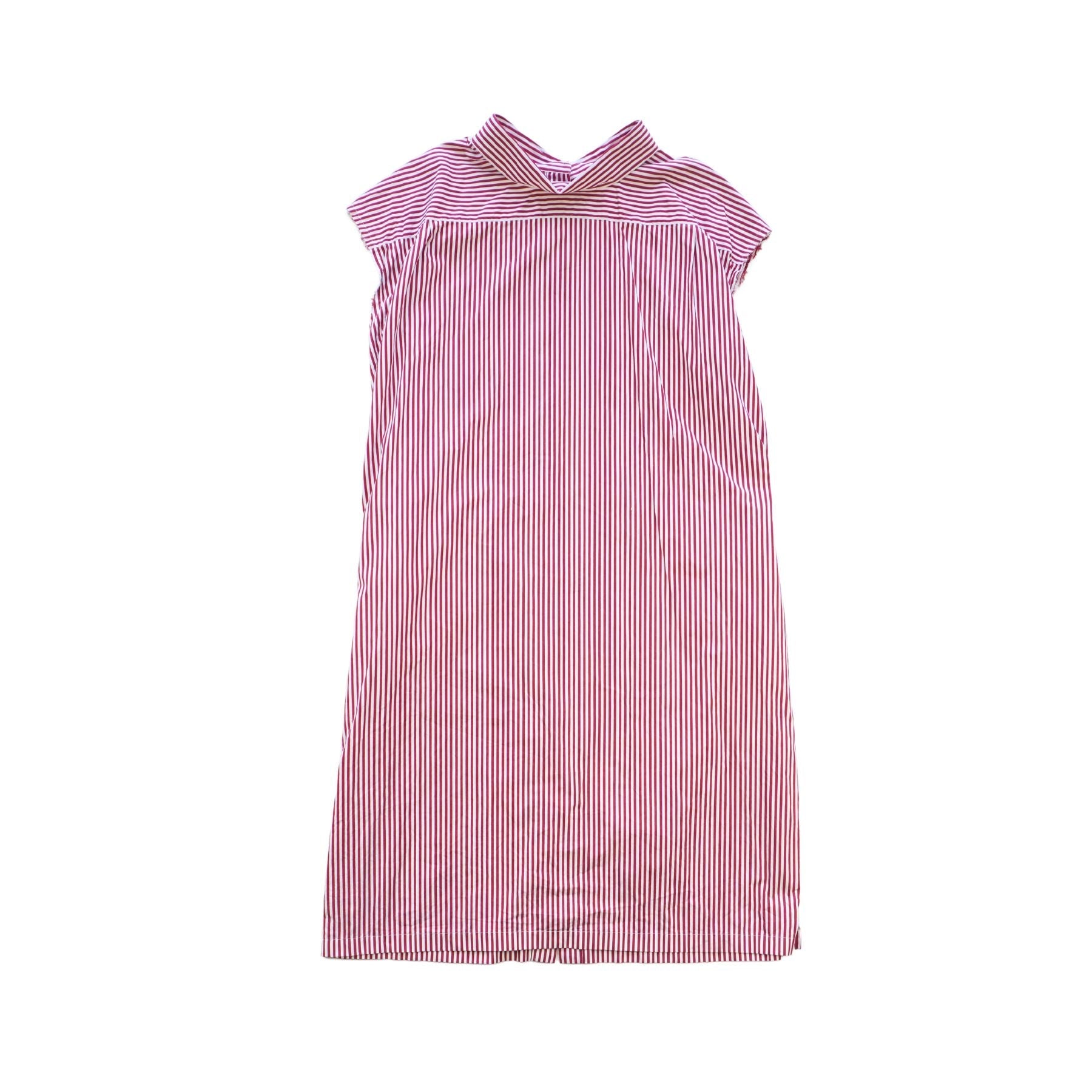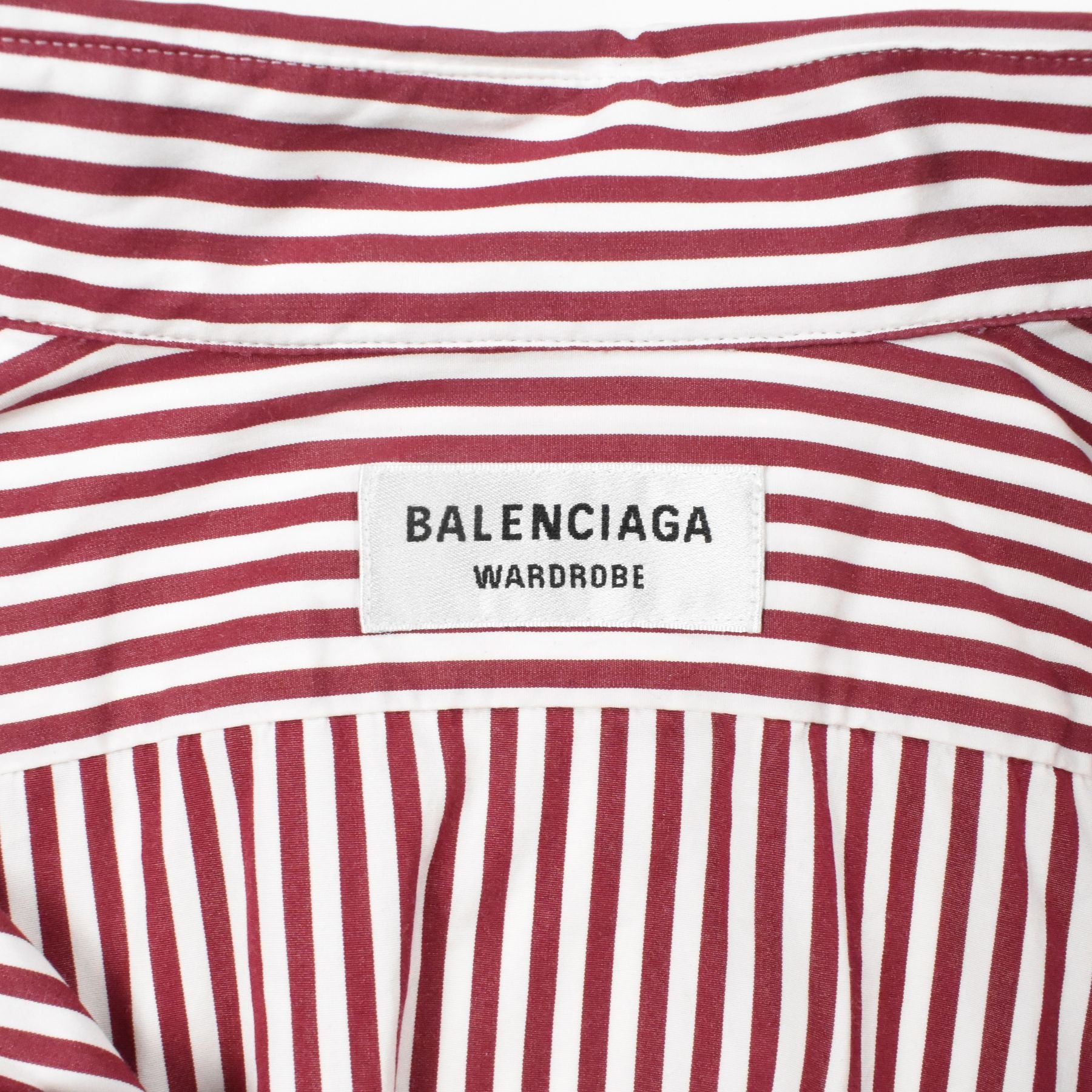 Balenciaga button-down midi dress in white and burgundy red striped cotton. Features frayed seams on the sleeves, a button-down closure with white pearled buttons, a breast pocket with white embroidered logo, and side slip pockets.