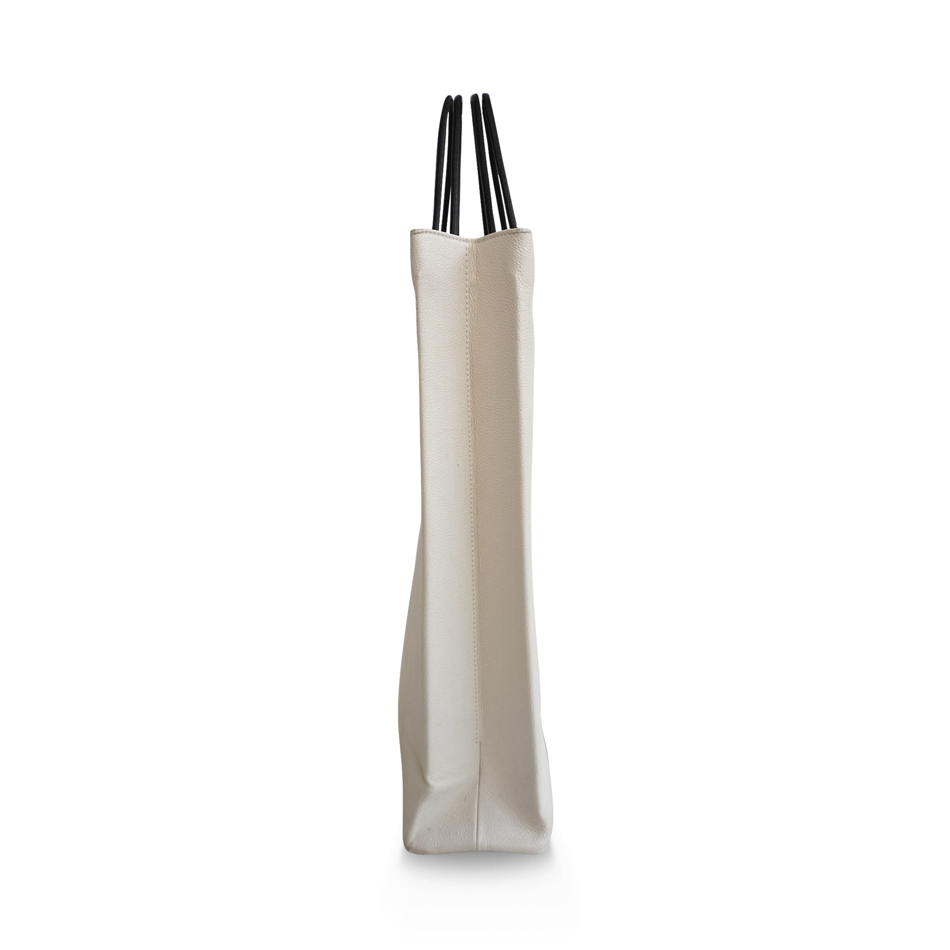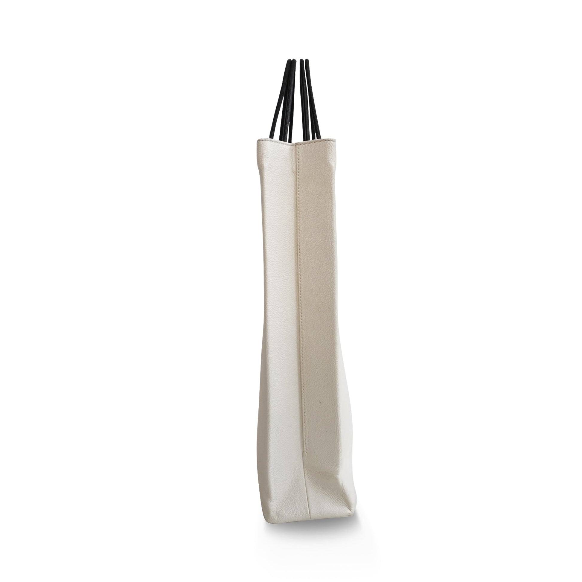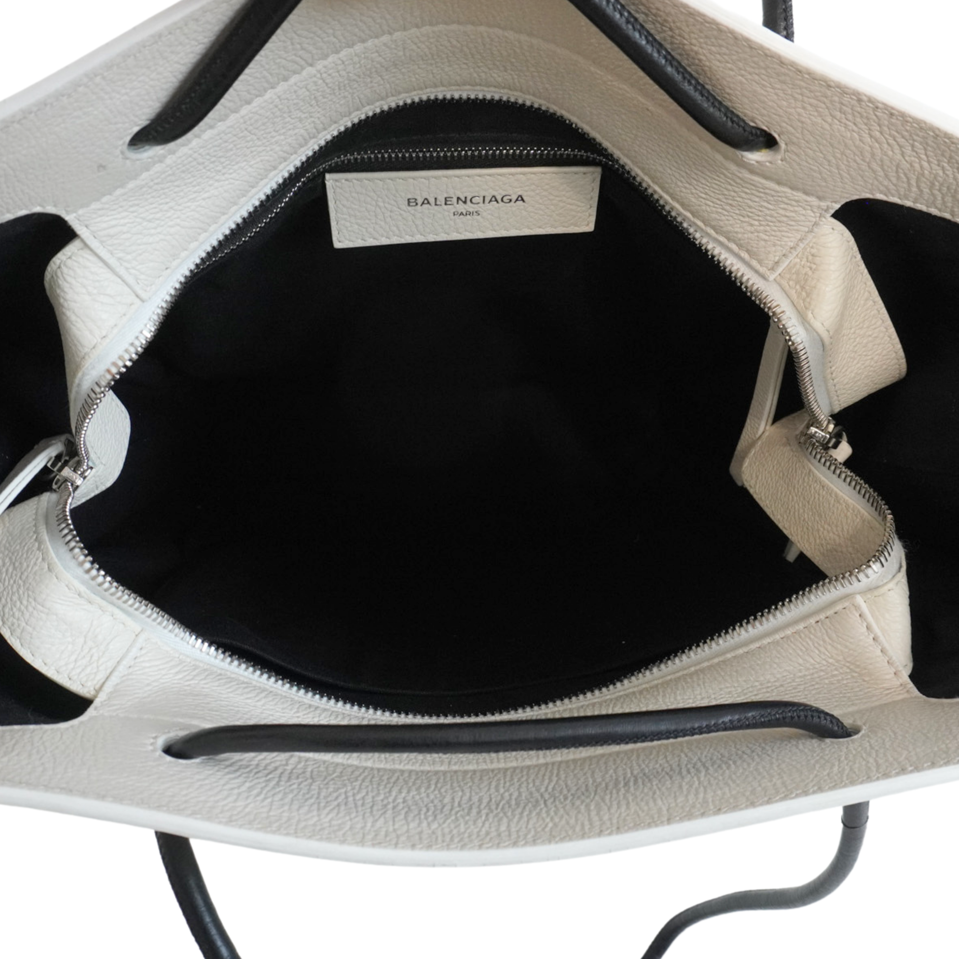 Balenciaga 'Shopping' tote bag in white grained leather with dual black rolled leather handles, a logo monogram across the front, and a top-zip closure in silver hardware revealing a black canvas interior with a zip and slip pocket.