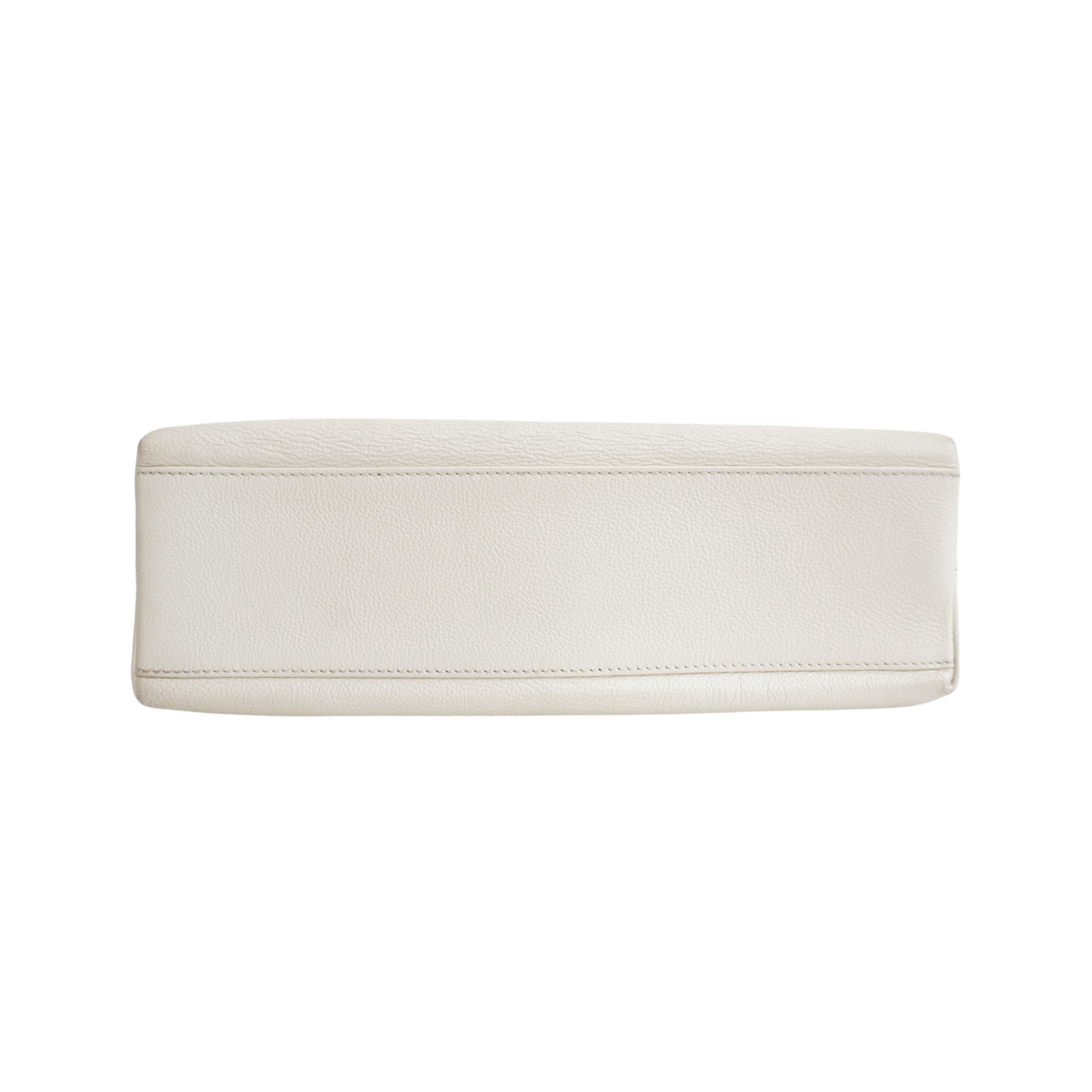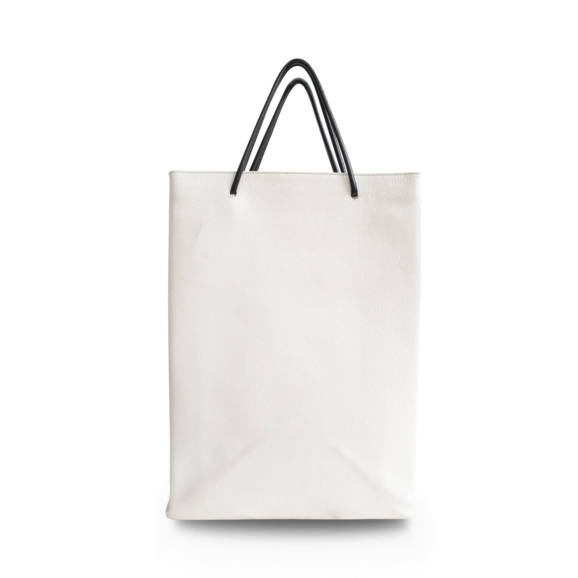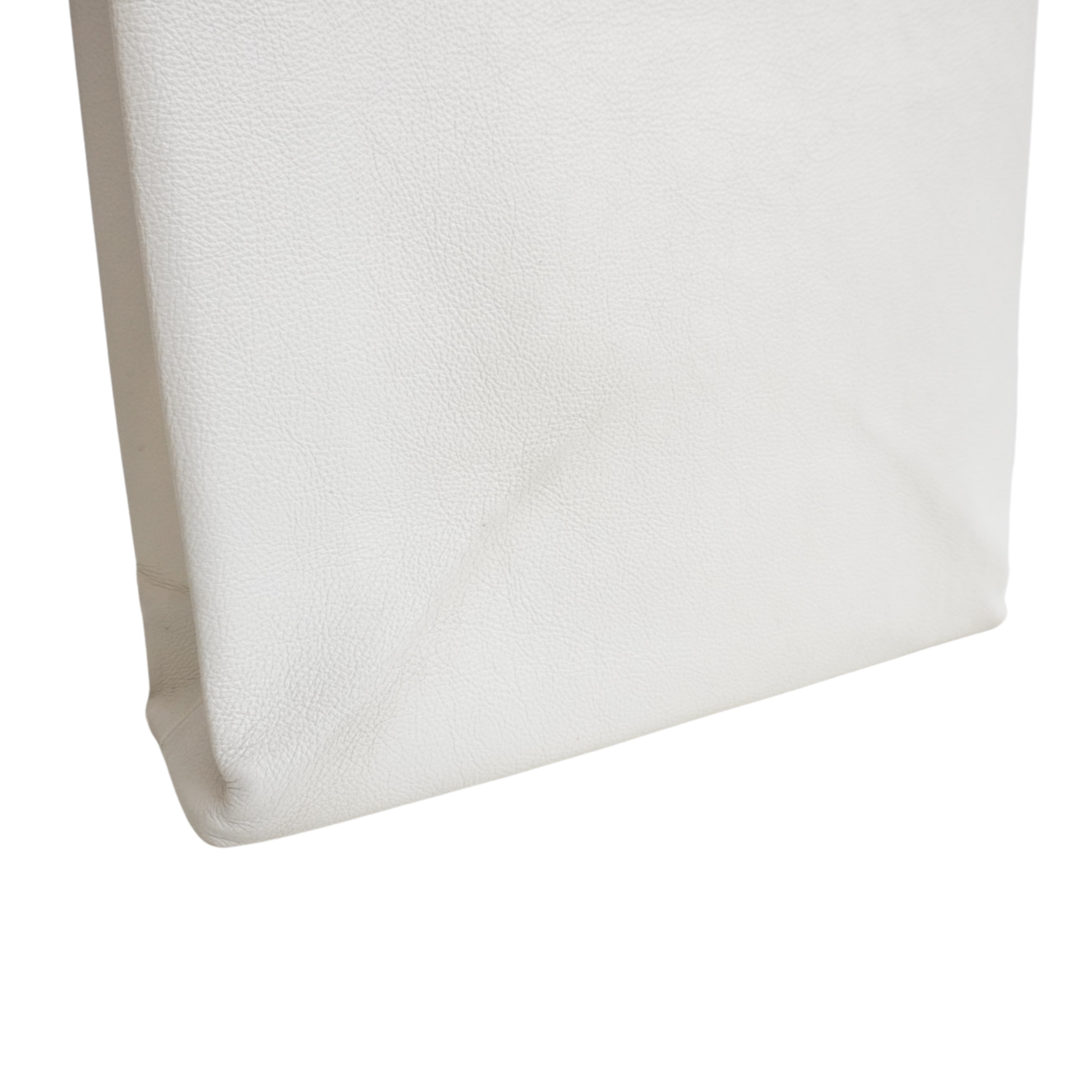 Balenciaga 'Shopping' tote bag in white grained leather with dual black rolled leather handles, a logo monogram across the front, and a top-zip closure in silver hardware revealing a black canvas interior with a zip and slip pocket.