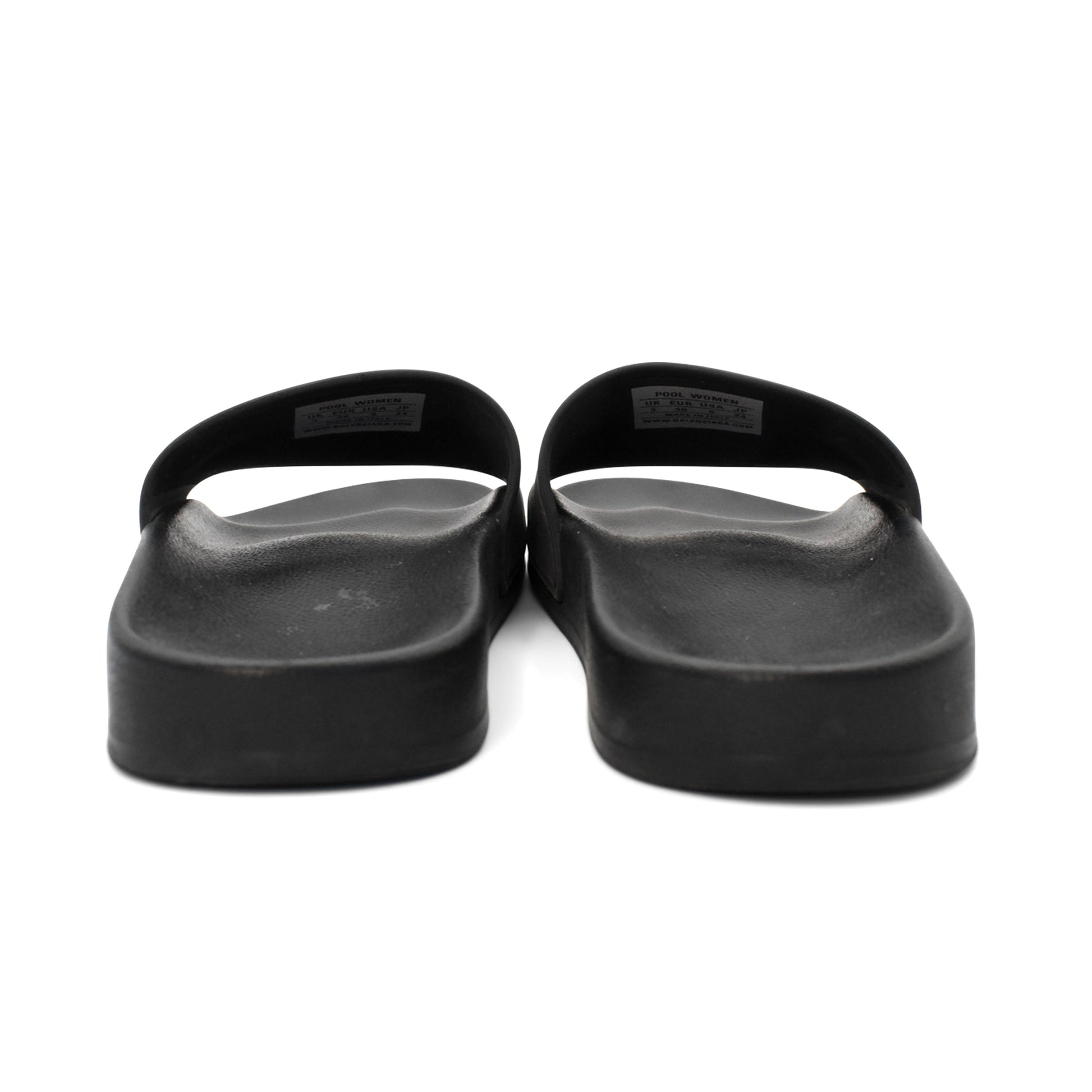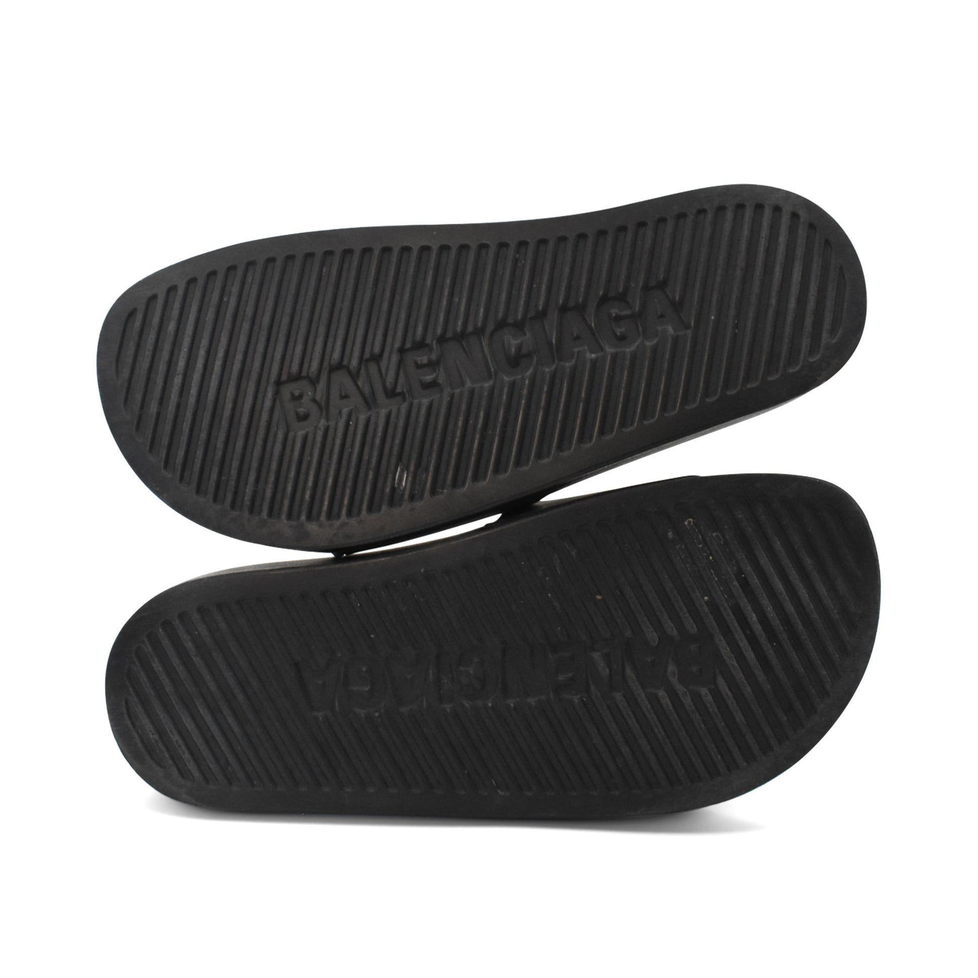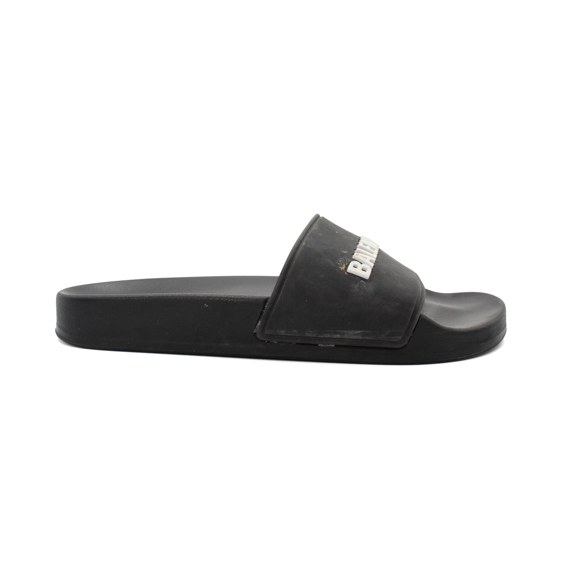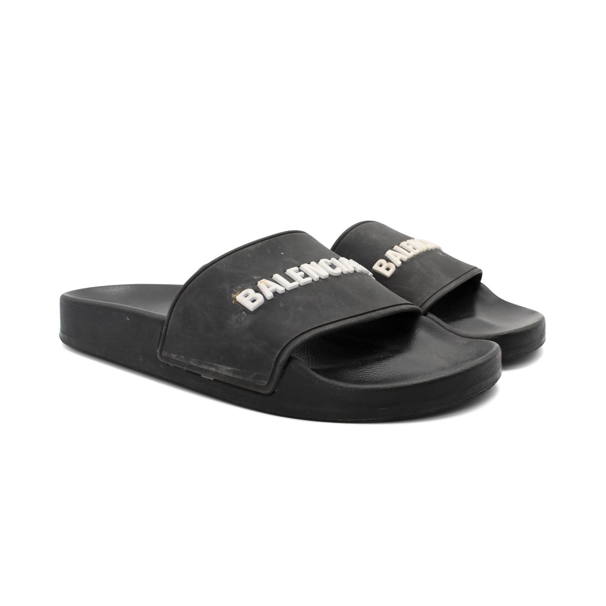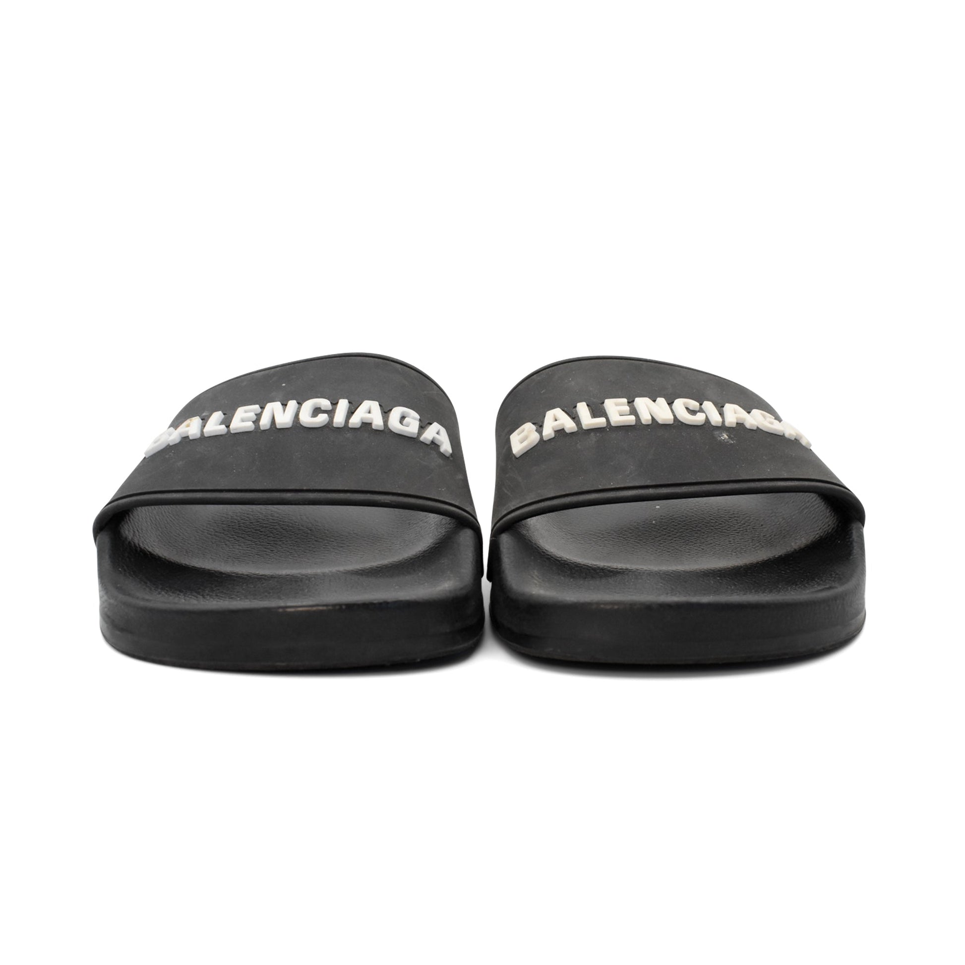 Balenciaga pool slides in black rubber with white raised logo on the toe strap.