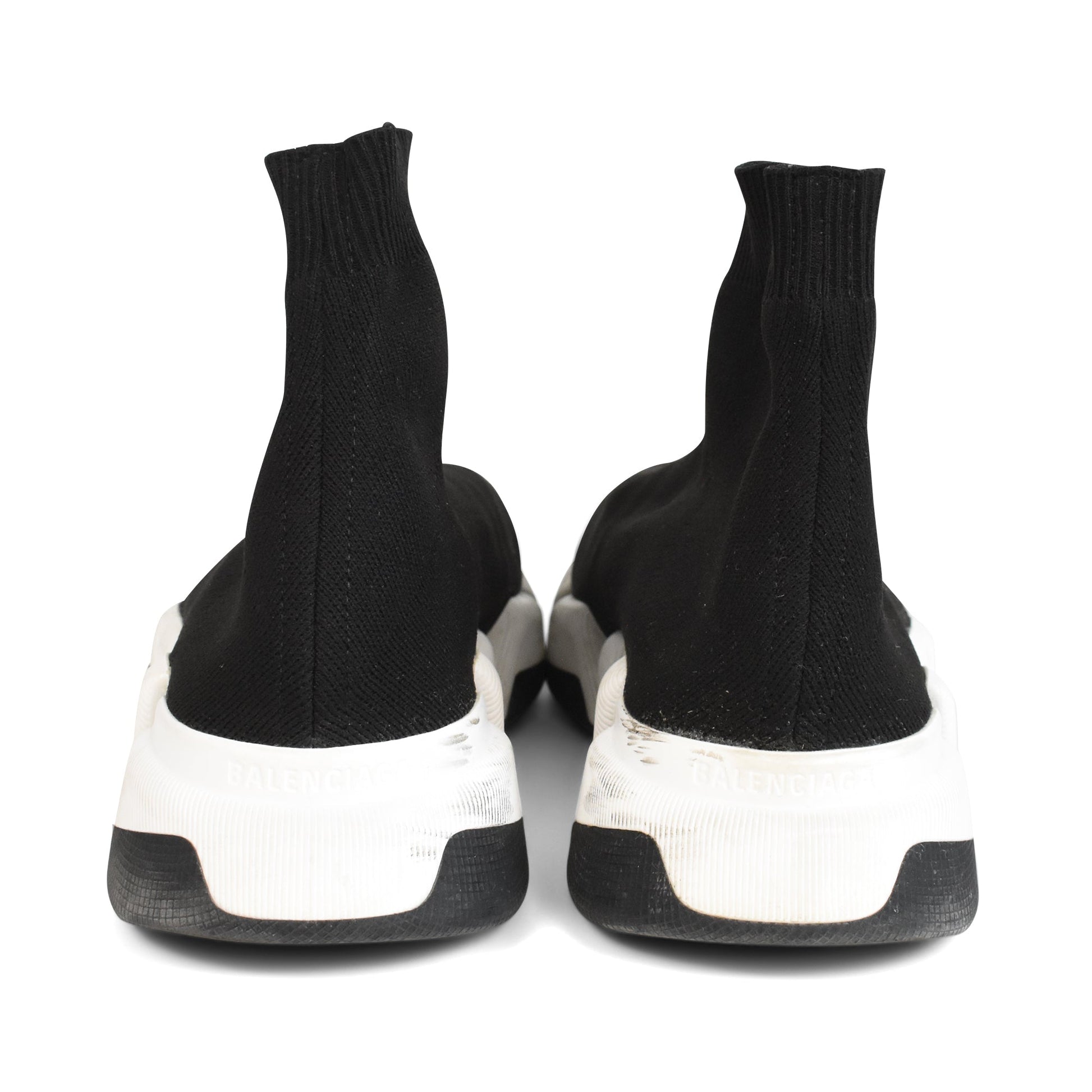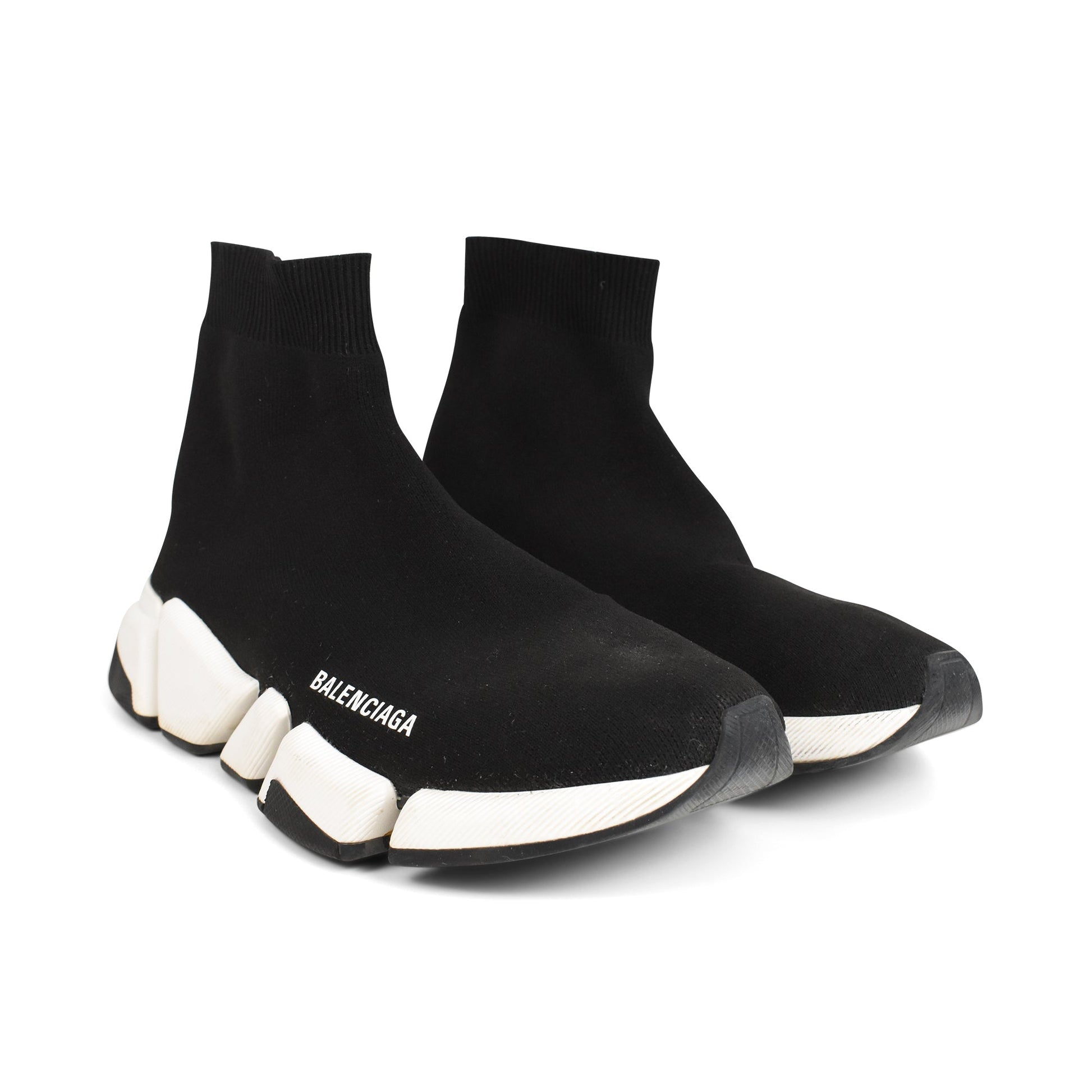 Balenciaga 'Speed Runner' high-top sock sneakers in black knit. Features a white and black rubber sole, slip-on design, and a white screen-printed logo on the side.