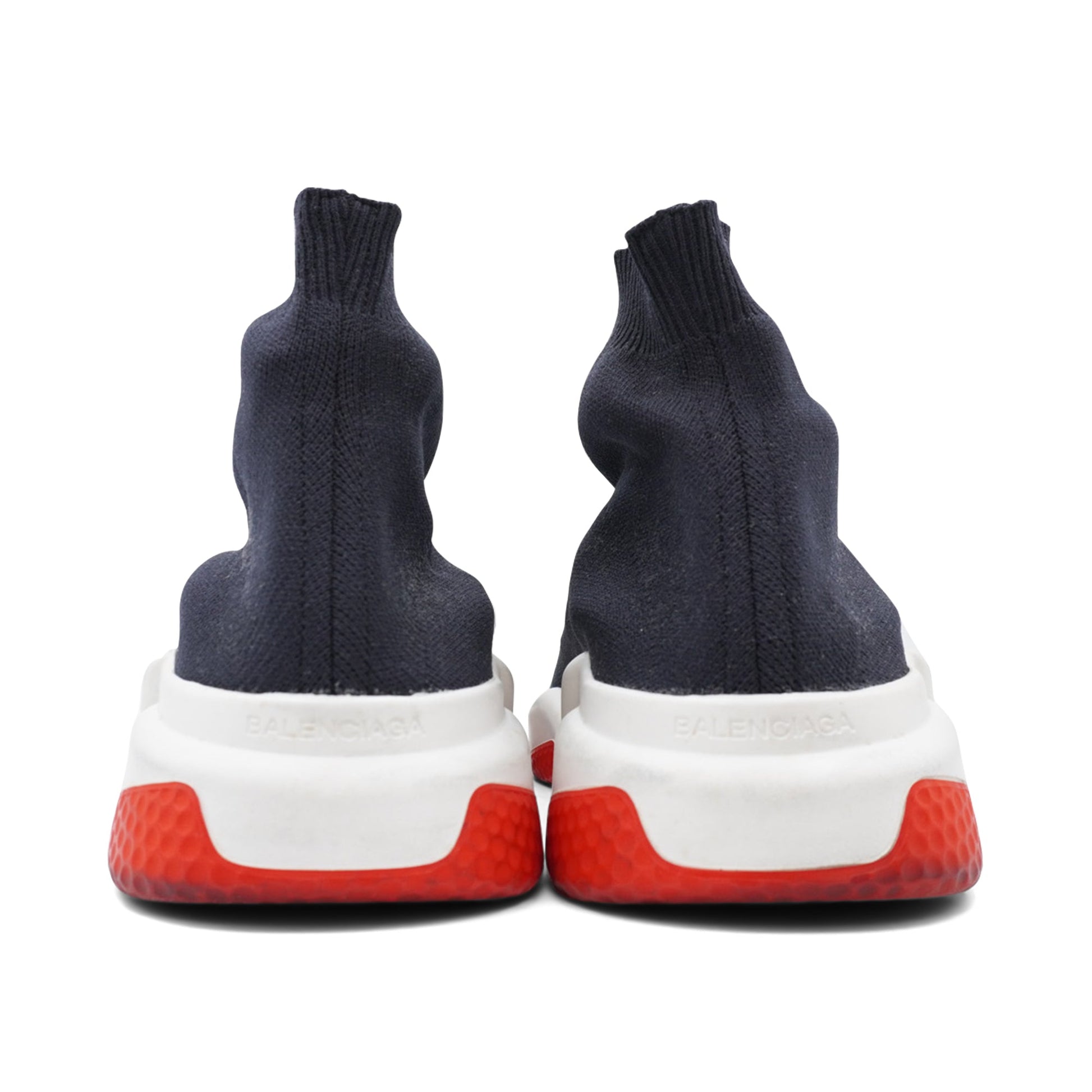 Balenciaga 'Speed Trainer' sock sneakers in navy knit with a white logo on the side and a red and white rubber sole.