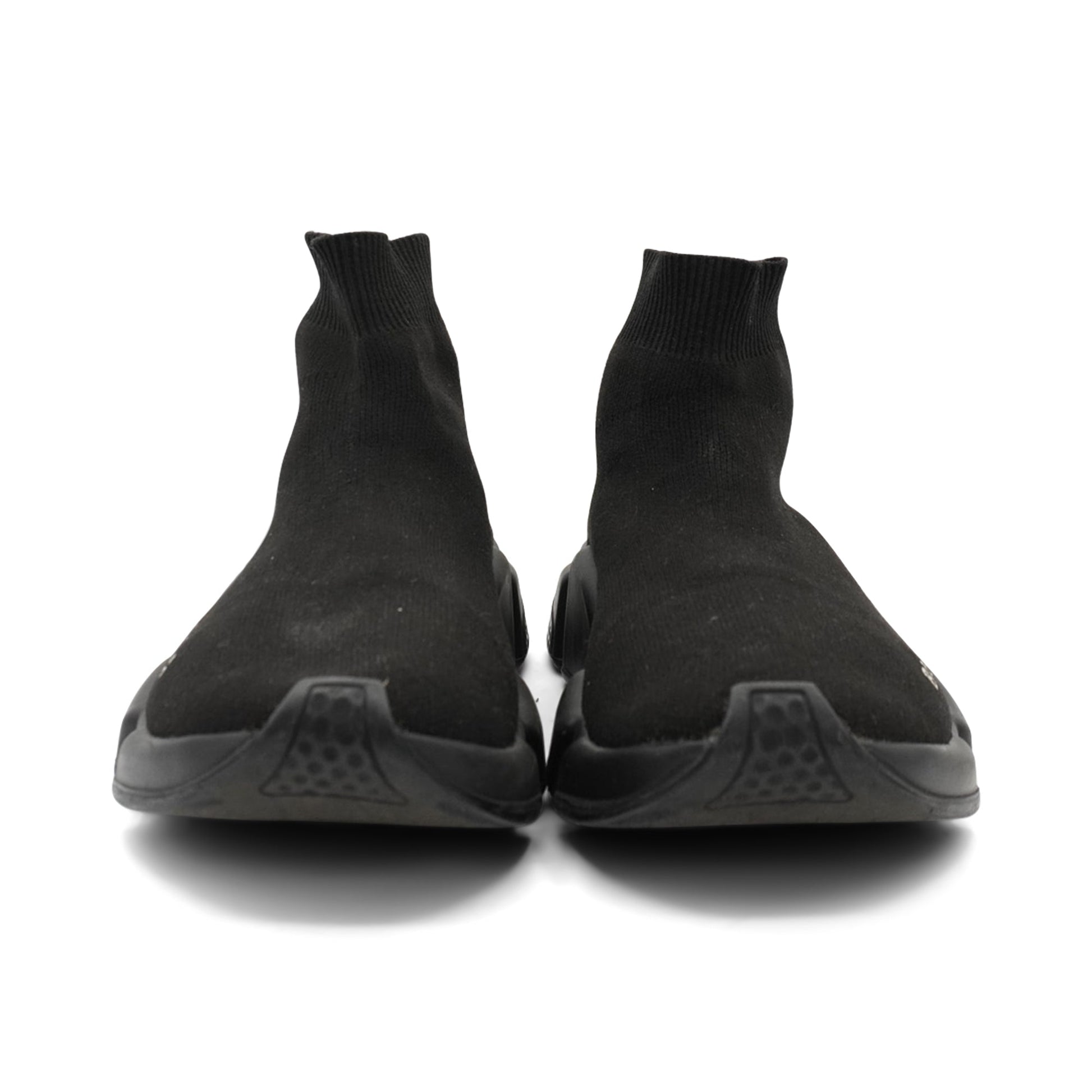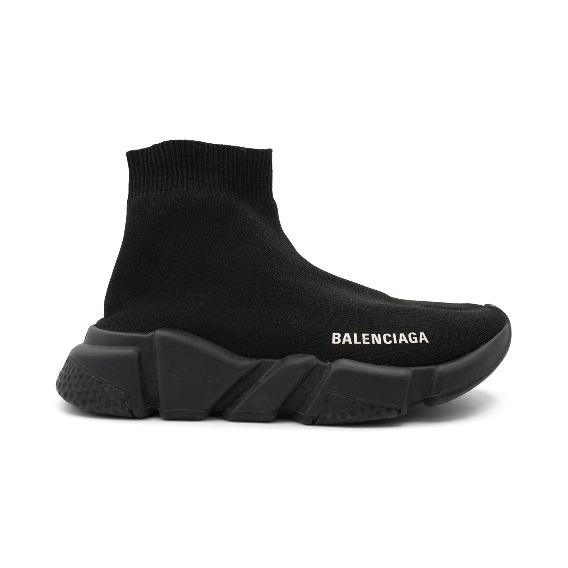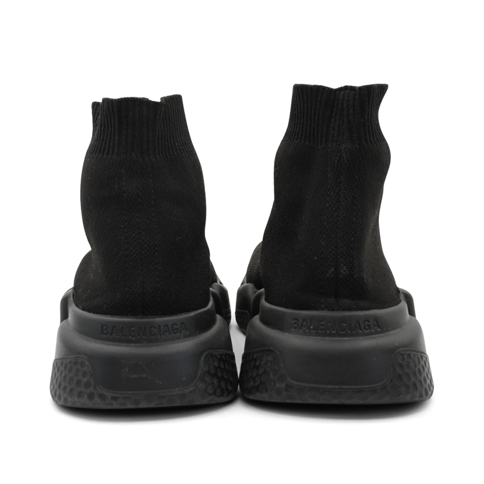 Balenciaga 'Speed' sock sneakers in black knit with a black rubber sole and a white logo monogram on the toe.