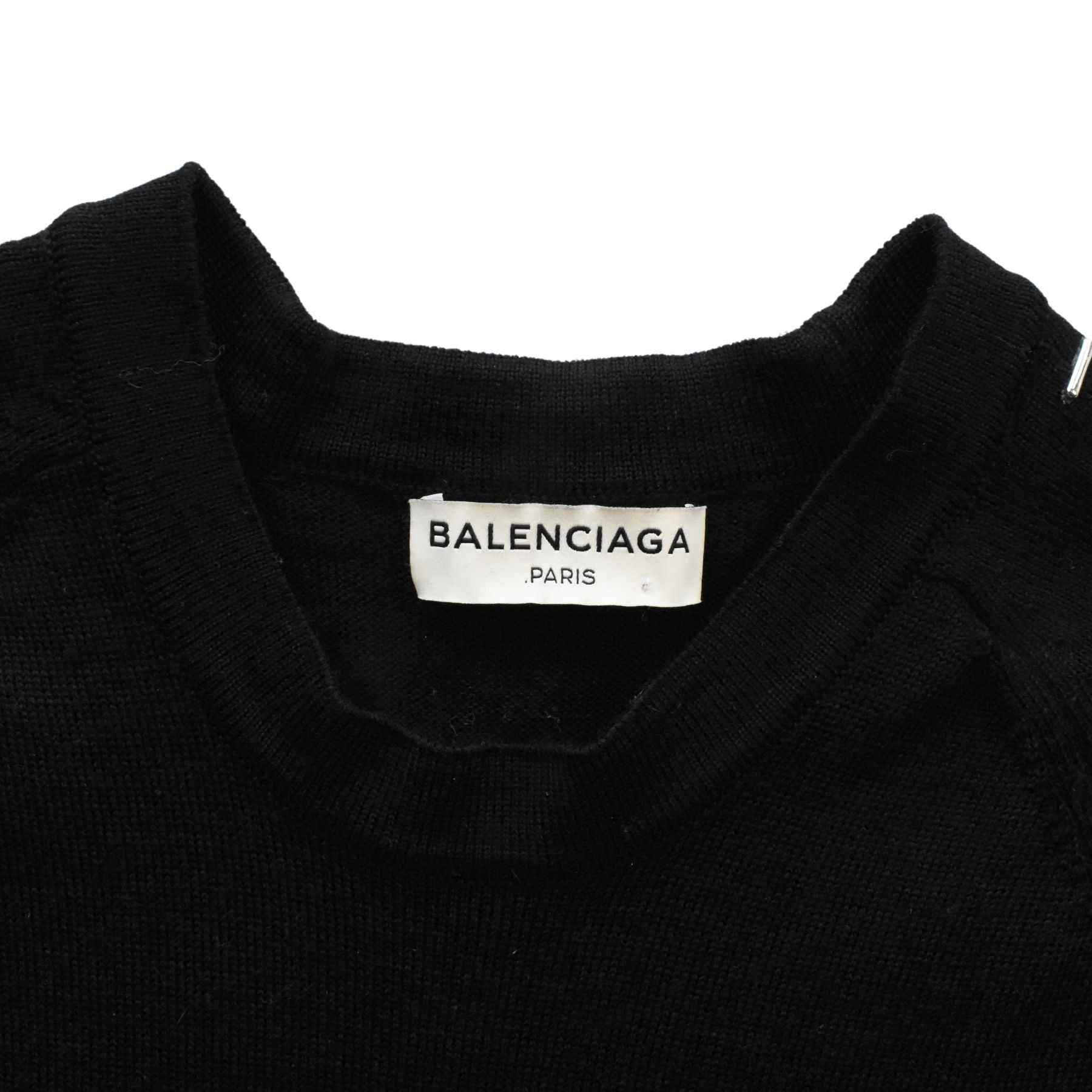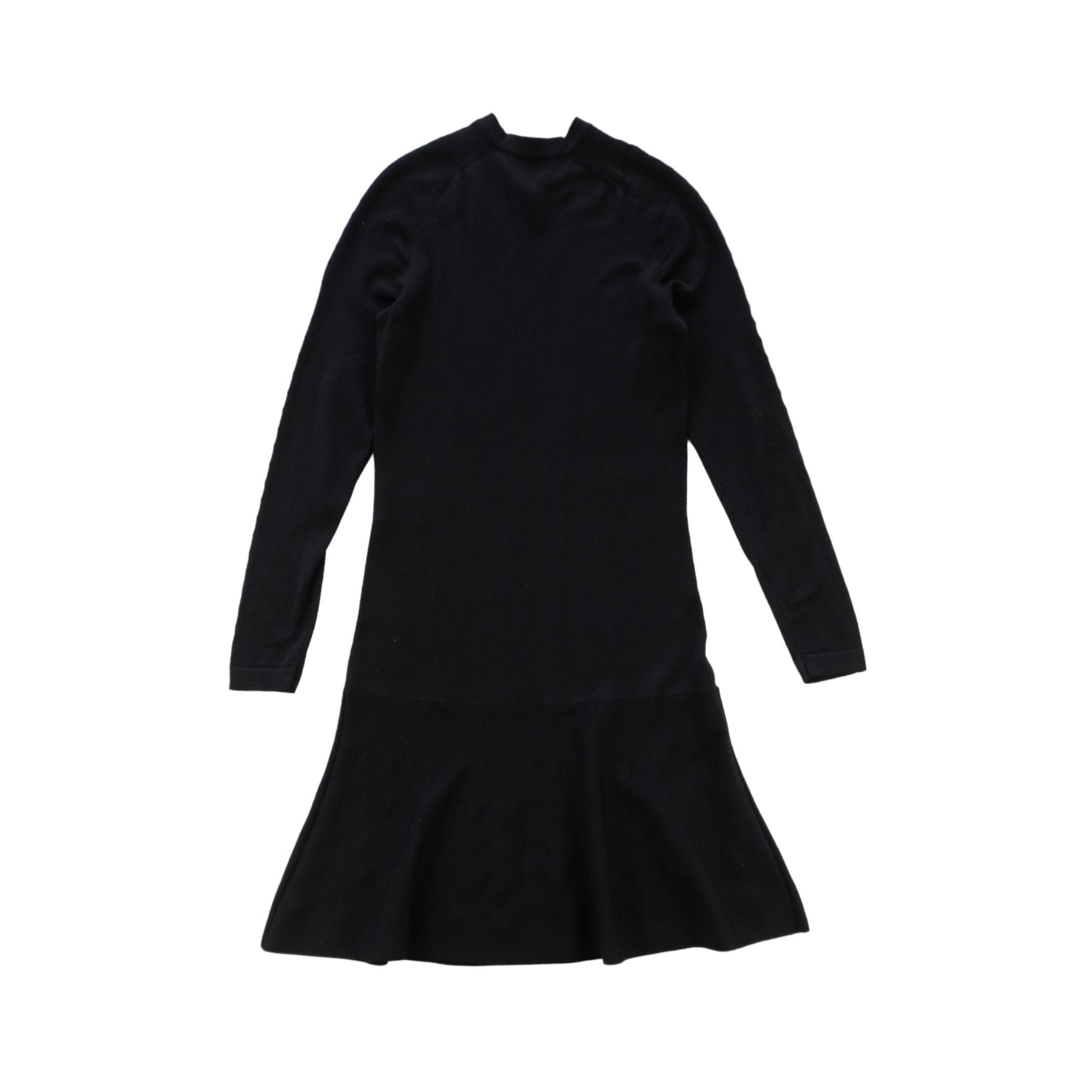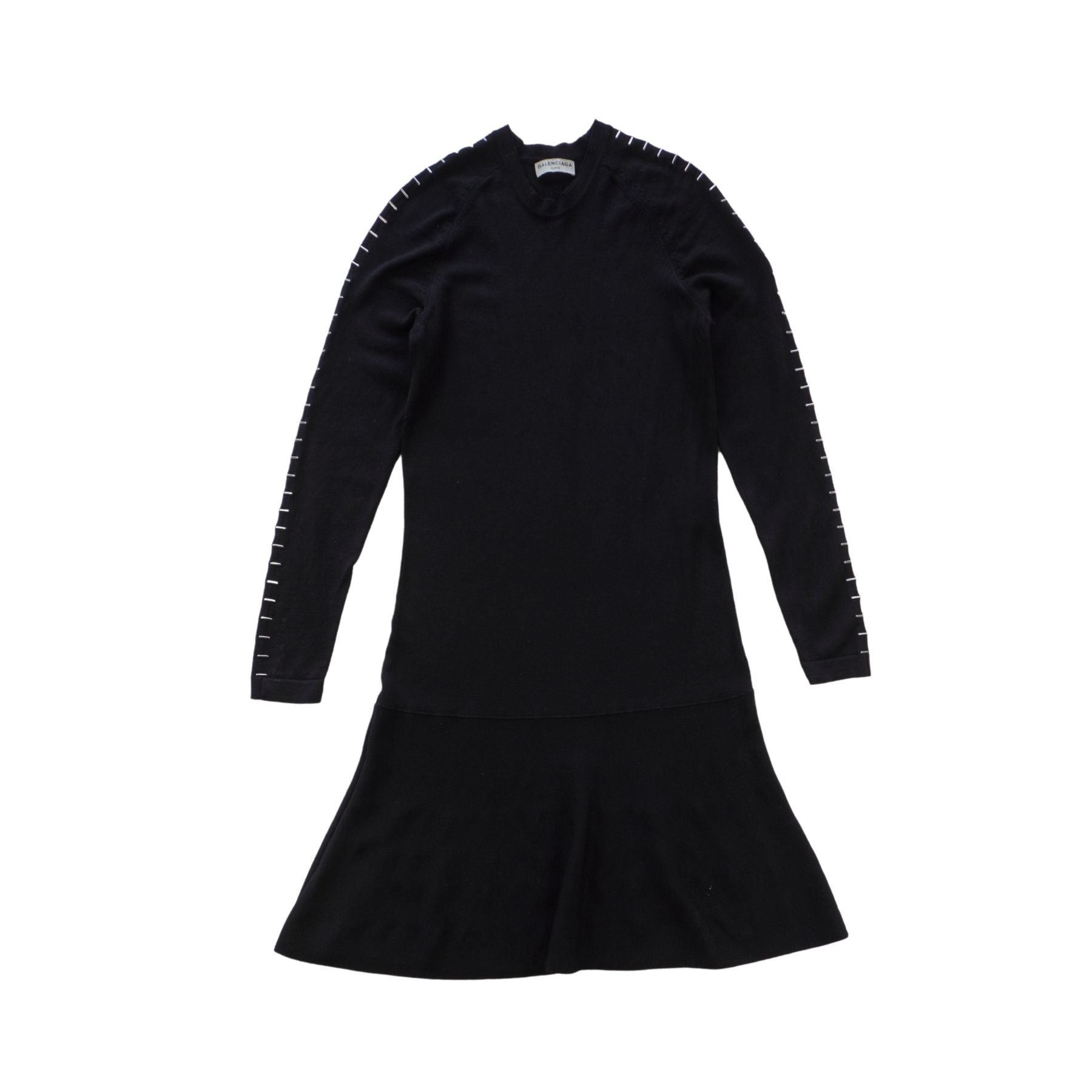 Balenciaga long-sleeve knee-length dress in black wool with a high neckline. Features a drop waist with a flared skirt and silver staple details along the sleeves to the neckline.