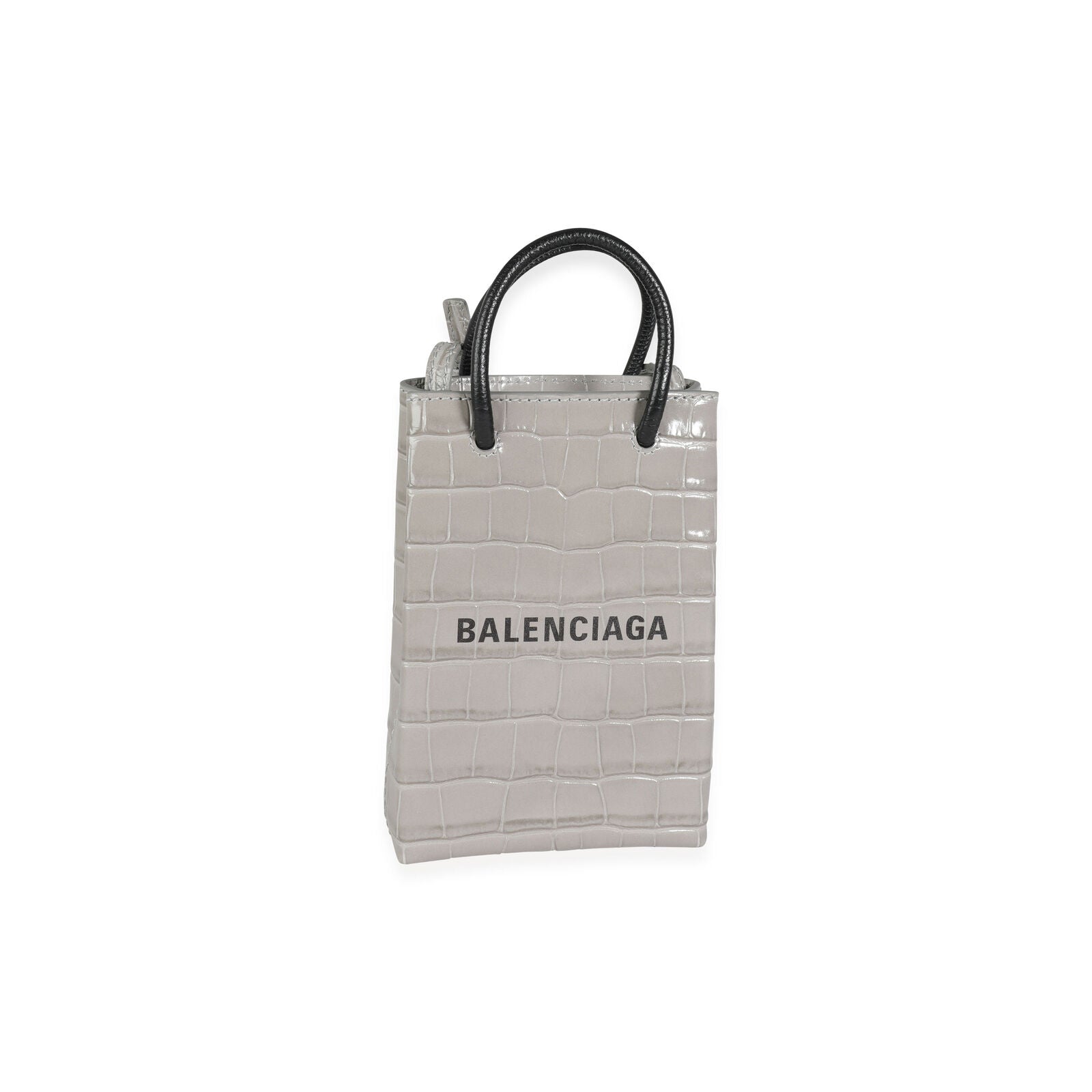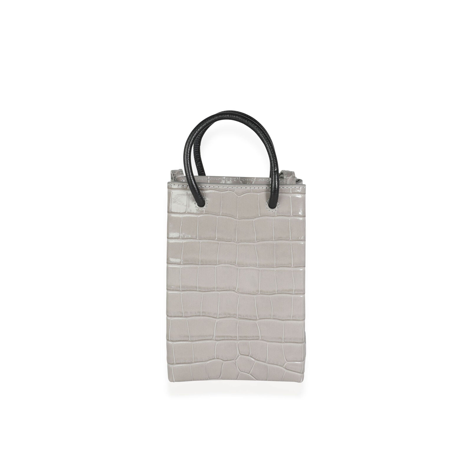 BALENCIAGA STEEL GREY CROC-EMBOSSED SHOPPING PHONE HOLDER BAG