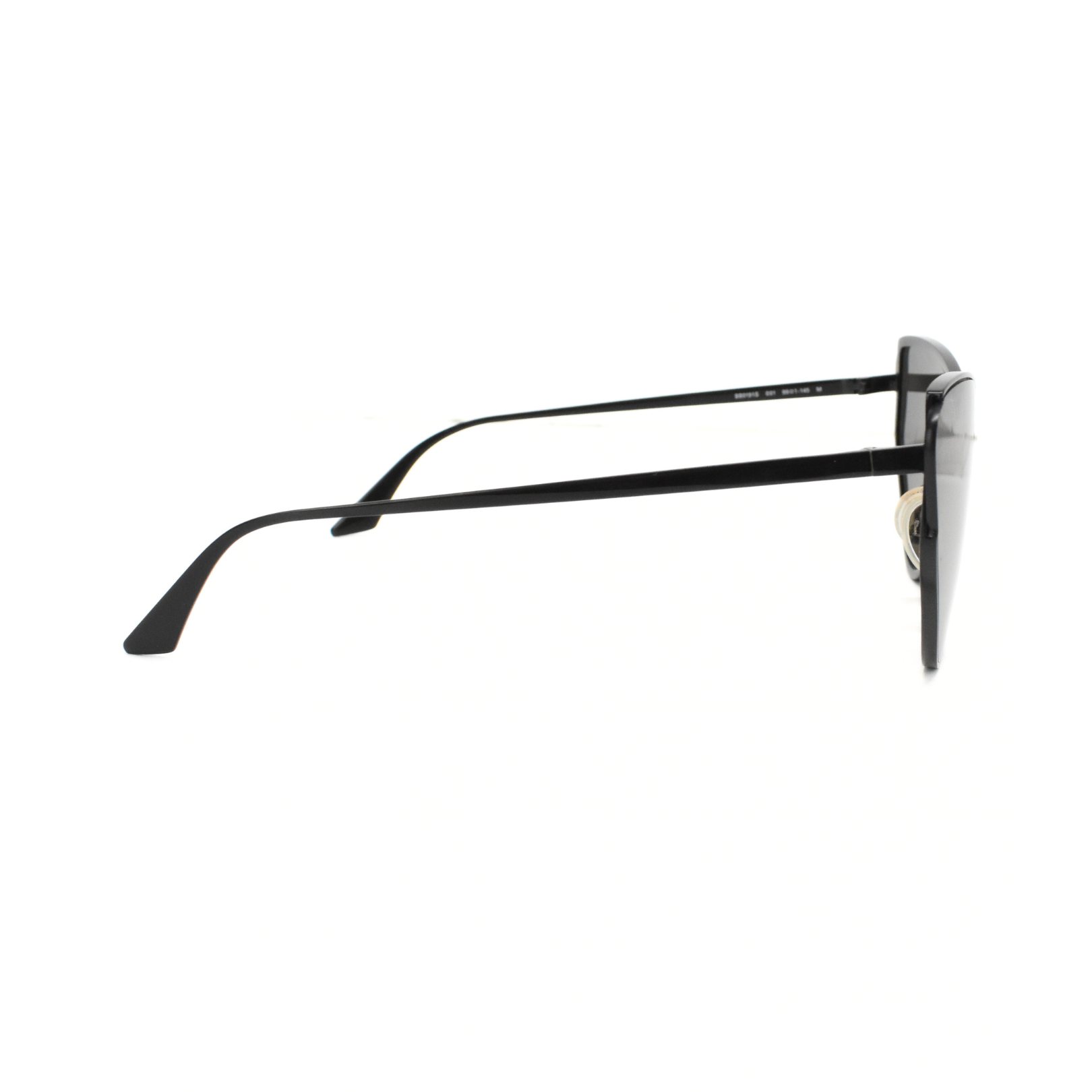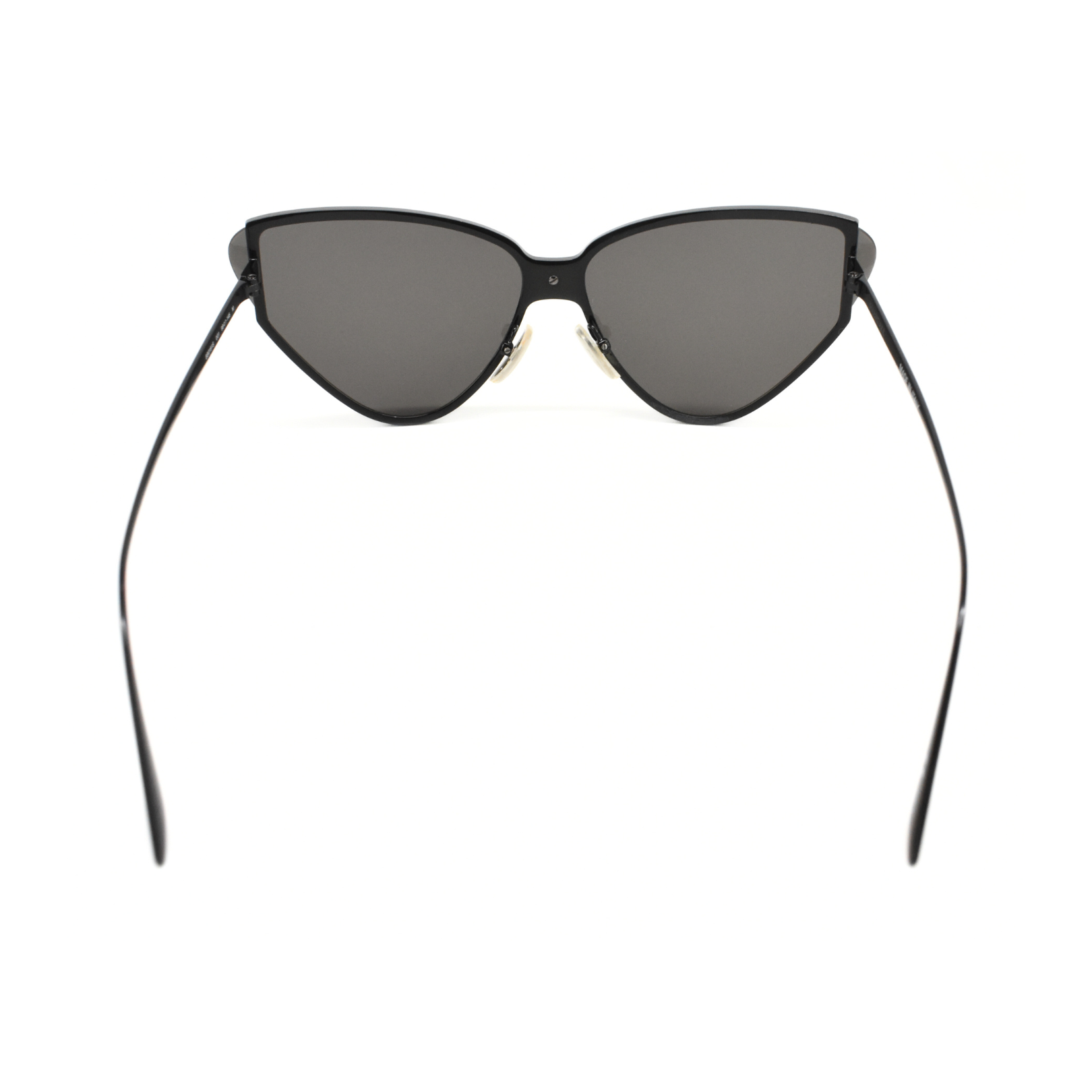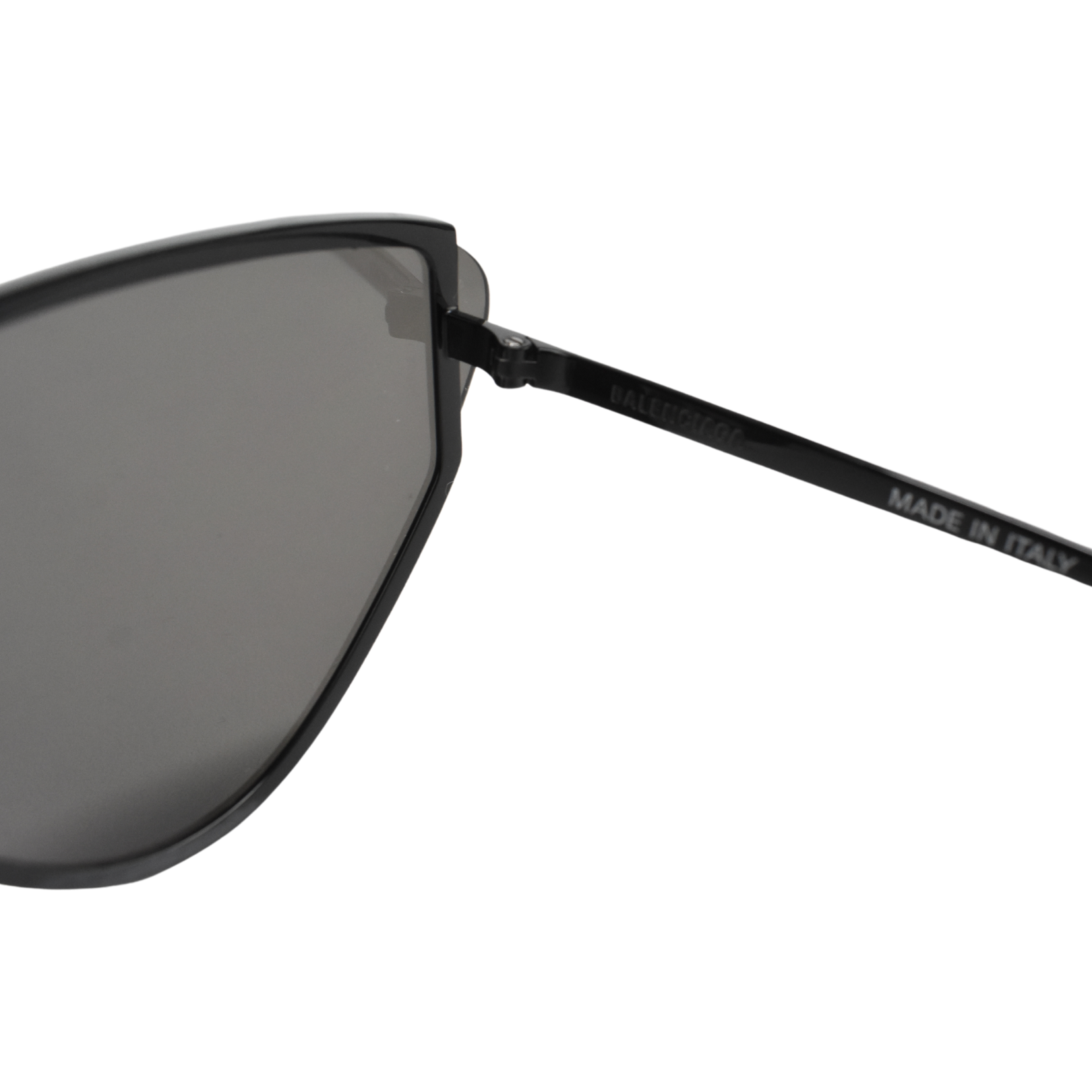 Balenciaga sunglasses in black metal with large black lenses in an exaggerated cat eye-shape, a silver 'BB' monogram on the nose, and a white 'BALENCIAGA' logo on the arms.