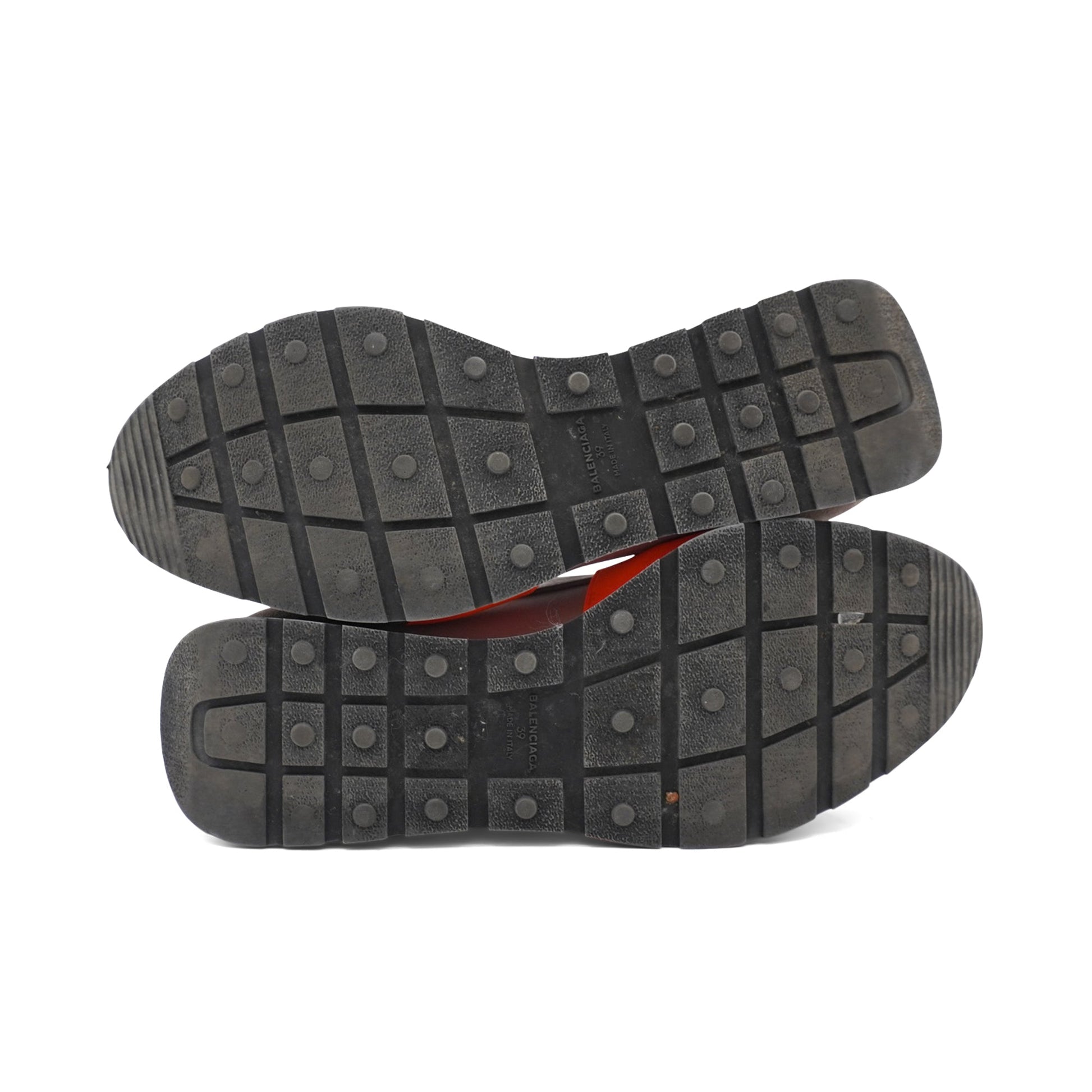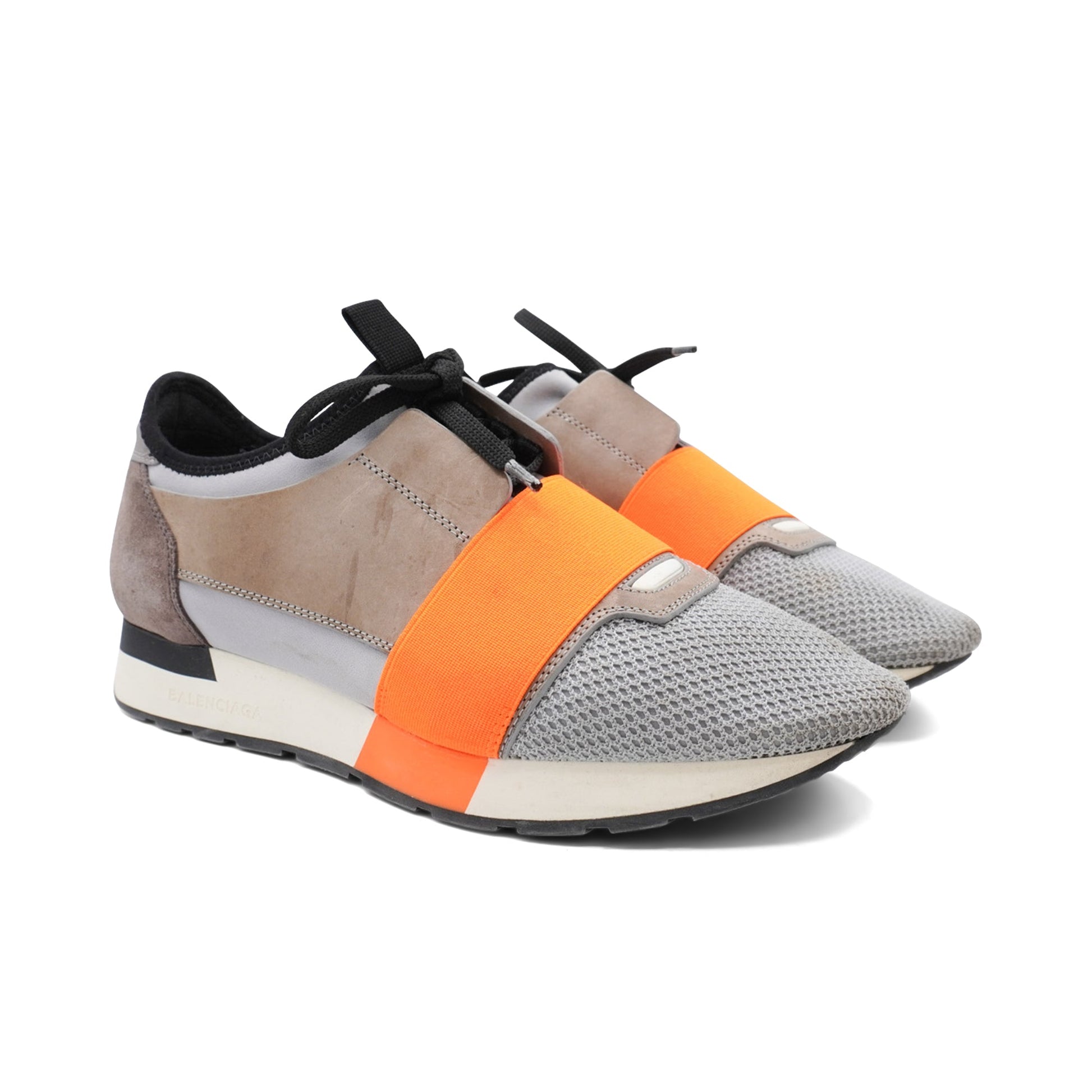Balenciaga 'Tess' sneakers in grey mesh with suede and leather panelling, black laces, and a neon orange strap across the toe.