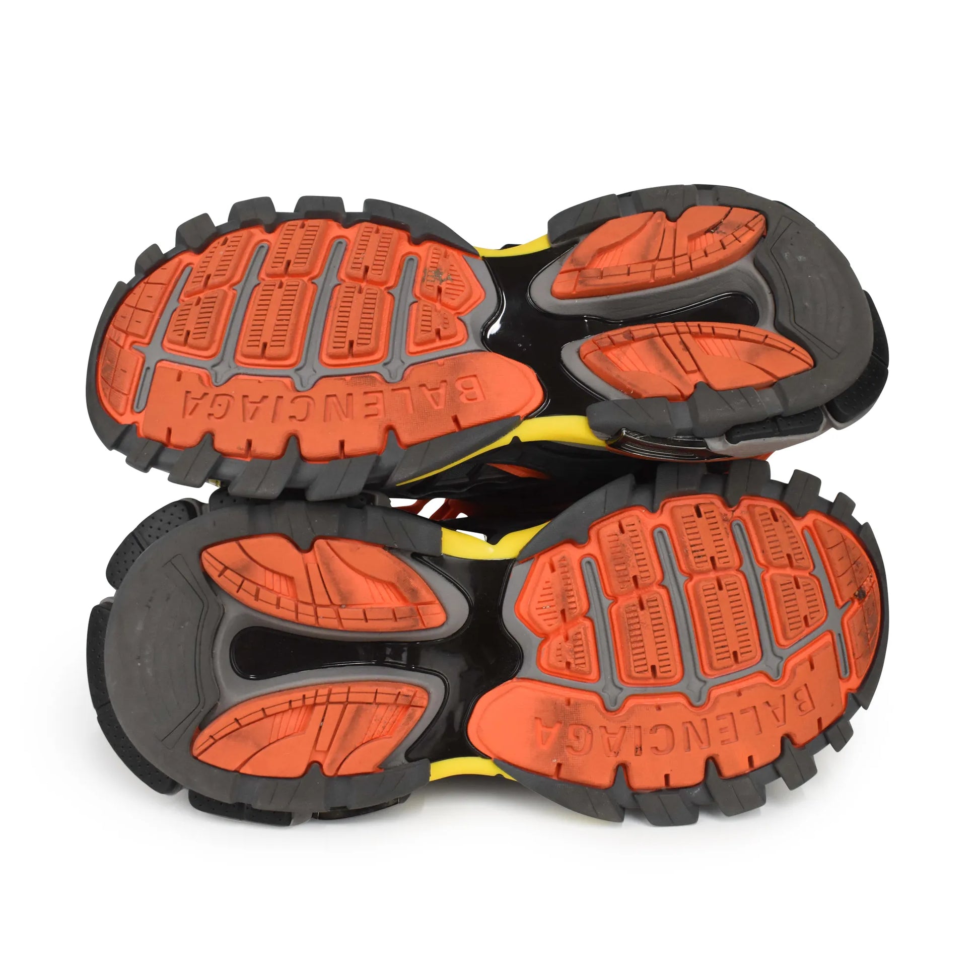 Balenciaga 'Track 2' low-top chunky sneakers in grey, orange, black, and yellow. Features orange round laces, a chunky sole, cutout details, and yellow logo on the tongue.