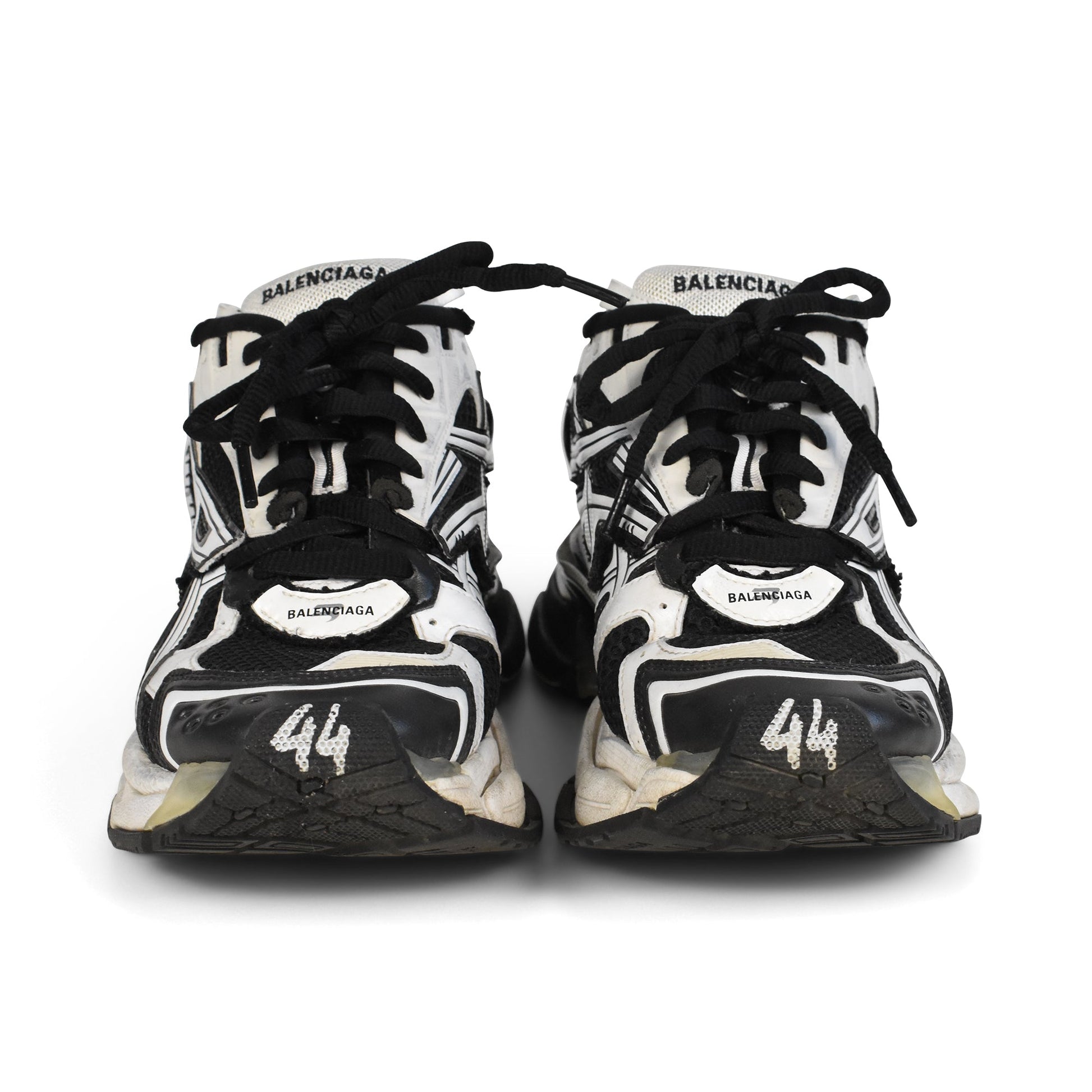 Balenciaga 'Track Runner' chunky sneakers in white rubber and black mesh. Features a spray painted '44' on the toes, double lace-up closure with black laces, and a chunky sole.