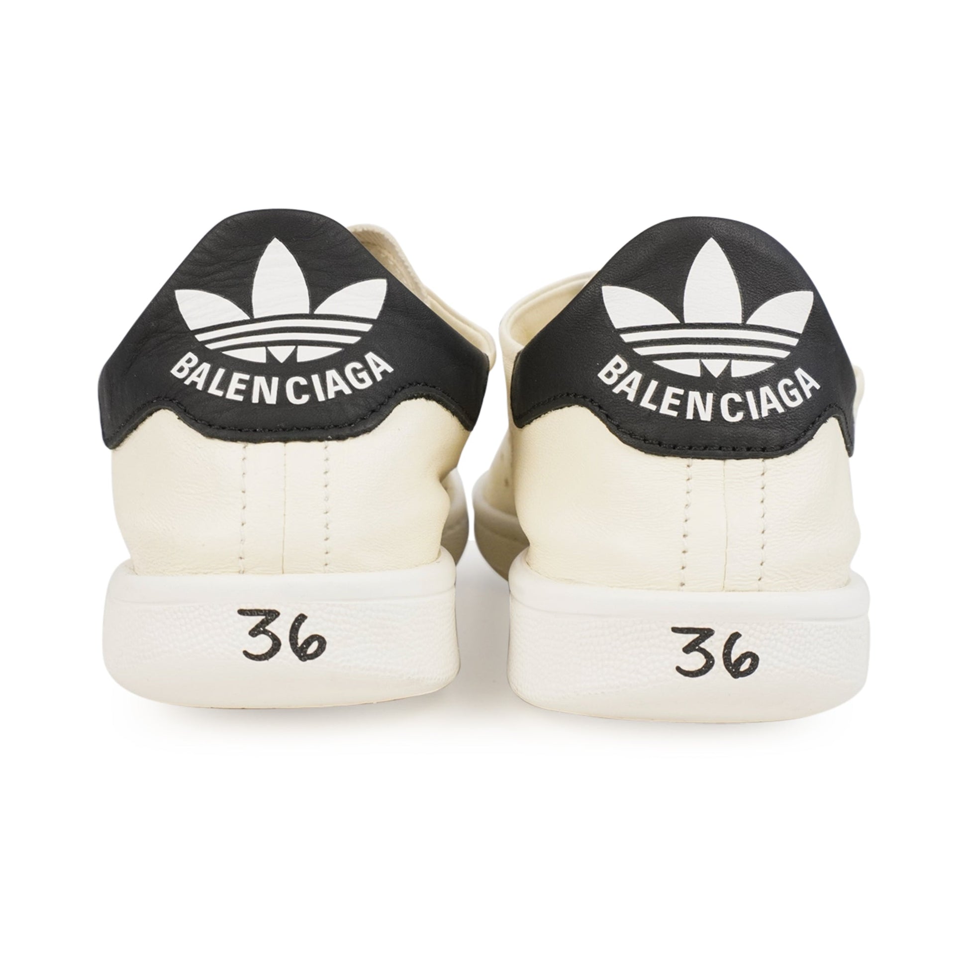 Balenciaga x Adidas Stan Smith low-top sneakers in cream leather with a black detail logo on the crush back heel. Features a lace-up closure and a '36' size logo on the sole.
