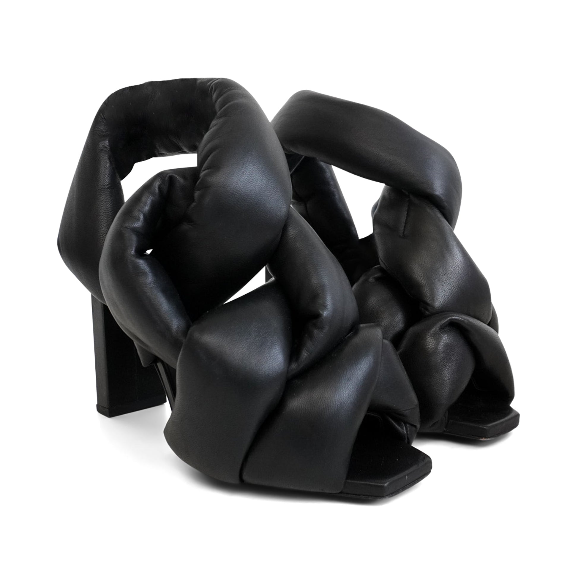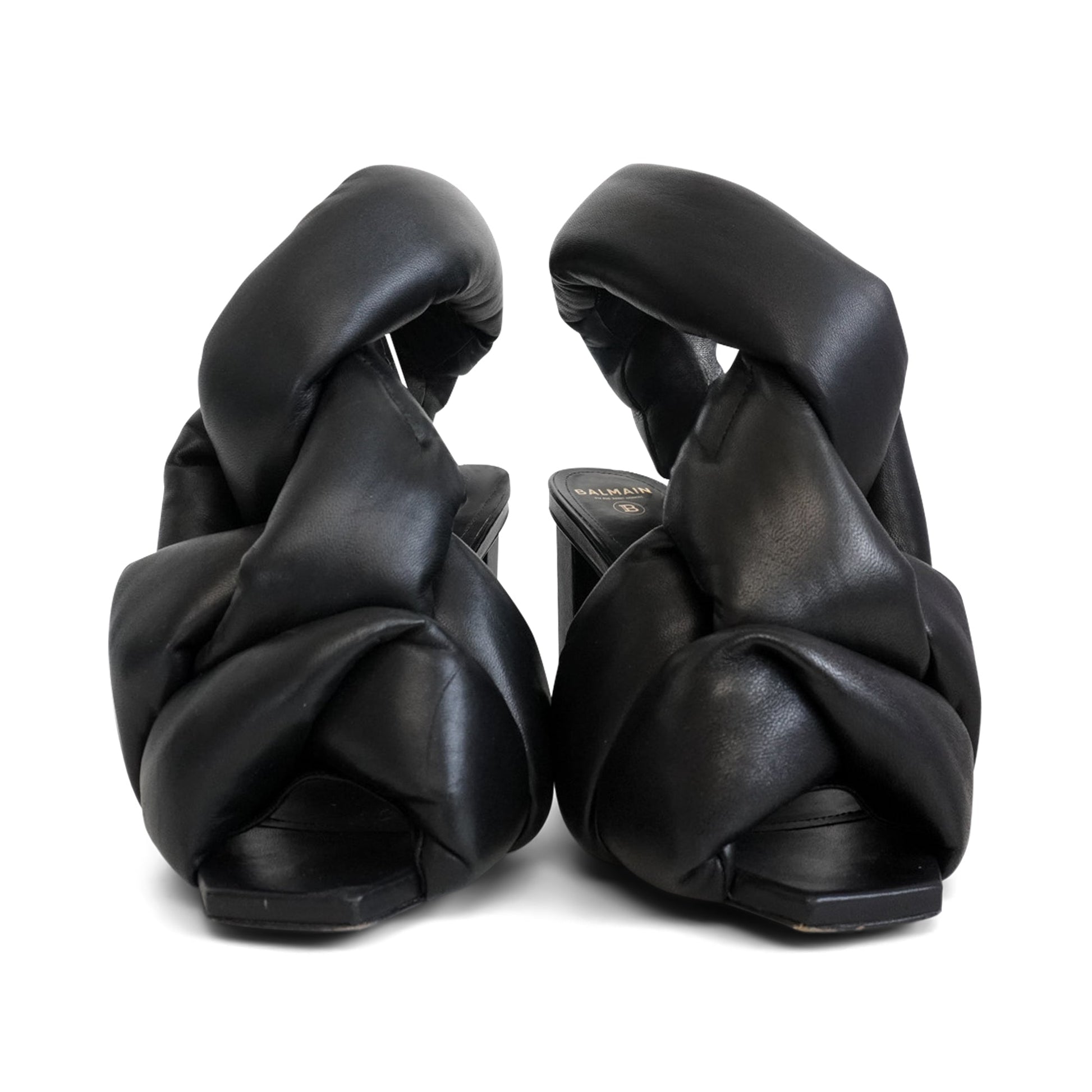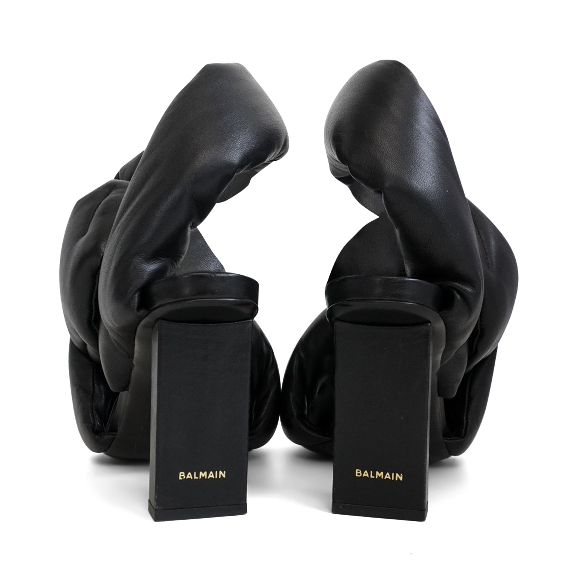 Balmain 'Ulla; heels in black leather with padded crossed straps, a square heel, and a peep-toe.