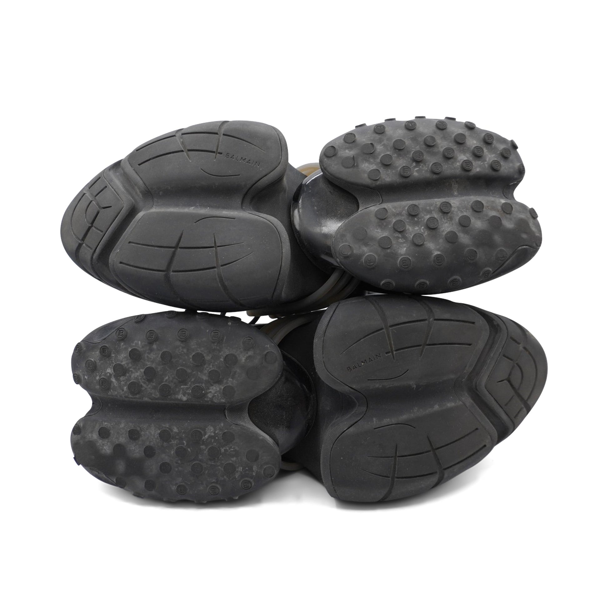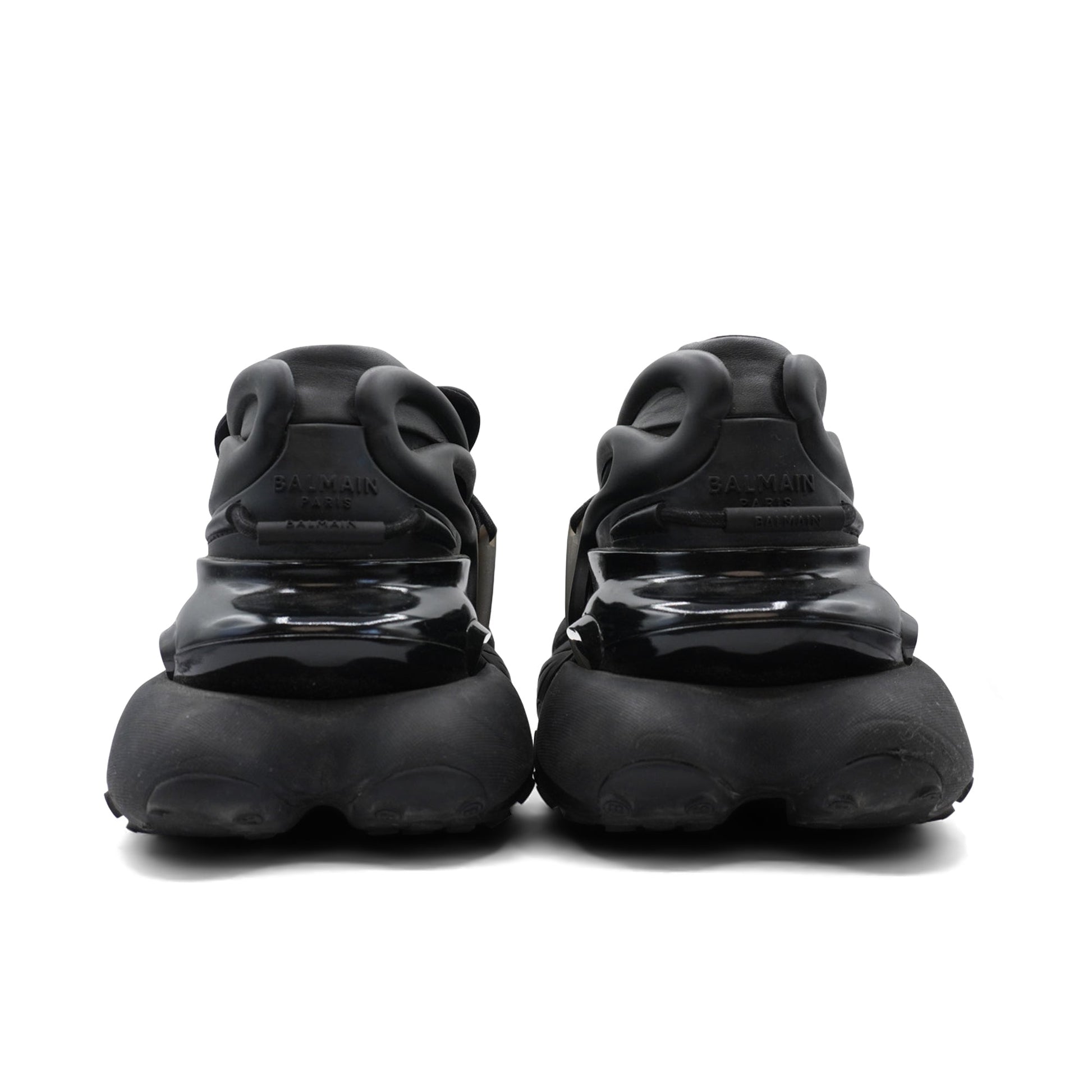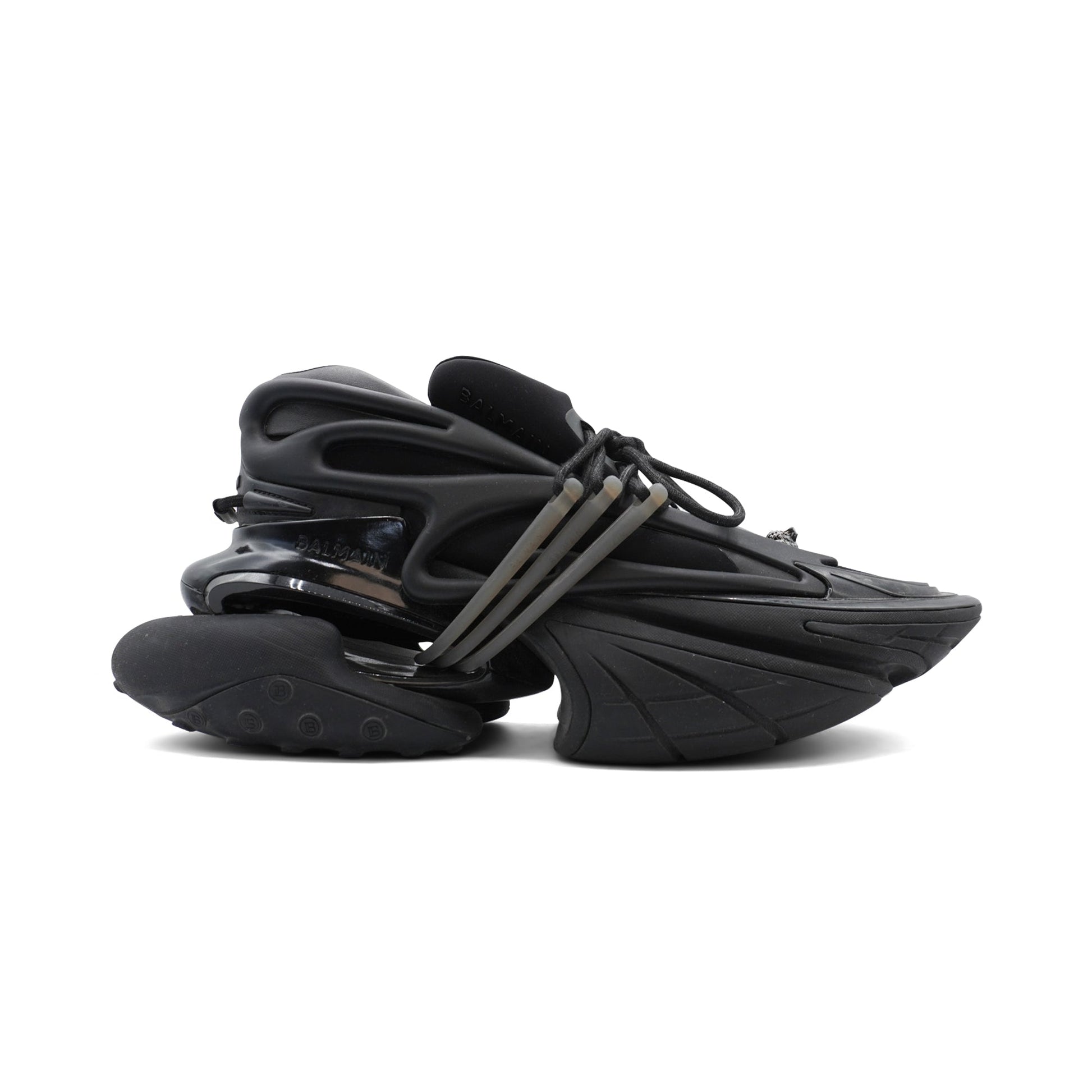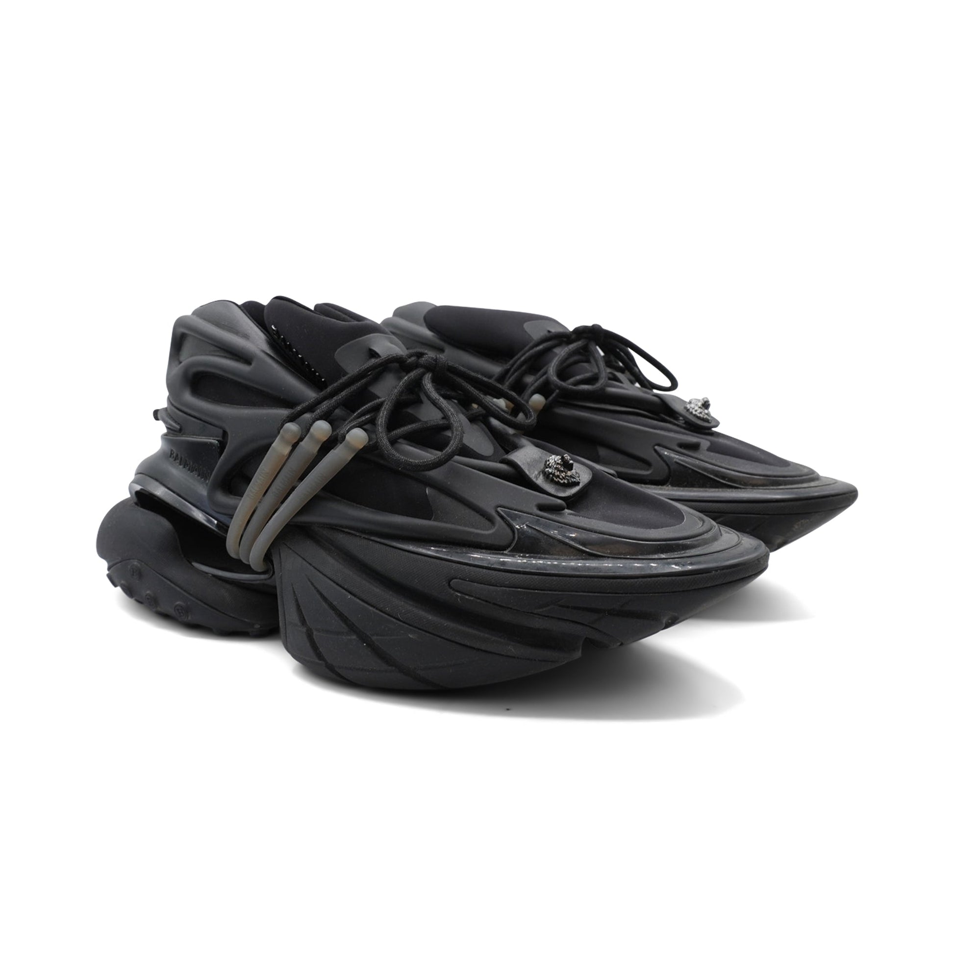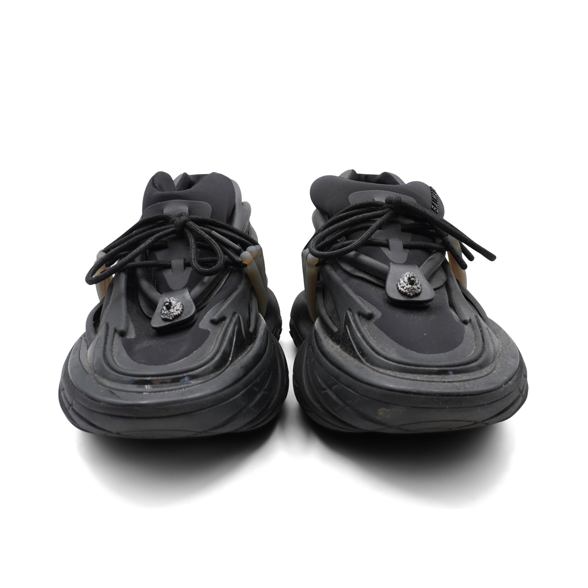Balmain 'Unicorn' sneakers in black neoprene and rubber with a pointed toe, a lion head charm in gunmetal hardware, and a chunky sole.
