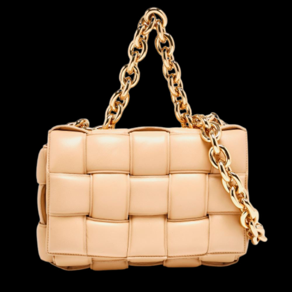 Indulge in the charm of this beige padded leather shoulder bag, a masterpiece from Italy that embodies sophistication. Crafted from luxurious leather, its elegant design is accentuated by an eye catching chunky chain, adding a touch of boldness to its refined silhouette. Ideal for the discerning woman, this handbag seamlessly blends artisan craftsmanship with modern aesthetics, making it a must have accessory for any fashion forward wardrobe. Elevate your style with this exquisite piece, where timeless allure meets contemporary flair. - Good - In good condition with minor wear/marks on exterior/interior, minor scratches on metal.