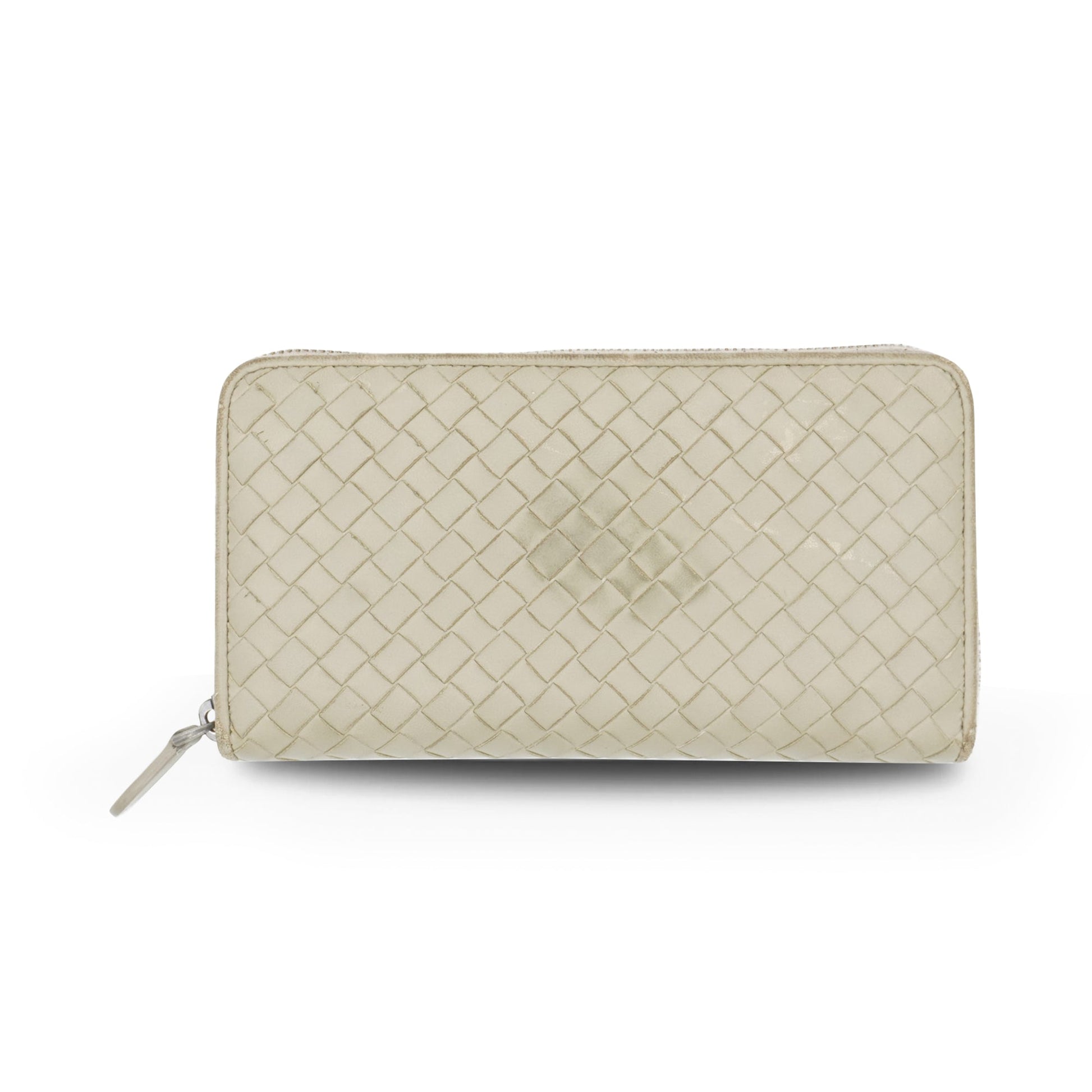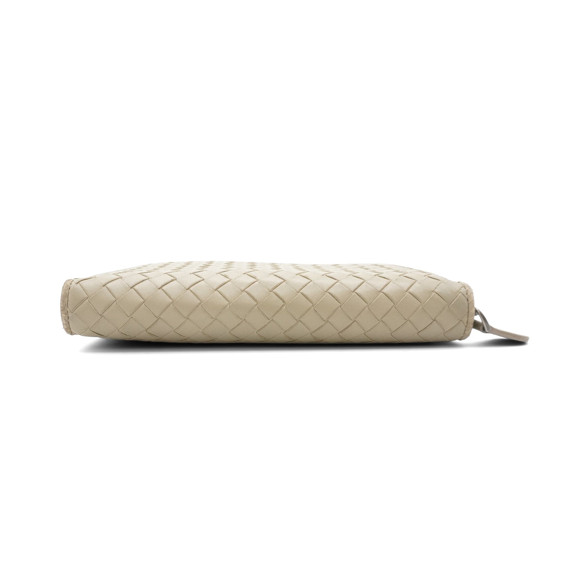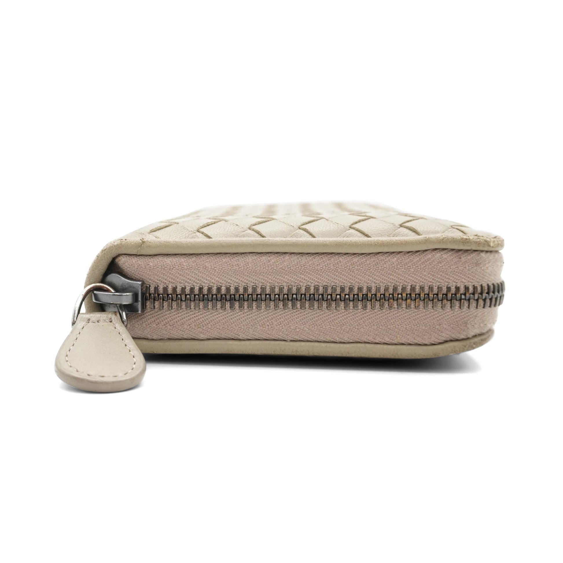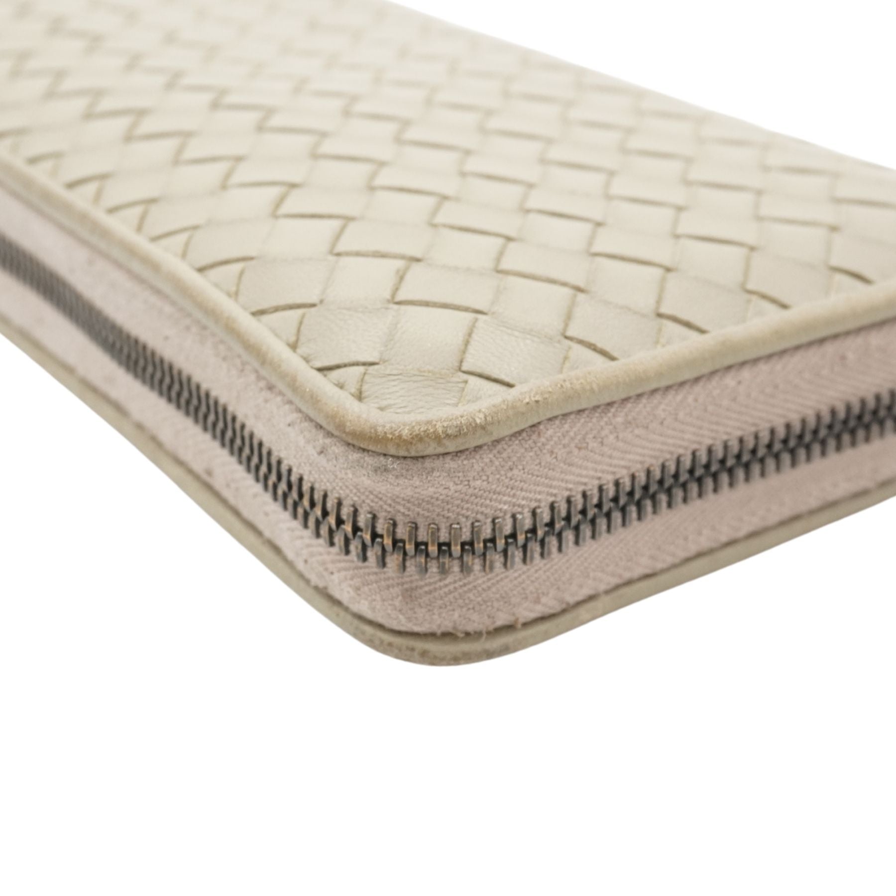 Bottega Veneta continental wallet in beige intrecciato woven leather. Features a zip-around closure, multiple card slots, a cash pocket and a change zip pocket.