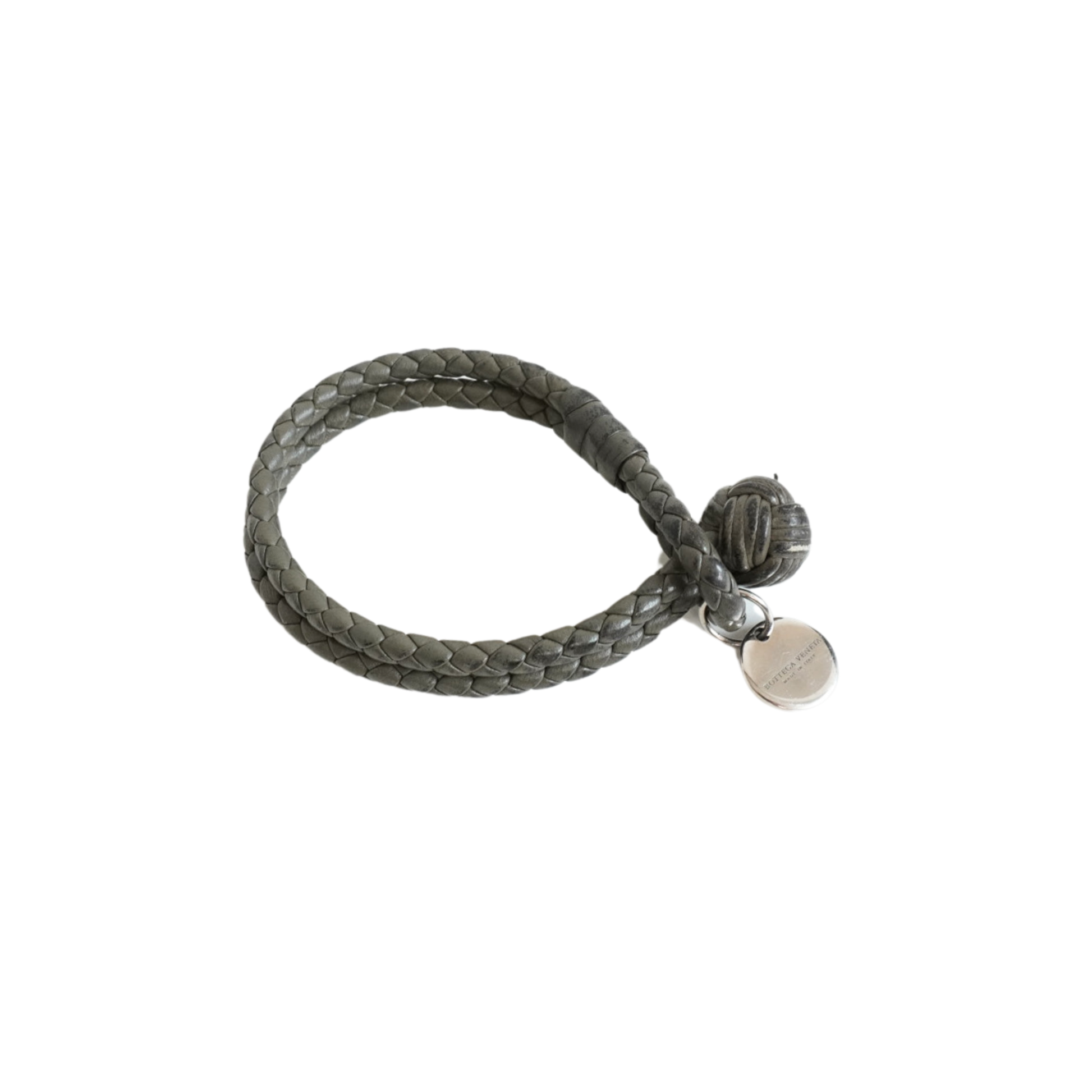 Bottega Veneta 'Intrecciato' double strand woven bracelet in grey nappa leather with a knot toggle closure and a metal logo stamped hanging coin attached on the loop.