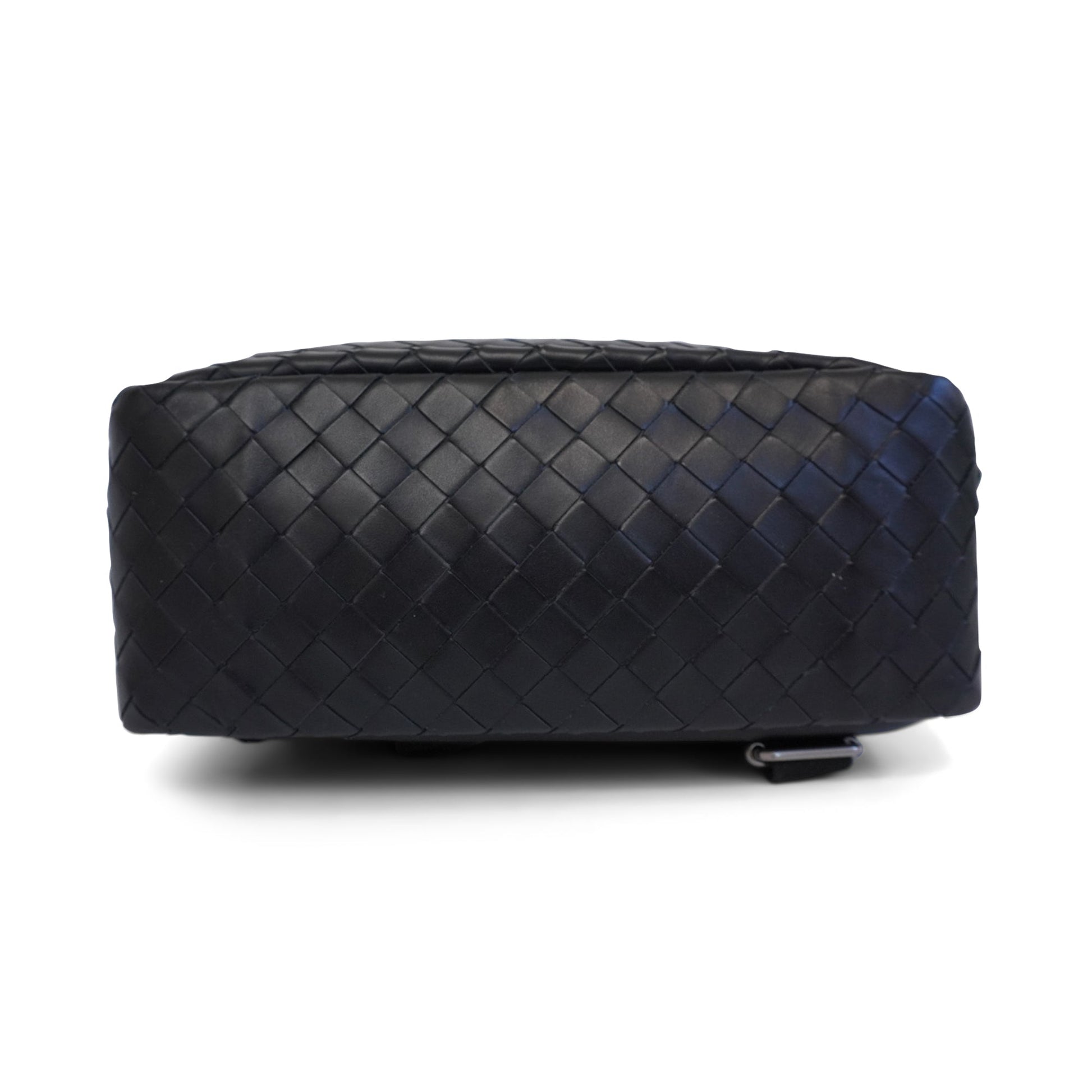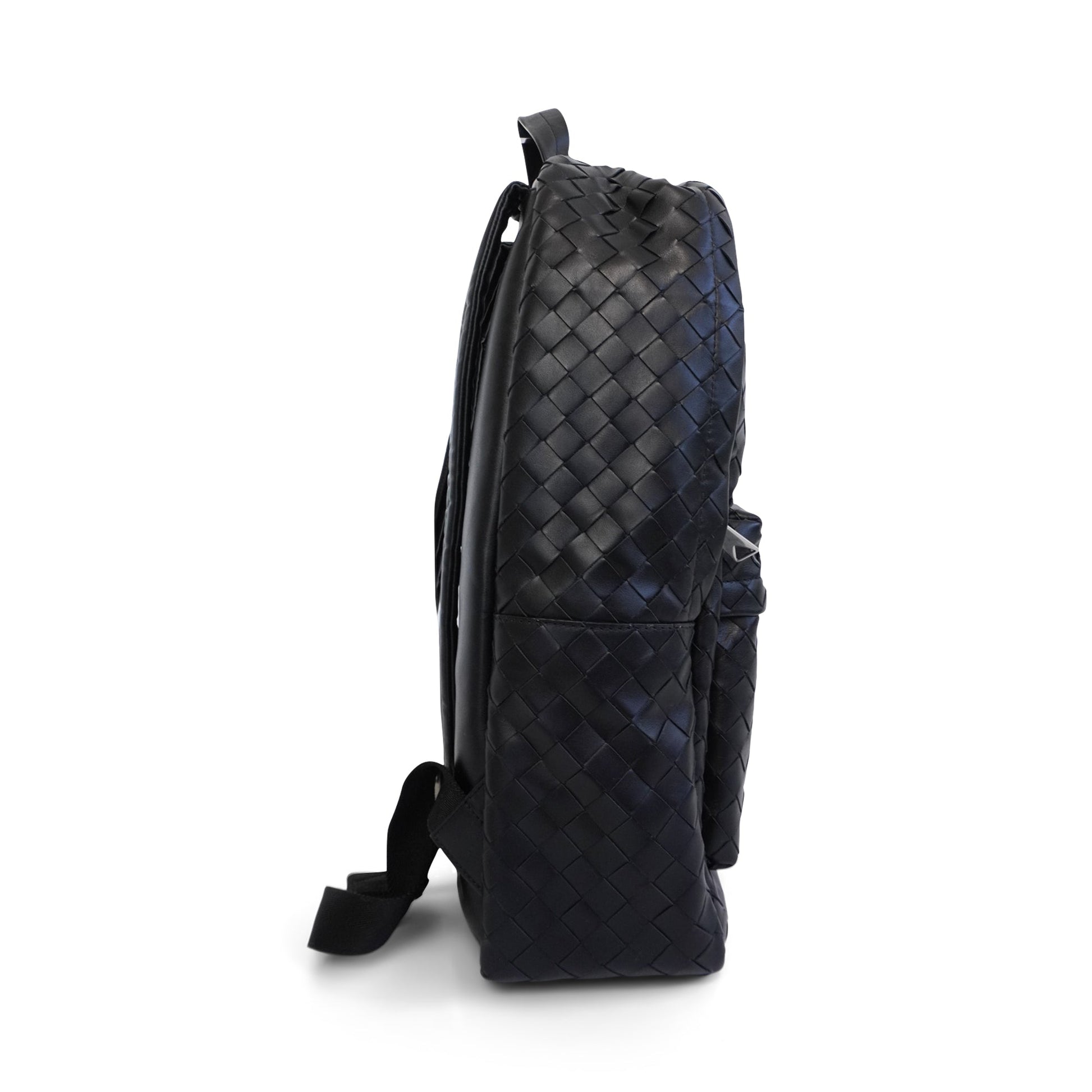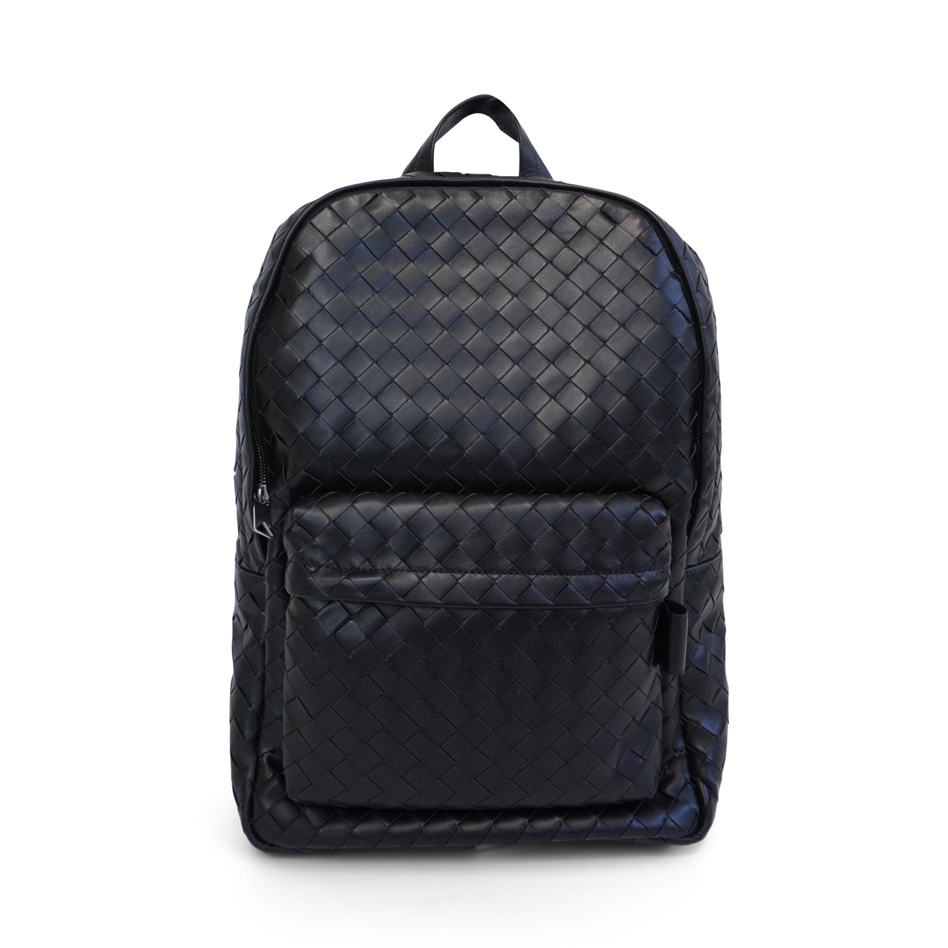 Bottega Veneta backpack in black intrecciato woven leather with silver hardware. Features two zip pockets with black suede lining and an interior sleeve for laptops up to 13", laptops up to 16" can fit in the bag. The bag has a smooth leather back, adjustable leather straps, and a short top handle.