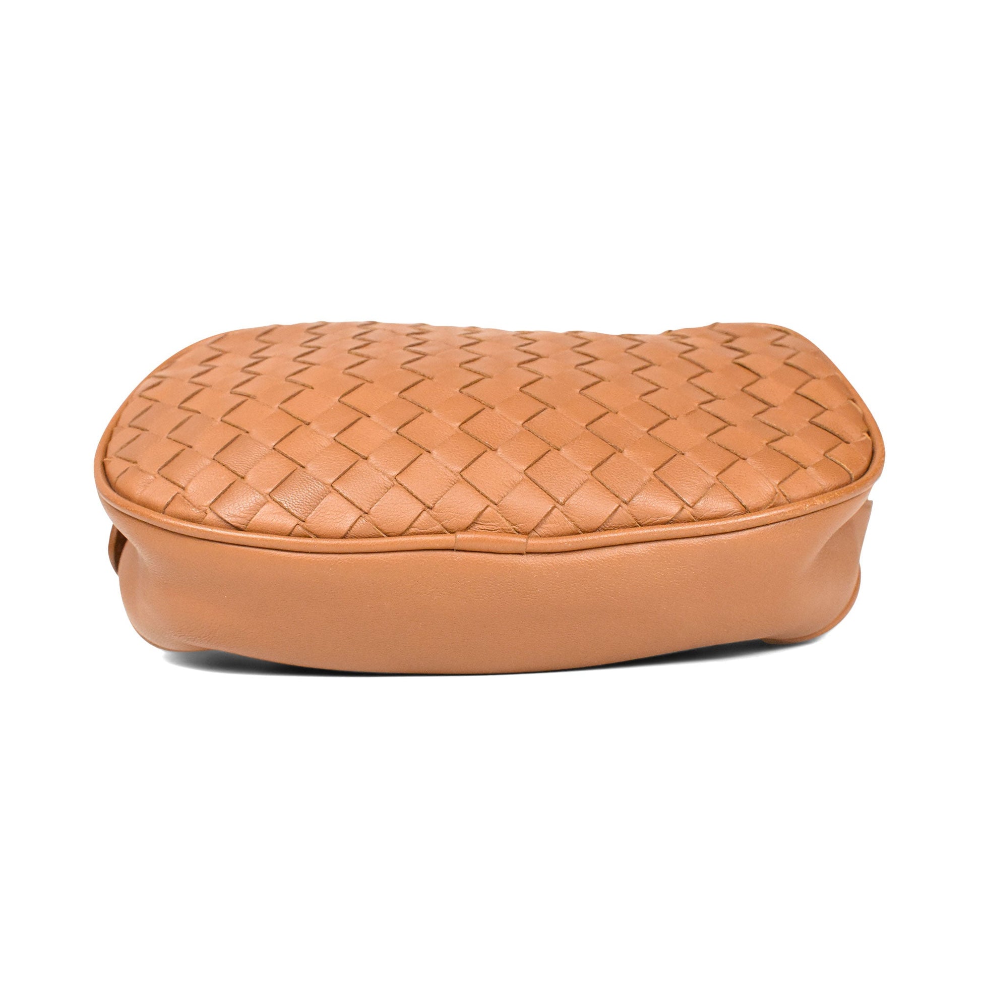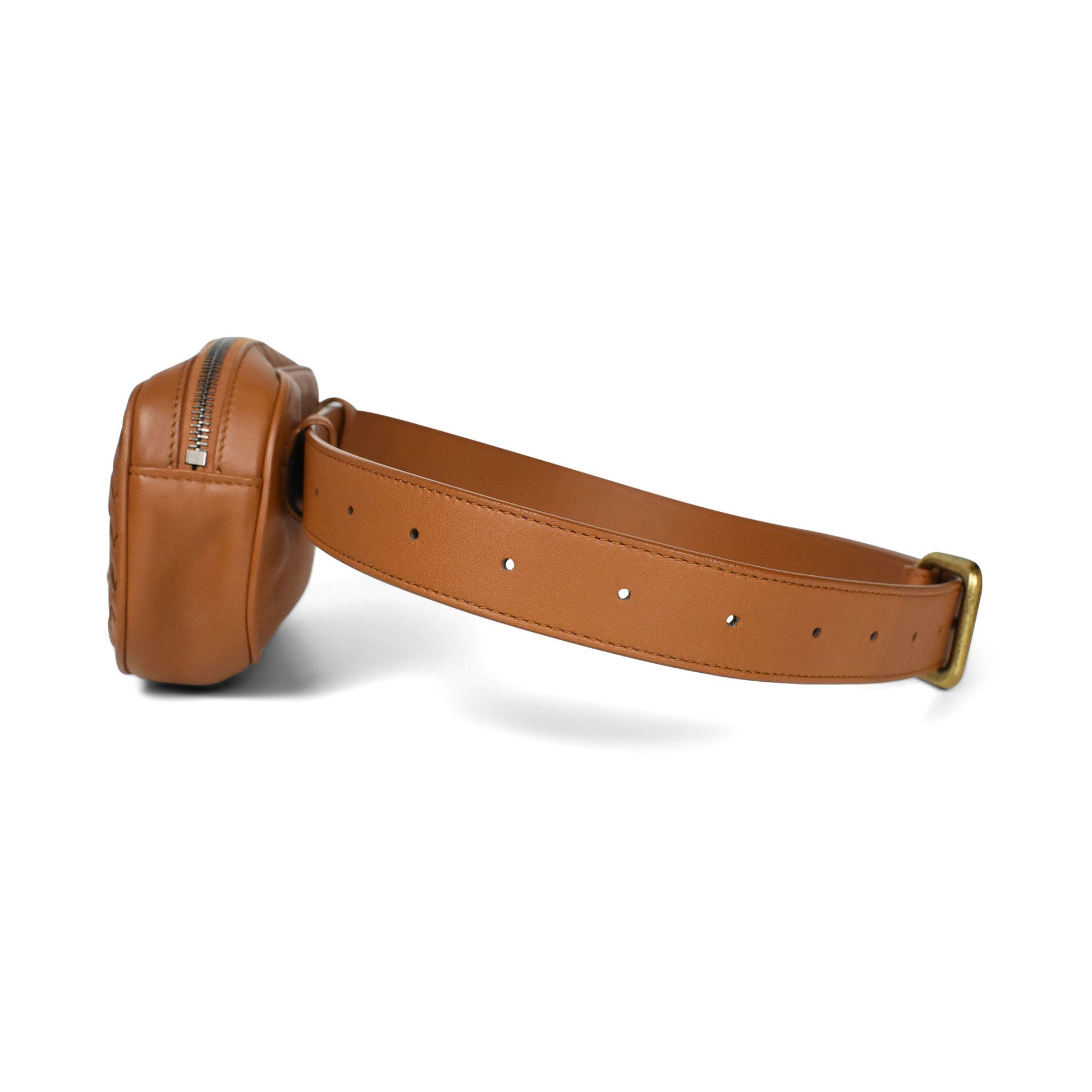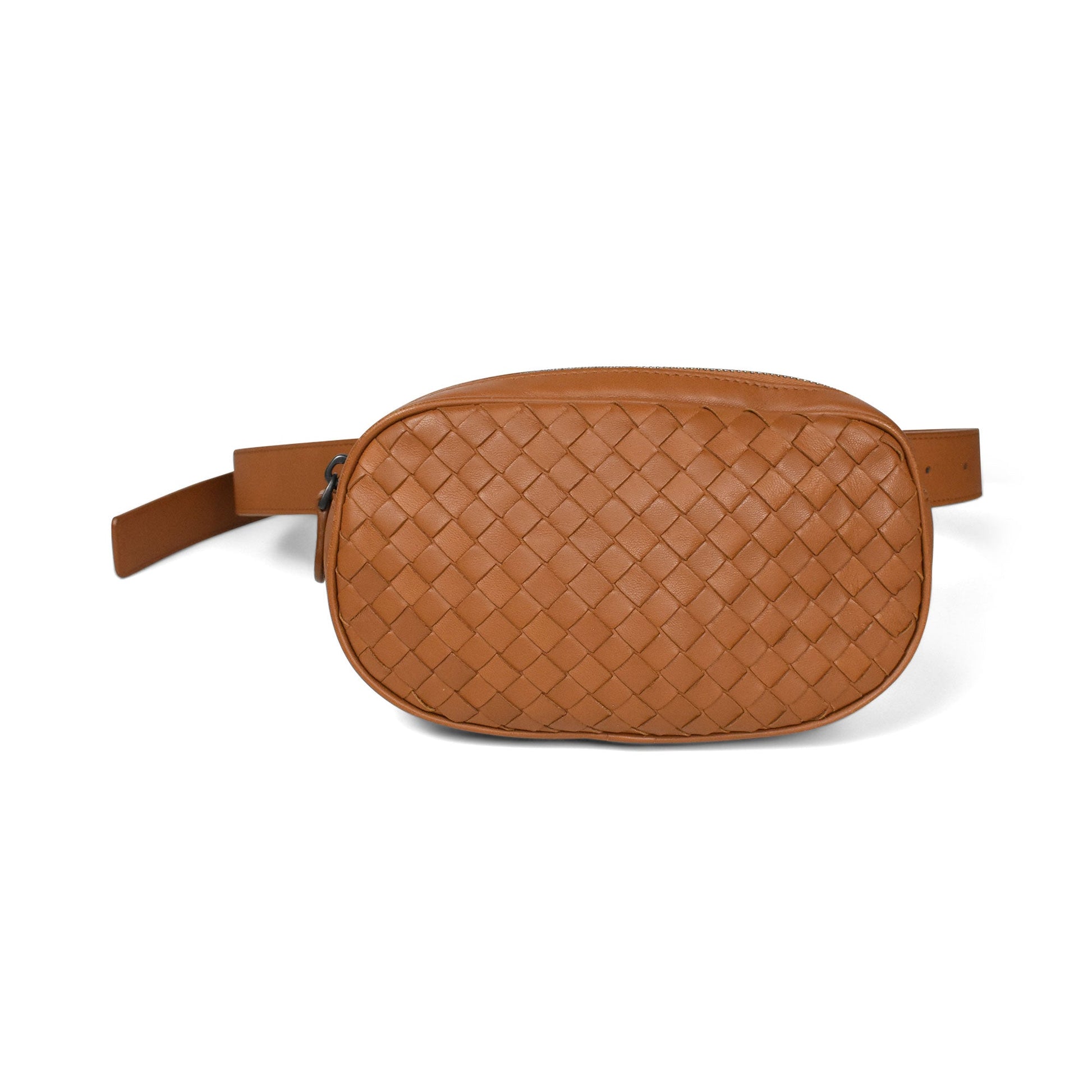 Bottega Veneta intrecciato woven bumbag in tan leather with gold hardware zip closure. Features a removable and adjustable belt strap with a gold square buckle. The interior features light brown suede lining with a snap-button pocket.
