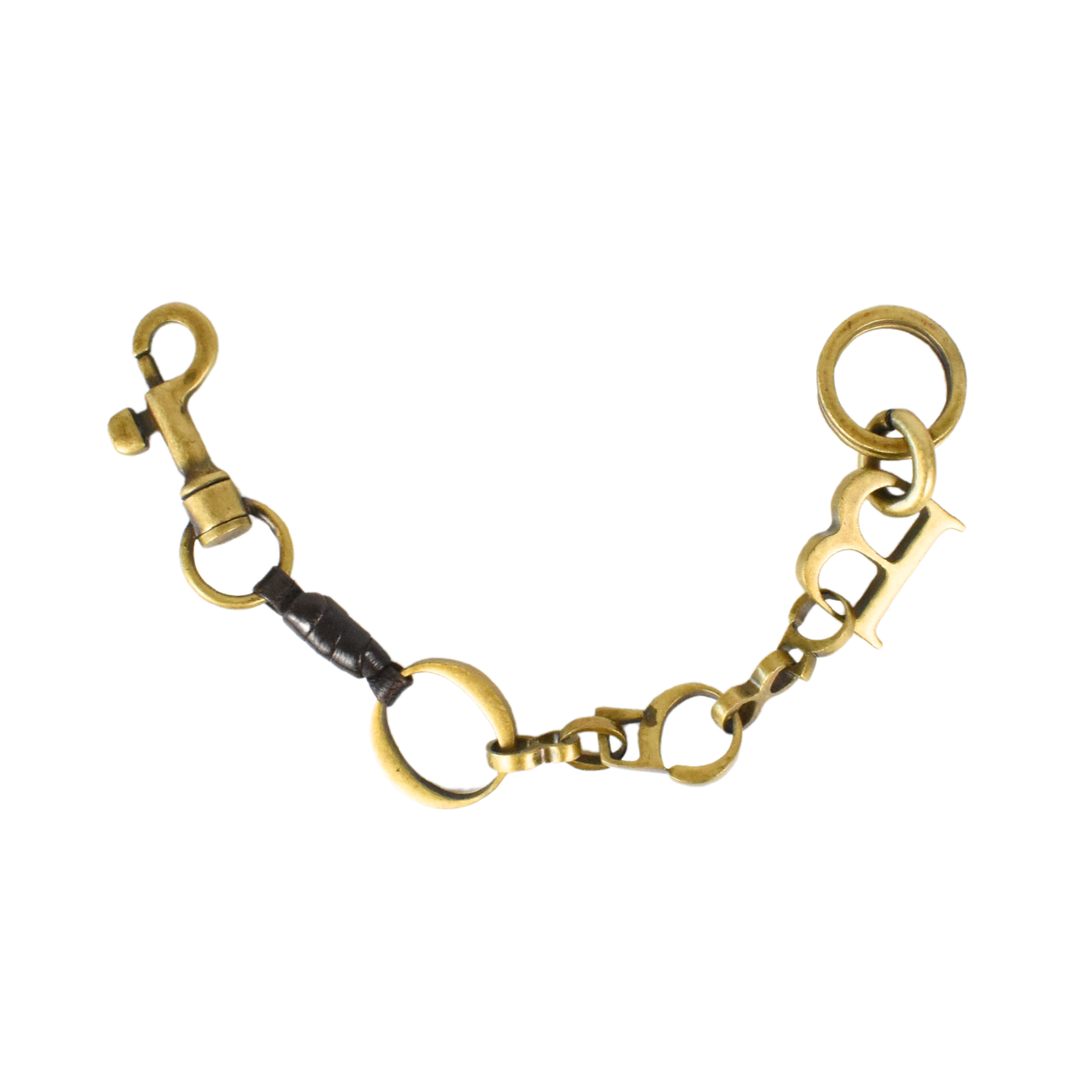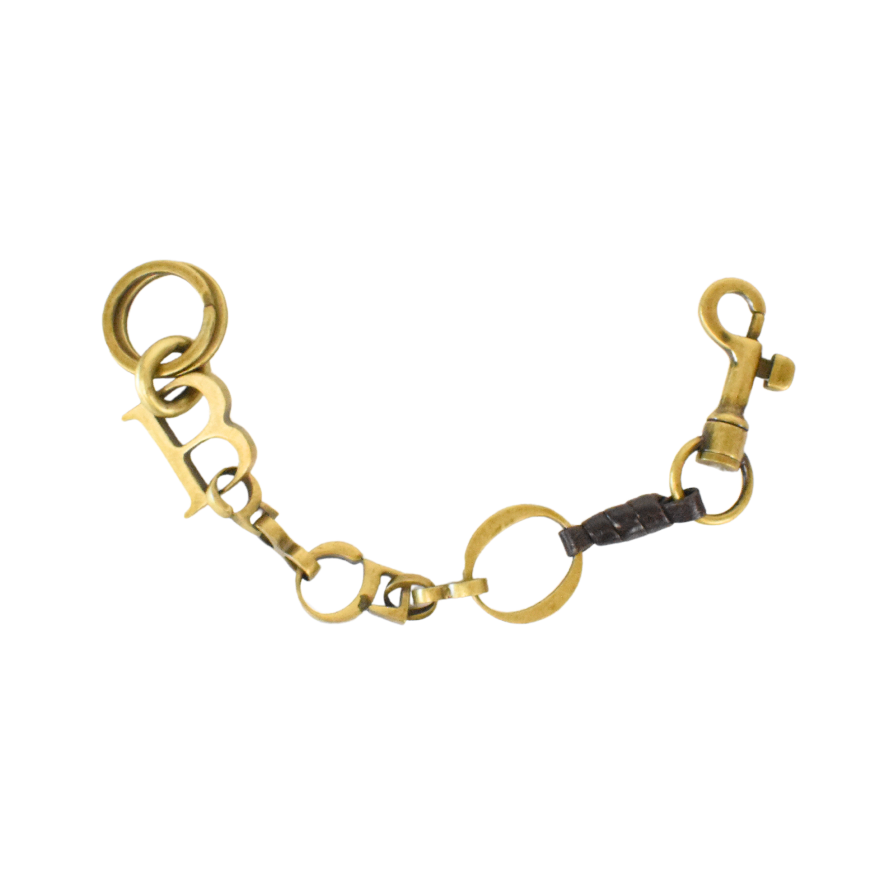 Bottega Veneta keychain in aged gold hardware with brown leather wrap detail. Features 'B' and 'O' charms, a spring clasp on one side, and a double o-ring on the other.