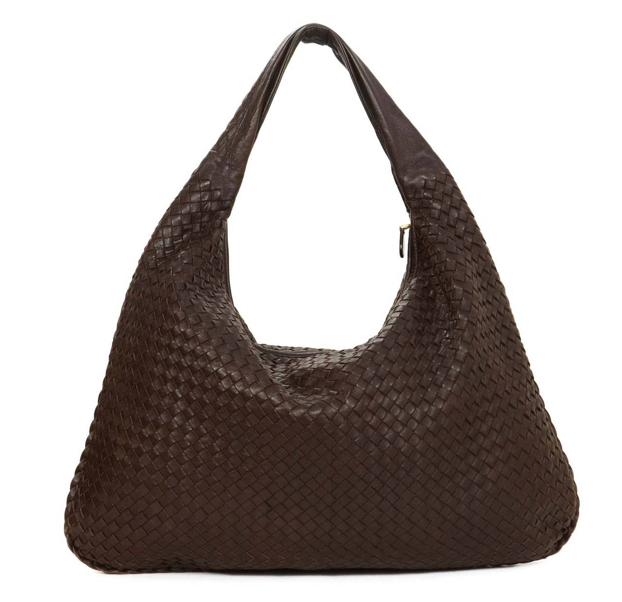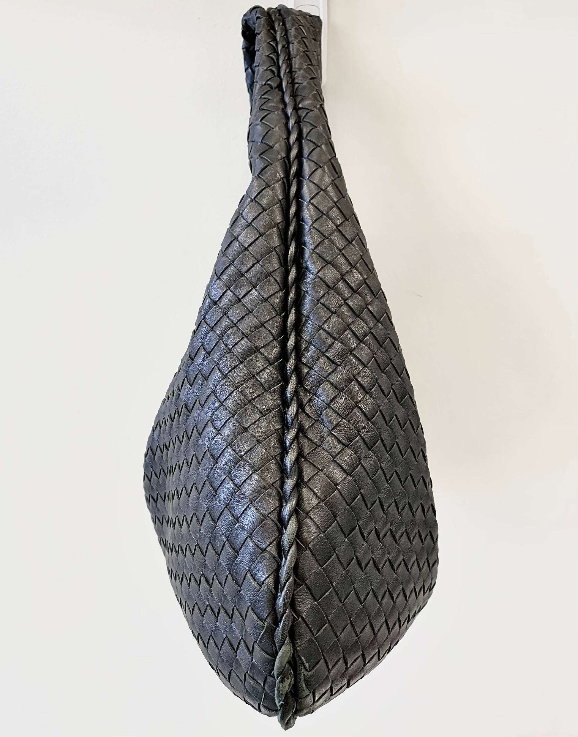 This hobo-style bag is crafted of tightly woven black leather with a matching looping shoulder strap. The top zipper opens the bag to a beige suede interior with a zipper and flat pocket. Dust bag included.