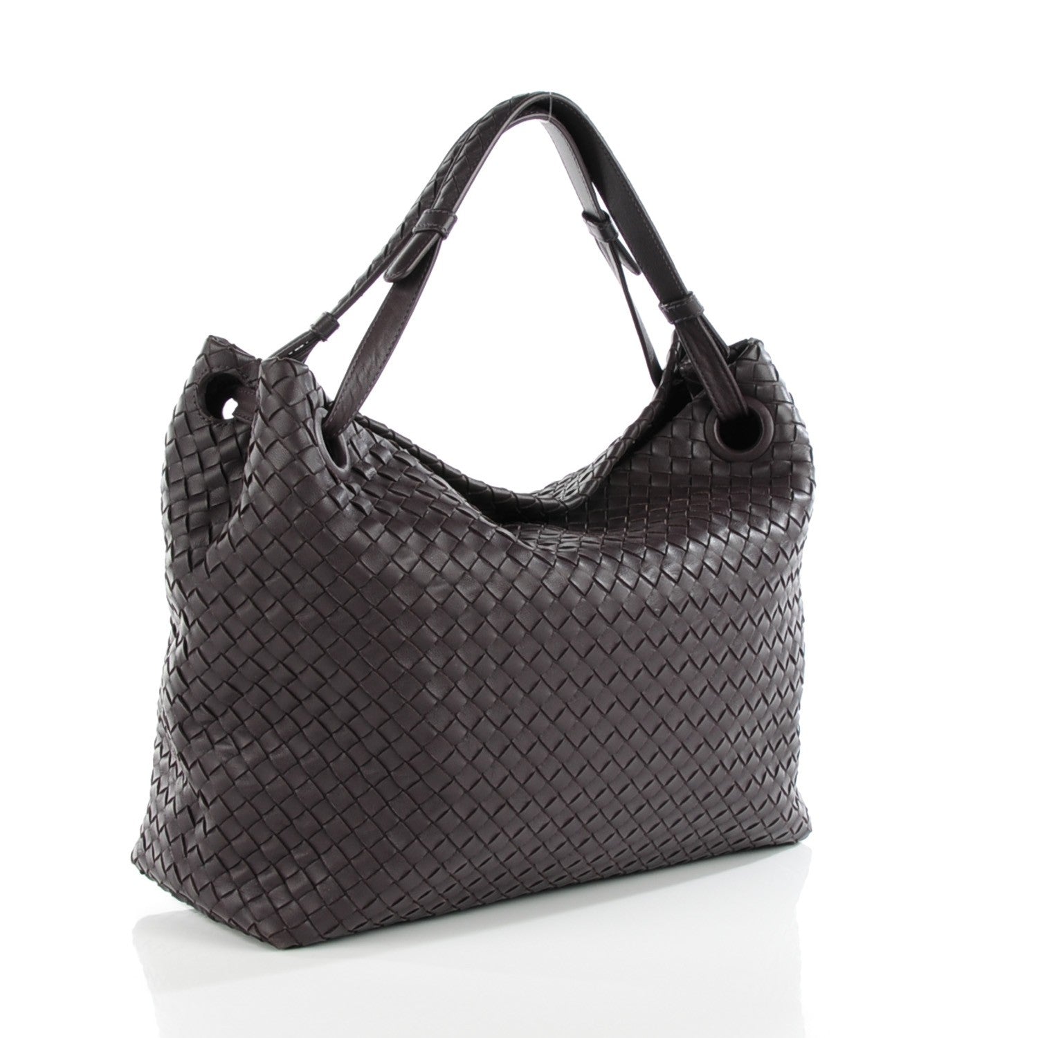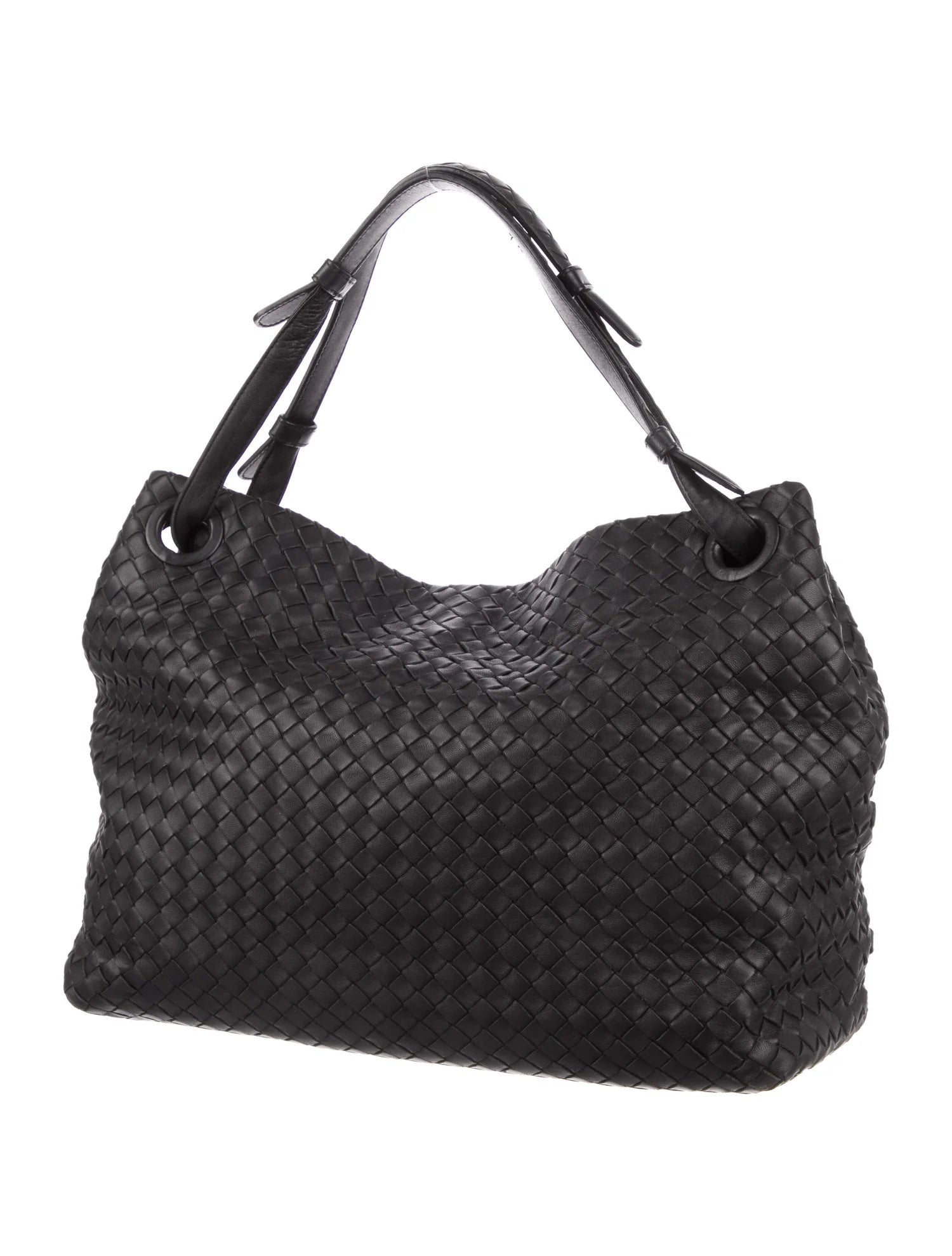 Features Bottega's Signature woven leather with comfortable flat leather handles and enough space to hold all your daily essentials.