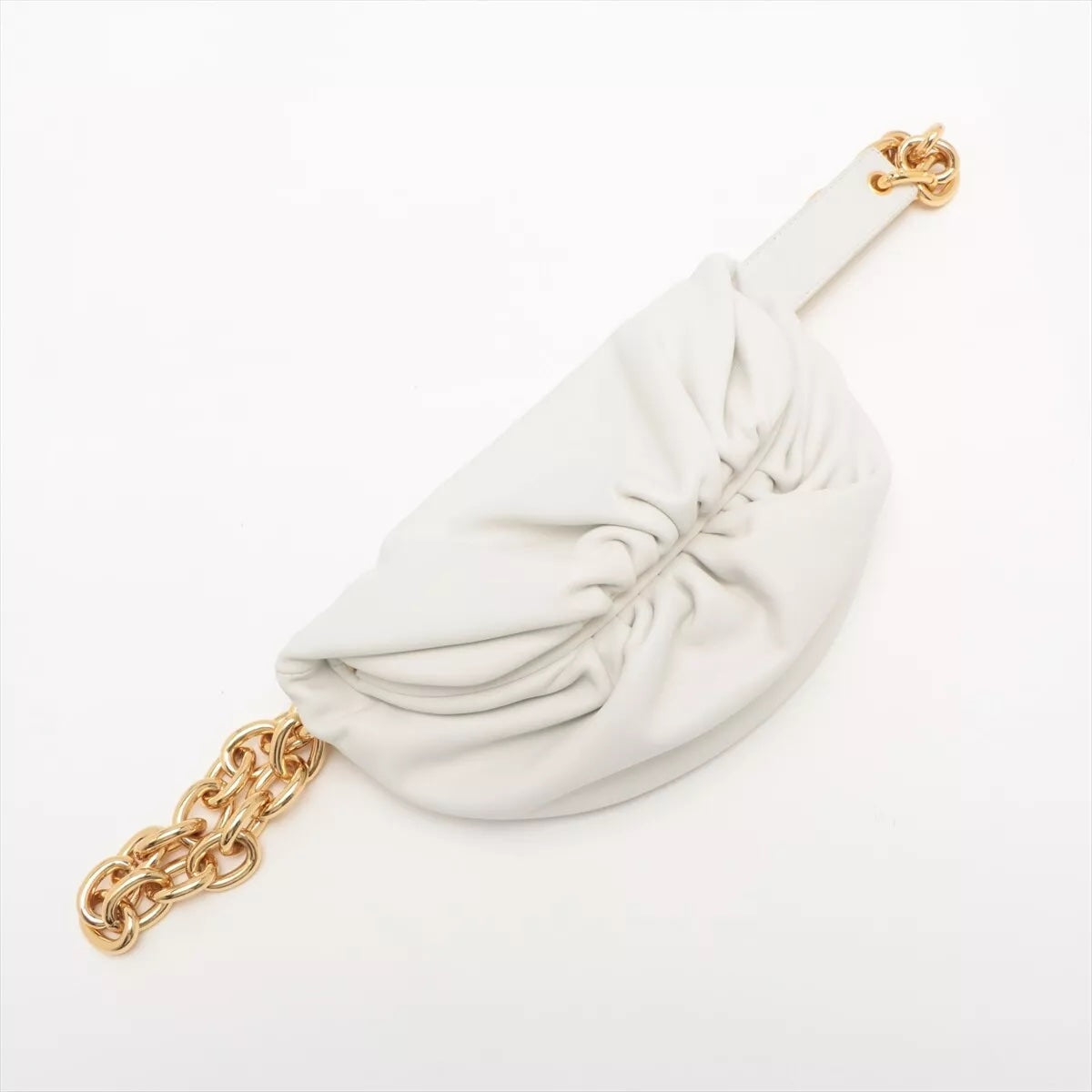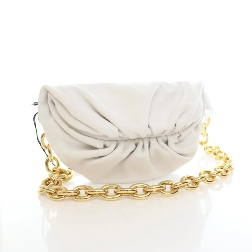 This Stunning Pouch Bag is Crafted of supple Nappa leather in white, with a Gold chain strap that can be worn on the shoulder or waist.